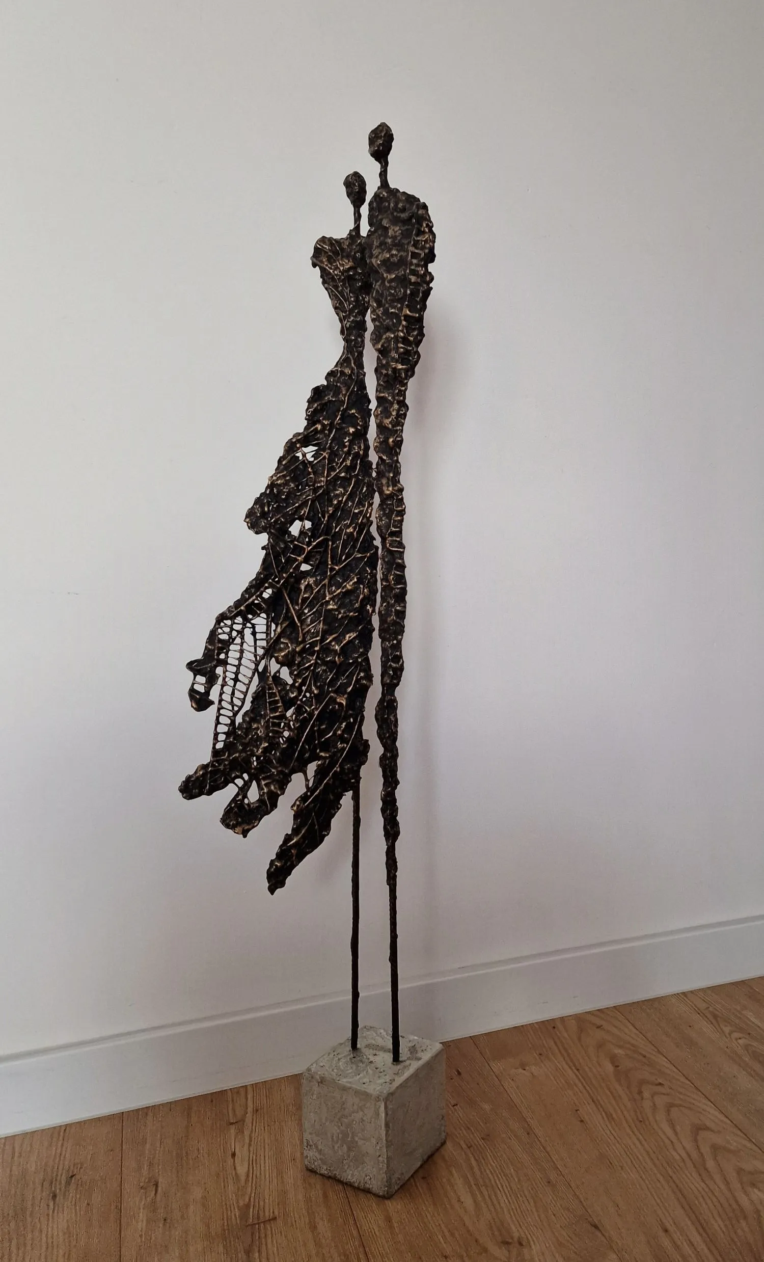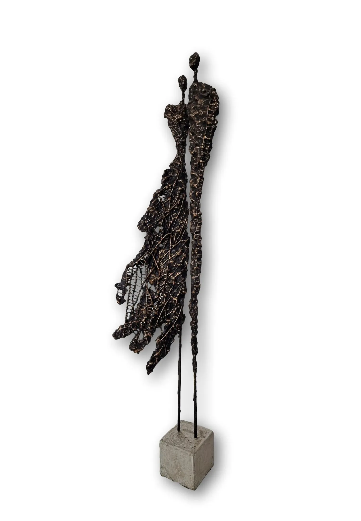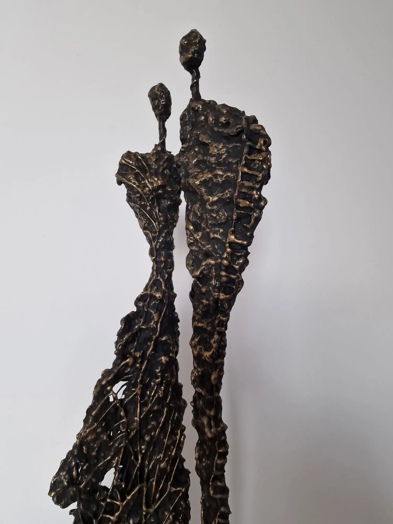 Inspiracją dla tego wyjątkowej rzeźby są obrazy i grafiki z mojej kolekcji Point od Balance. Zaczerpnięty z nich motyw kamiennych postaci, przeniesiony do formy przestrzennej, dodając rzeźbie głębi i znaczenia. Biomorficzne kształty rzeźby, nawiązujące do ludzkich sylwetek, wyrażają emocje i relacje, jakie łączą nas z innymi. Surowość materiałów została złagodzona przez plastyczność gliny i masy z sproszkowanego kamienia, tworząc harmonijną całość.