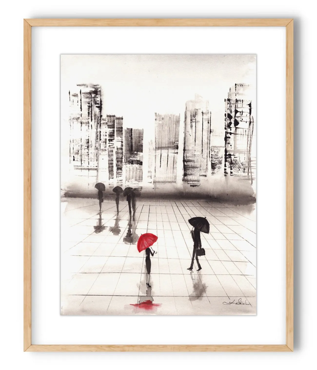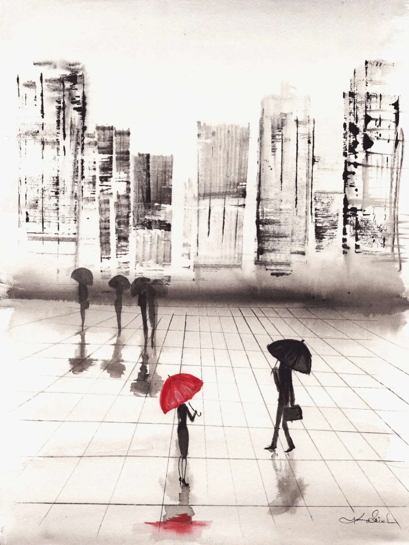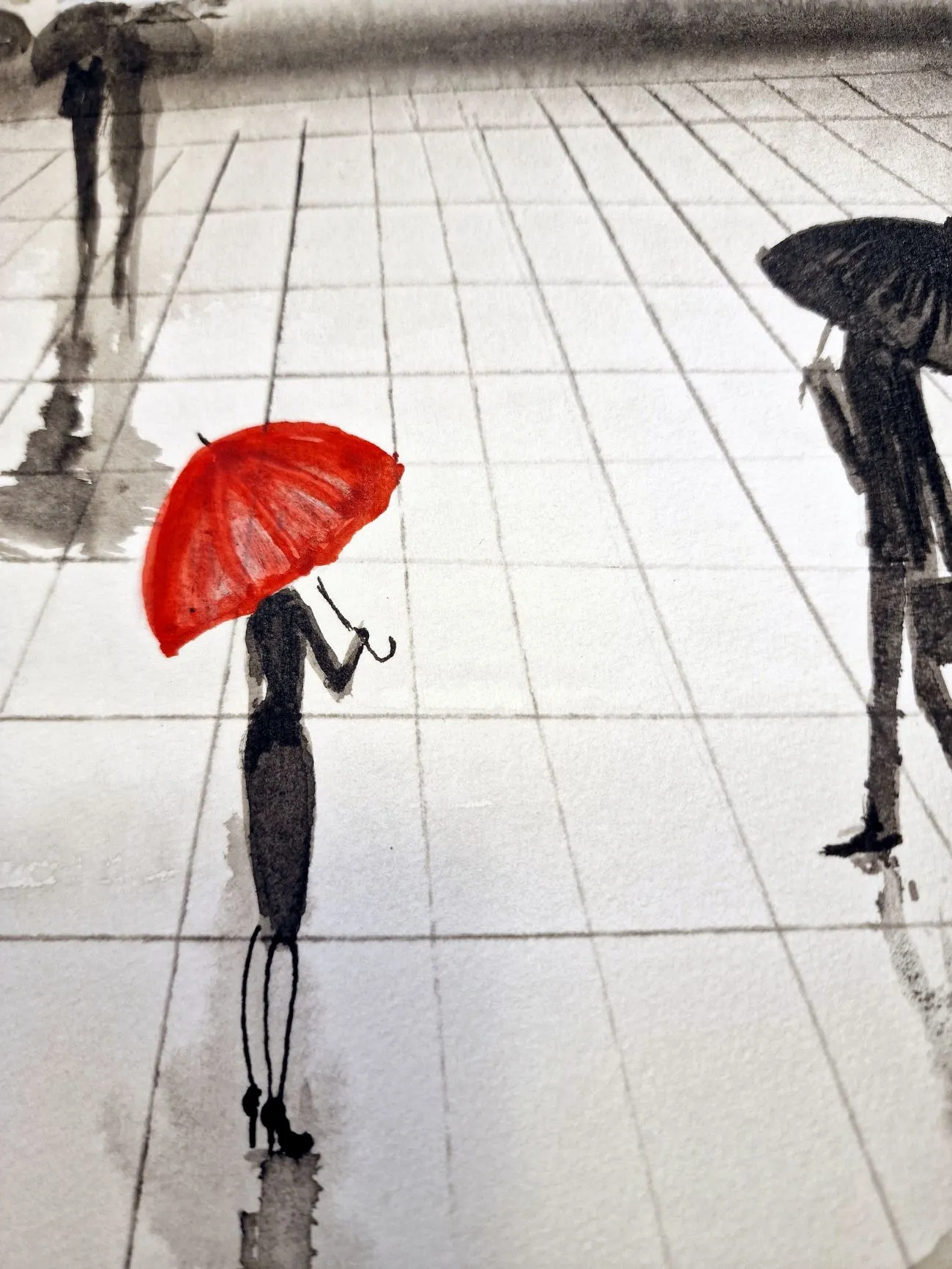 Ręcznie malowana akwarela, która przedstawia migawkę z miejskiego życia, wypełnionego deszczem i anonimowymi postaciami. W centrum uwagi znajduje się subtelna interakcja między dwiema osobami, z których jedna trzyma intensywnie czerwony parasol, wyróżniający się na tle monochromatycznego krajobrazu. Obraz oddaje uczucie samotności w tłumie, ale także przypadkowych spotkań. Rozmyte budynki i odbicia w kałużach nadają scenie poetyckiej, niemal nostalgicznej atmosfery, czyniąc ją idealnym akcentem do wnętrz pełnych refleksji.