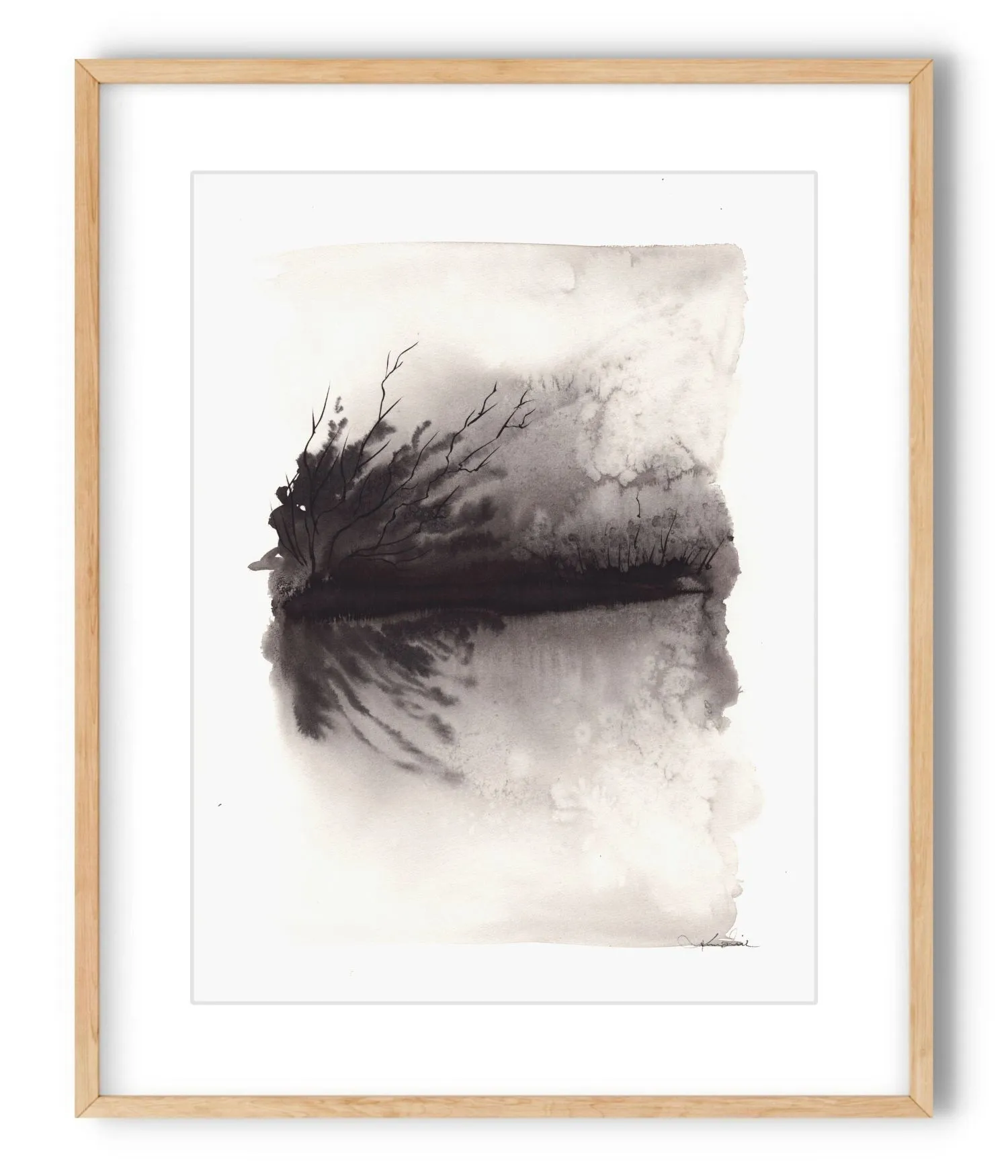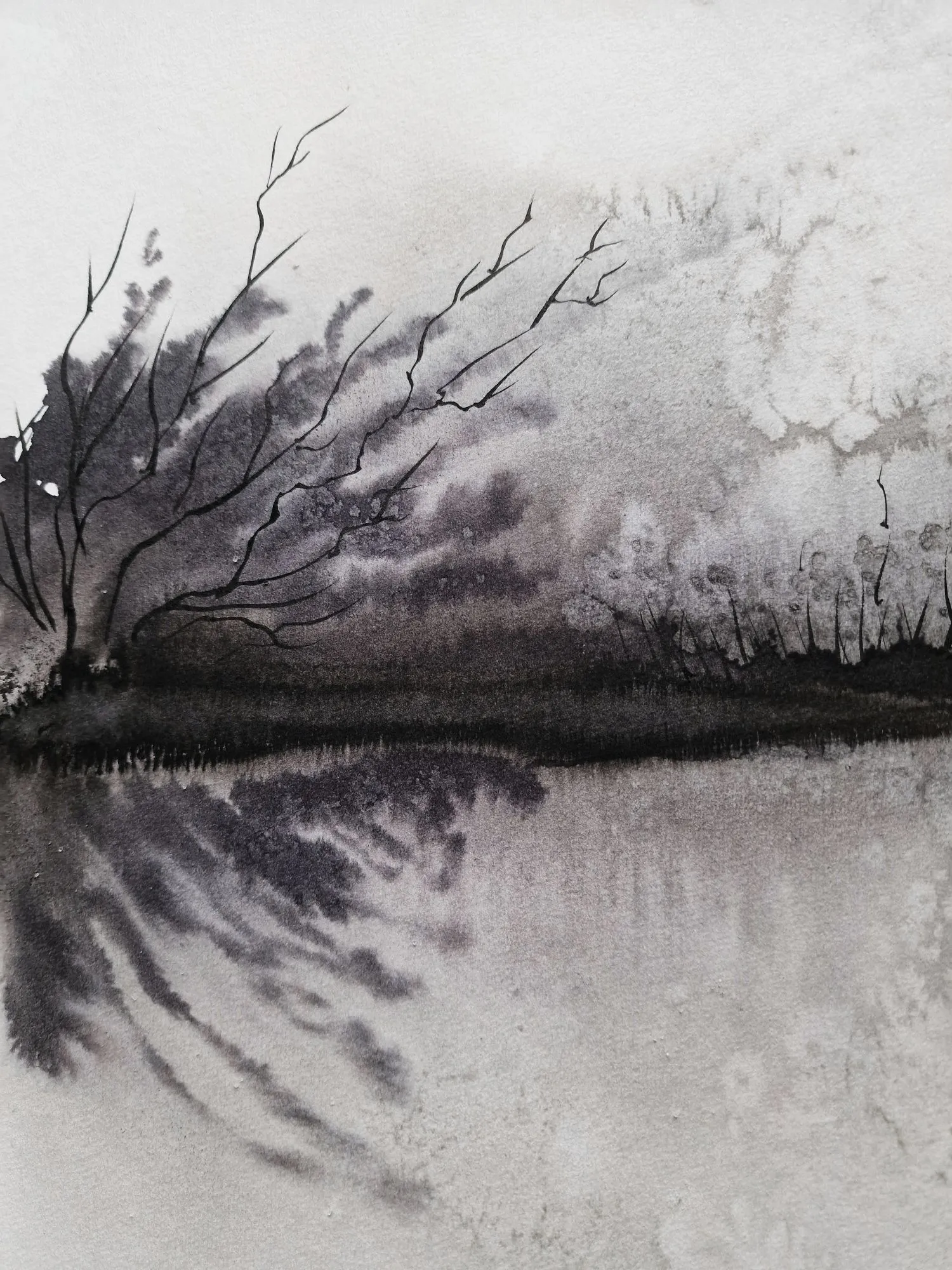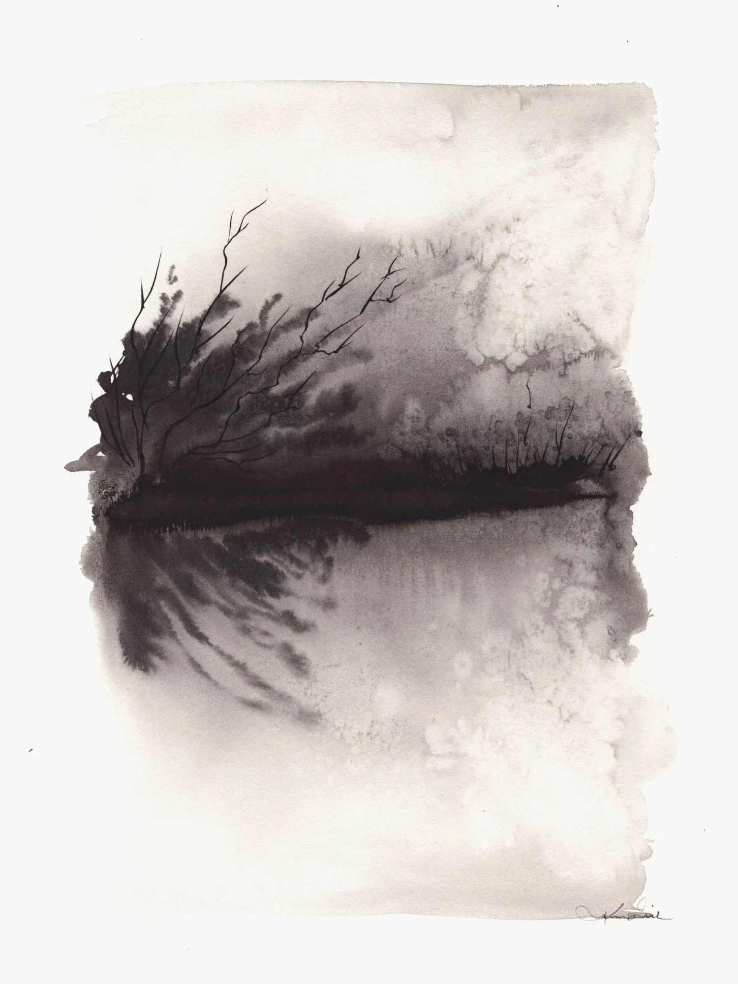 Ta czarno-biała akwarela 30x40 cm autorstwa Krystyny Siwek to subtelny pejzaż, który łączy w sobie ciszę natury i elegancję prostoty. Cienkie gałęzie wychylające się nad wodą, delikatne odbicia i rozmycia tworzą hipnotyzujący efekt spokoju i refleksji.