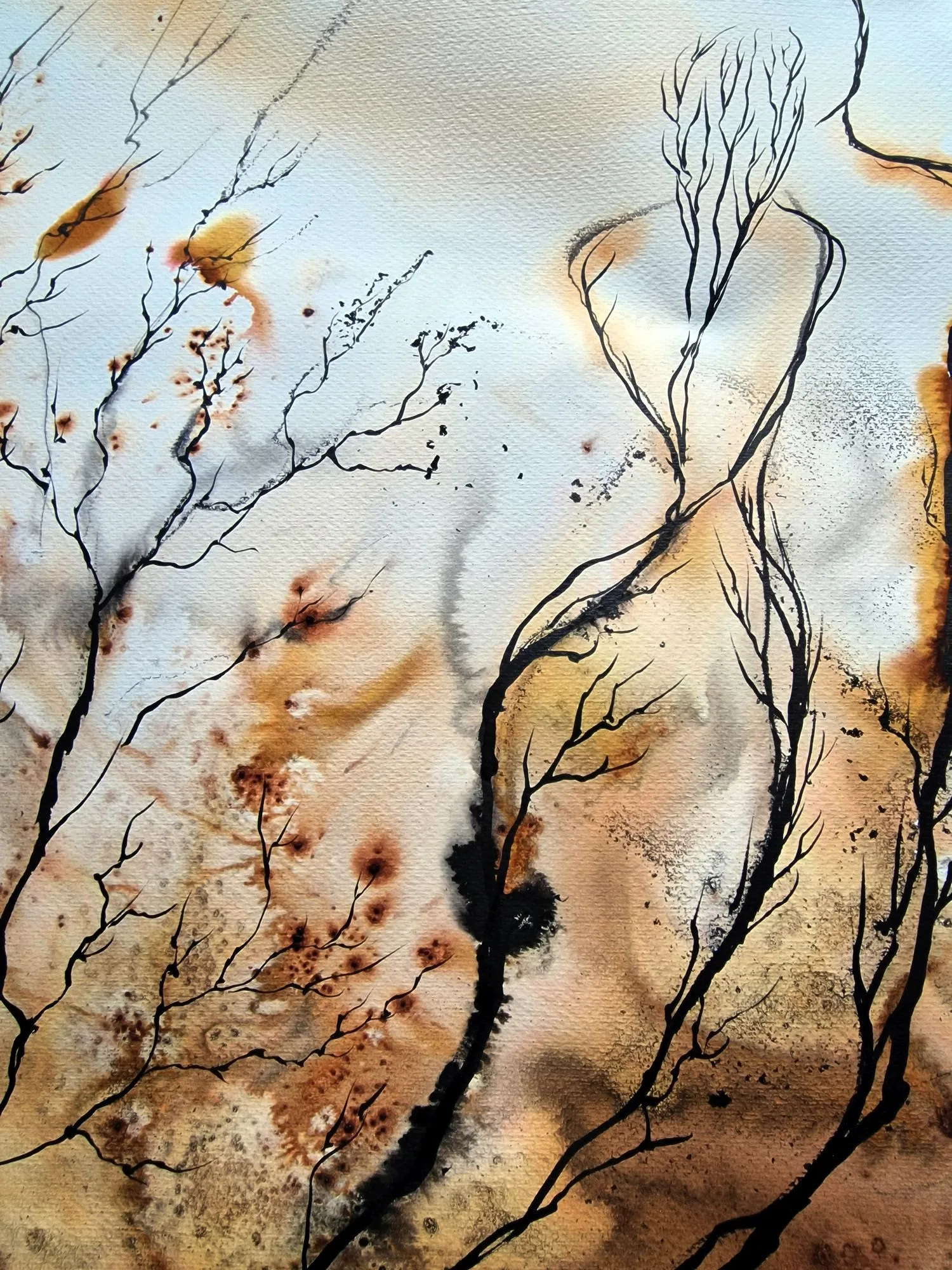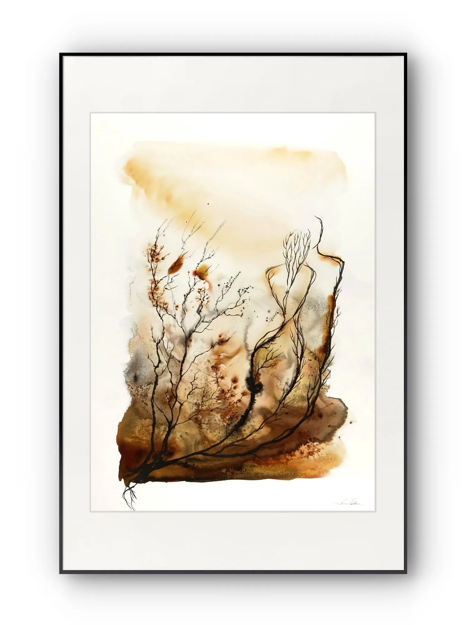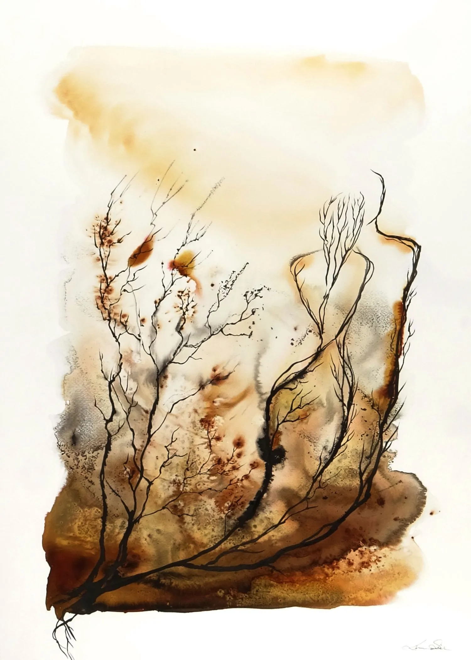 Akwarela o organicznym, subtelnie figuratywnym charakterze buduje obraz z miękkich przejść ochry, ciepłych beżów, brązów i szarości, zestawionych z delikatnym, linearnym rysunkiem. Kompozycja pozostaje lekka i otwarta, a obecność dwóch syntetycznych form wprowadza do niej ciszę, relację i spokojne napięcie.