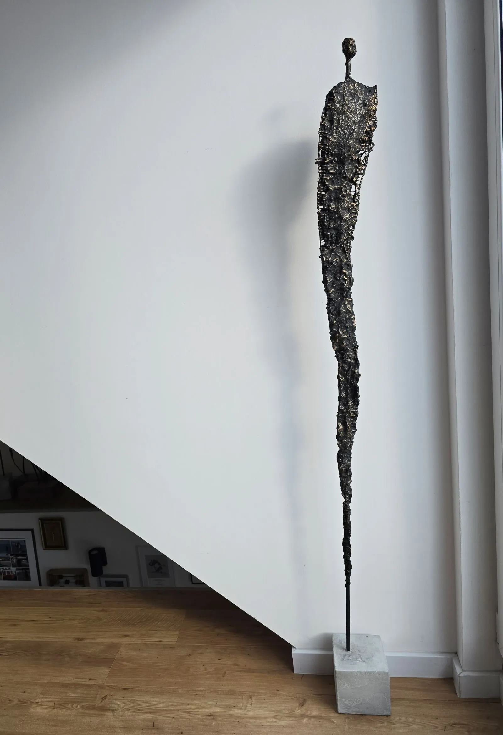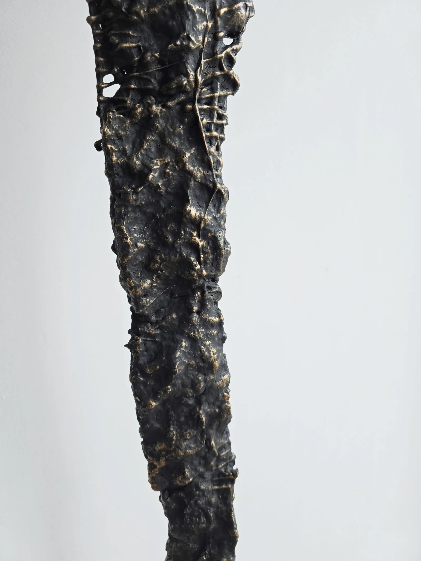 Inspiracją dla tego wyjątkowej rzeźby są obrazy i grafiki z mojej kolekcji Point od Balance. Zaczerpnięty z nich motyw kamiennych postaci, przeniesiony do formy przestrzennej, dodając rzeźbie głębi i znaczenia. Biomorficzne kształty rzeźby, nawiązujące do ludzkich sylwetek, wyrażają emocje i relacje, jakie łączą nas z innymi. Surowość materiałów została złagodzona przez plastyczność gliny i masy z sproszkowanego kamienia, tworząc harmonijną całość.