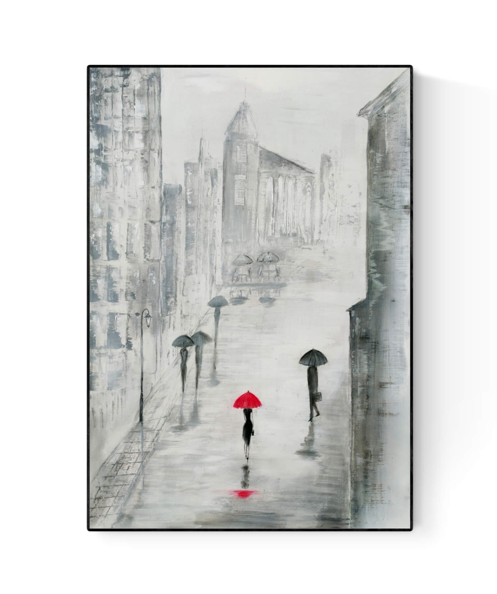 Obraz został oprawiony w sosnową ramę typu box, czarne wykończenie.