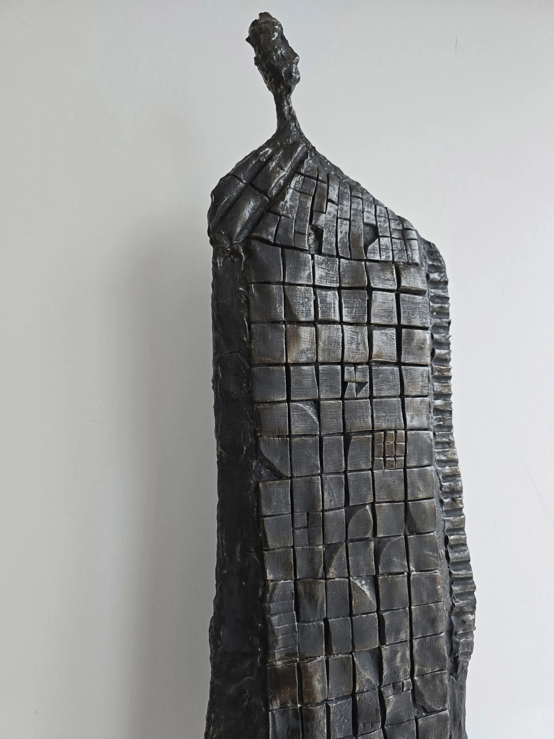 Kolorystyka rzeźby została starannie dobrana – czarna, głęboka, z subtelnymi, metalicznymi refleksami, które zmieniają się w zależności od kąta padania światła. Zdjęcia rzeźby wykonano celowo w różnych warunkach oświetleniowych, by oddać niuanse tekstury i nastroju dzieła.