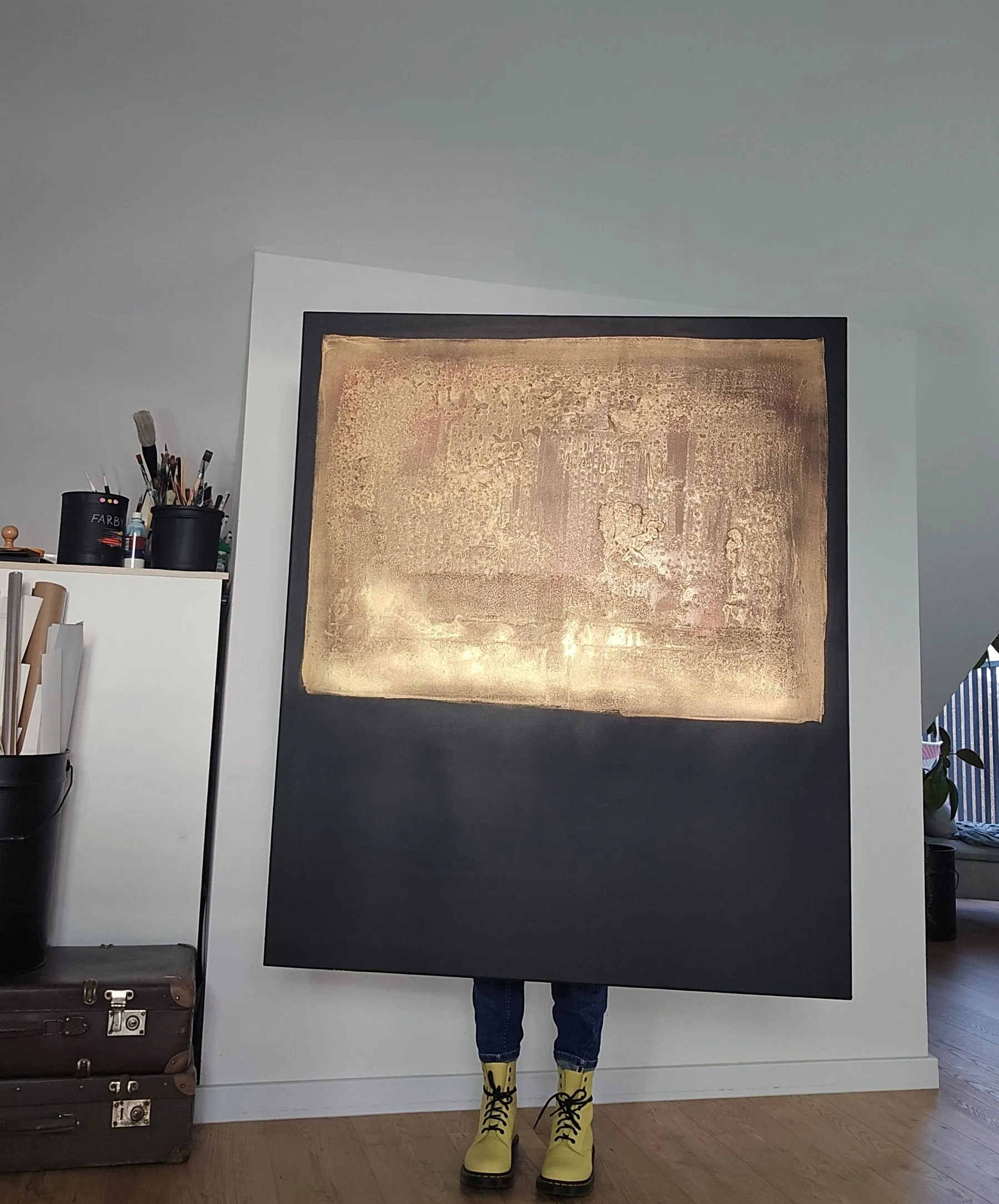 Obraz został namalowany w technice mixmedia, zabezpieczony werniksem. Gotowy do powieszenia zamalowane boki. Forma i kolorystyka obrazu podkreśli charakter nowoczesnej przestrzeni. Idealny do białych i szarych ścian, betonów oraz cegły. Obraz loftowy, pasuje również do wnętrz industrial.