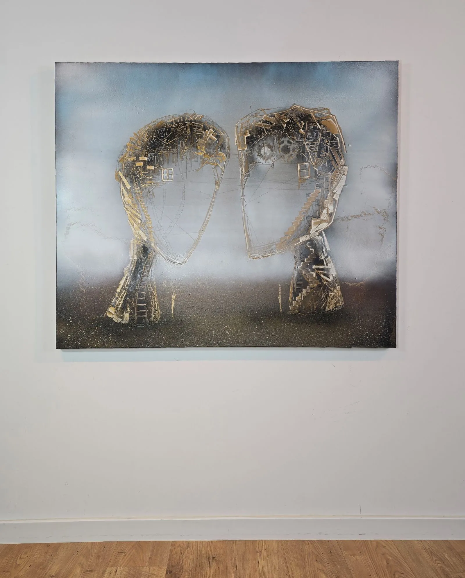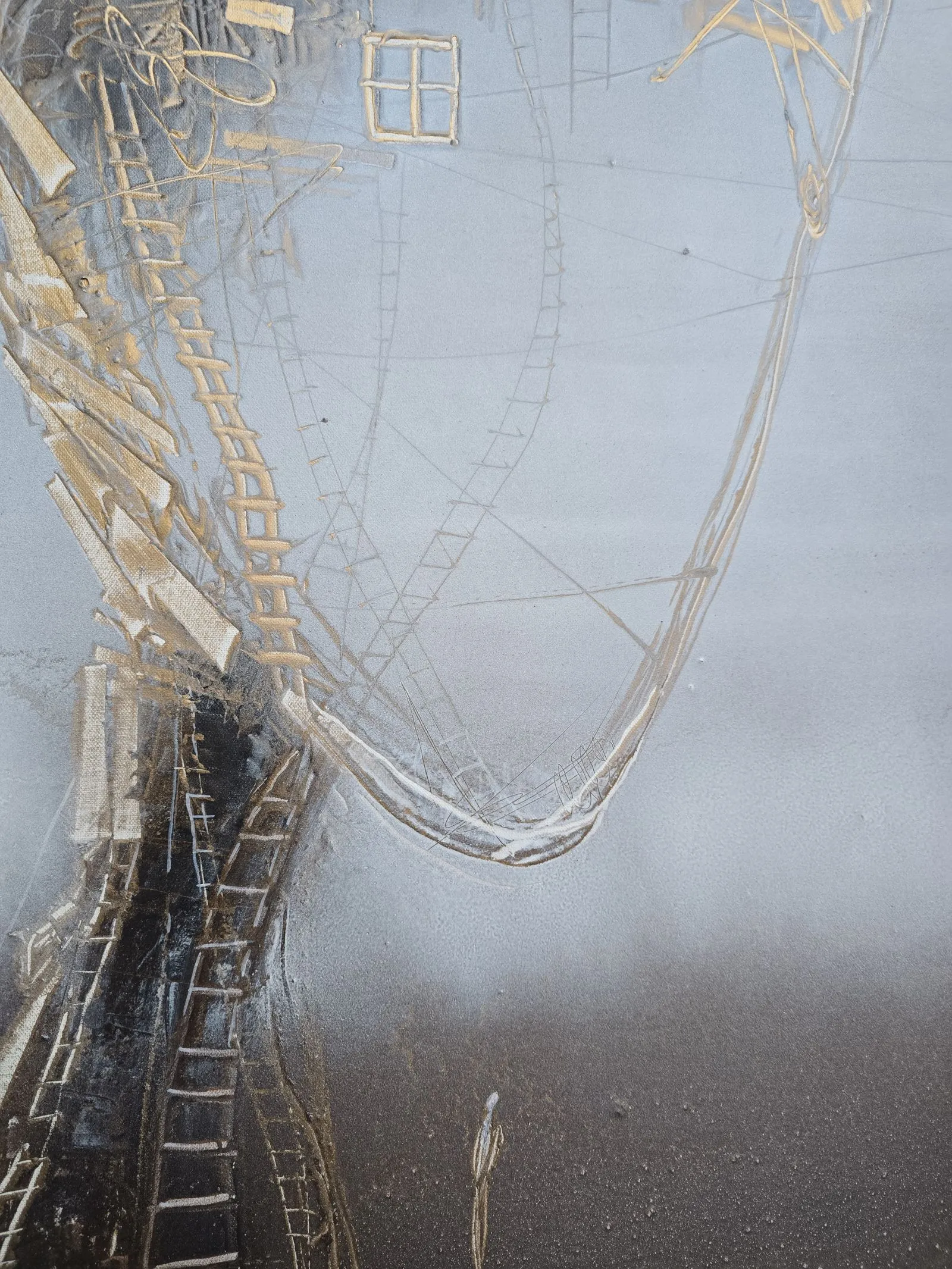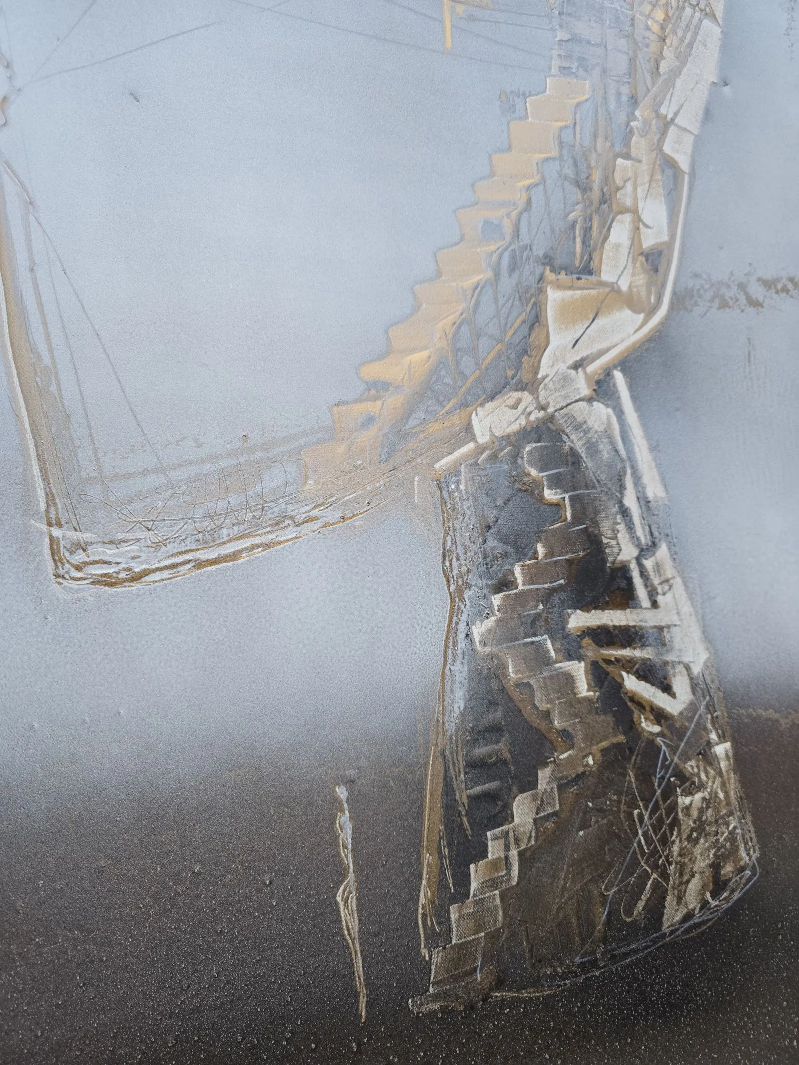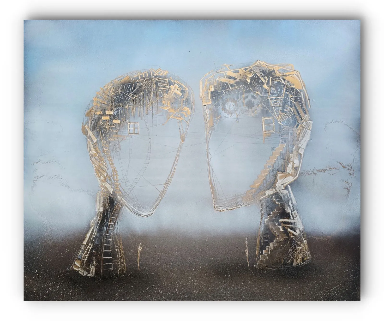 "Nić porozumienia" to dzieło pełne subtelnych odniesień do ludzkich relacji, emocji i wspólnego doświadczenia. Dwie abstrakcyjne sylwetki, zbudowane z misternych struktur przypominających delikatne sieci i schody, symbolizują skomplikowaną, ale piękną naturę wzajemnego zrozumienia. Złote akcenty podkreślają wartość i kruchość relacji, sugerując, że każda nić łącząca te figury jest zarówno delikatna, jak i trwała. Obraz zachęca do refleksji nad tym, jak komunikacja i wspólne doświadczenia kształtują nasz świat wewnętrzny i relacje z innymi.