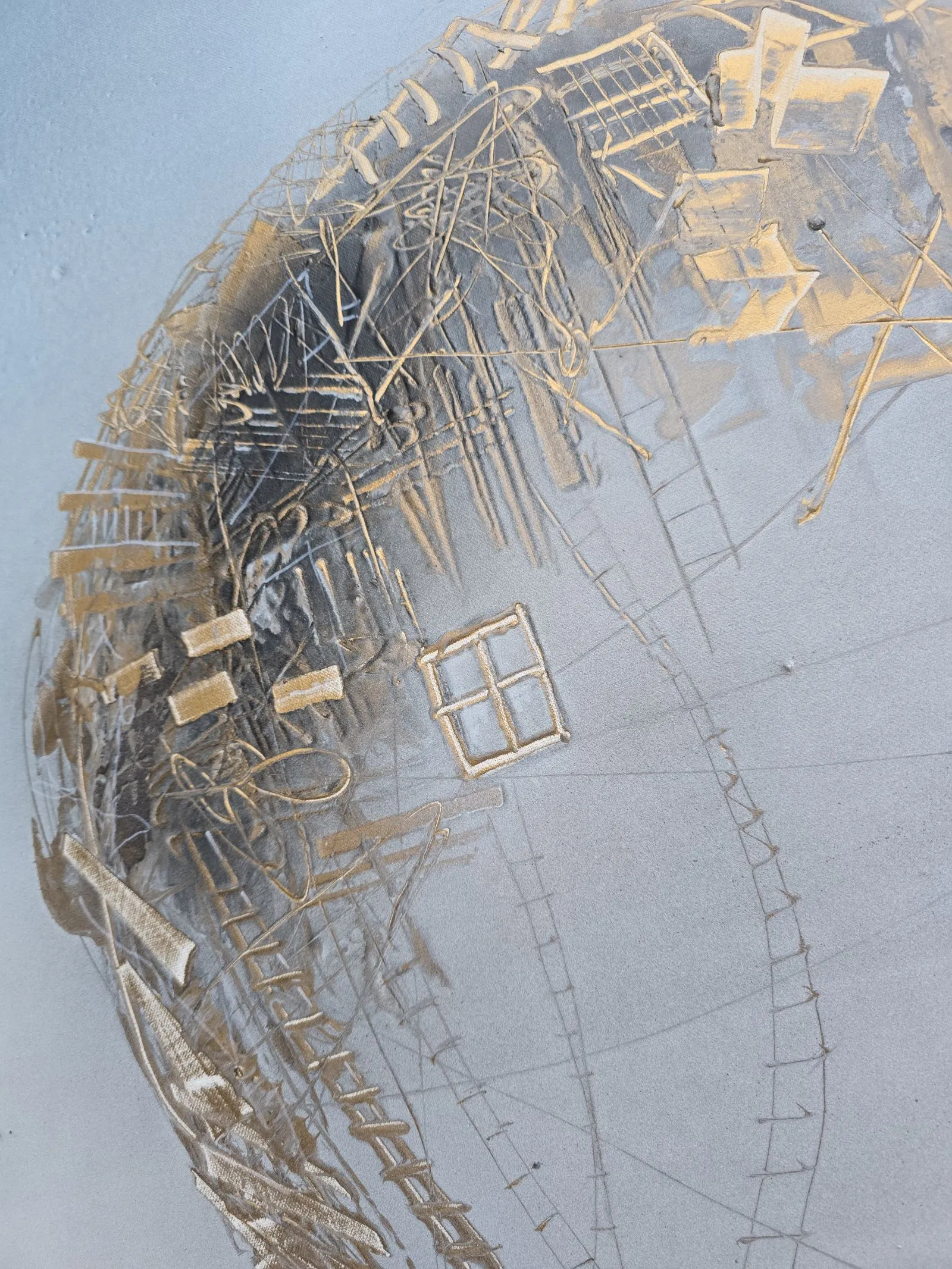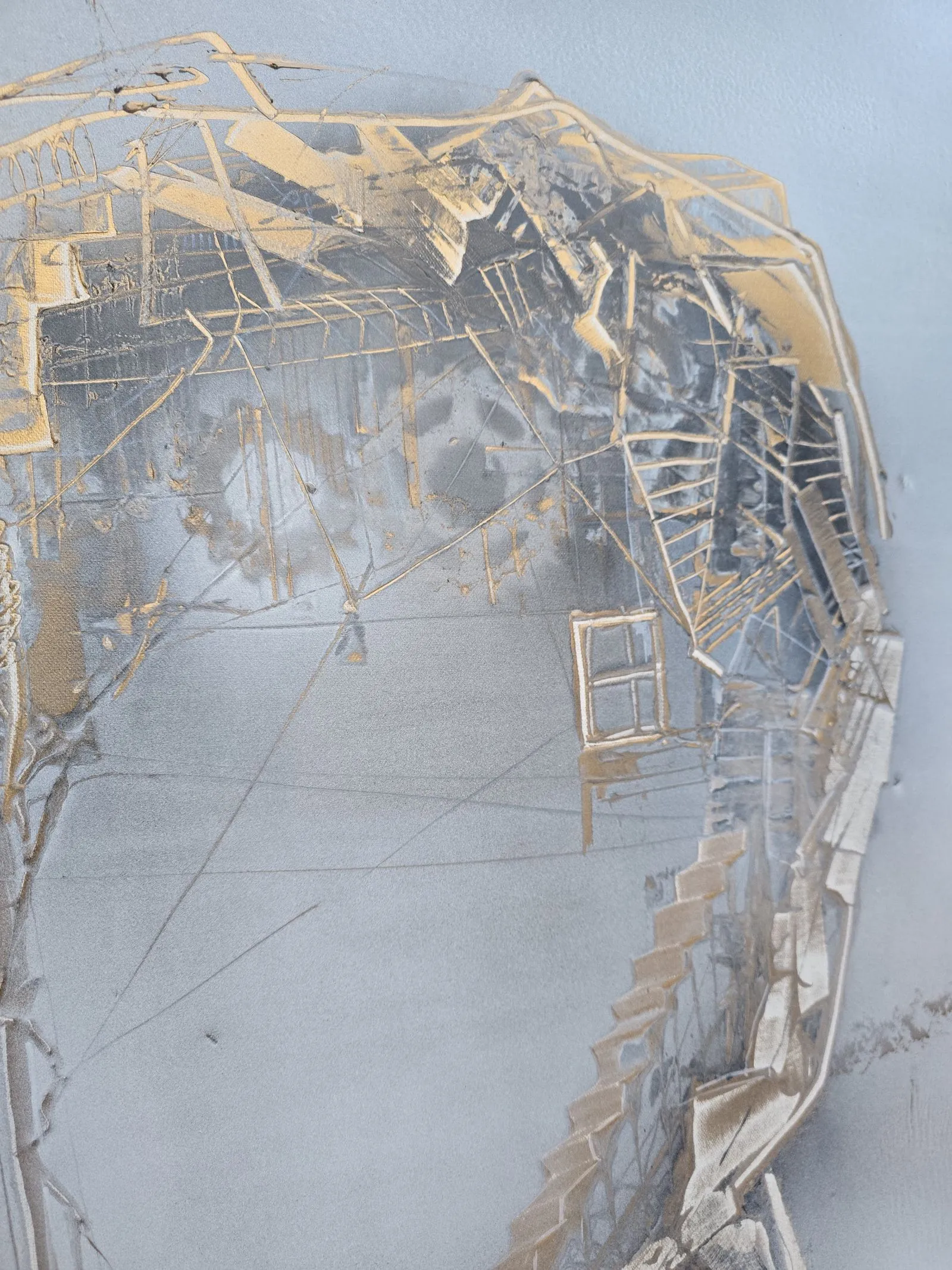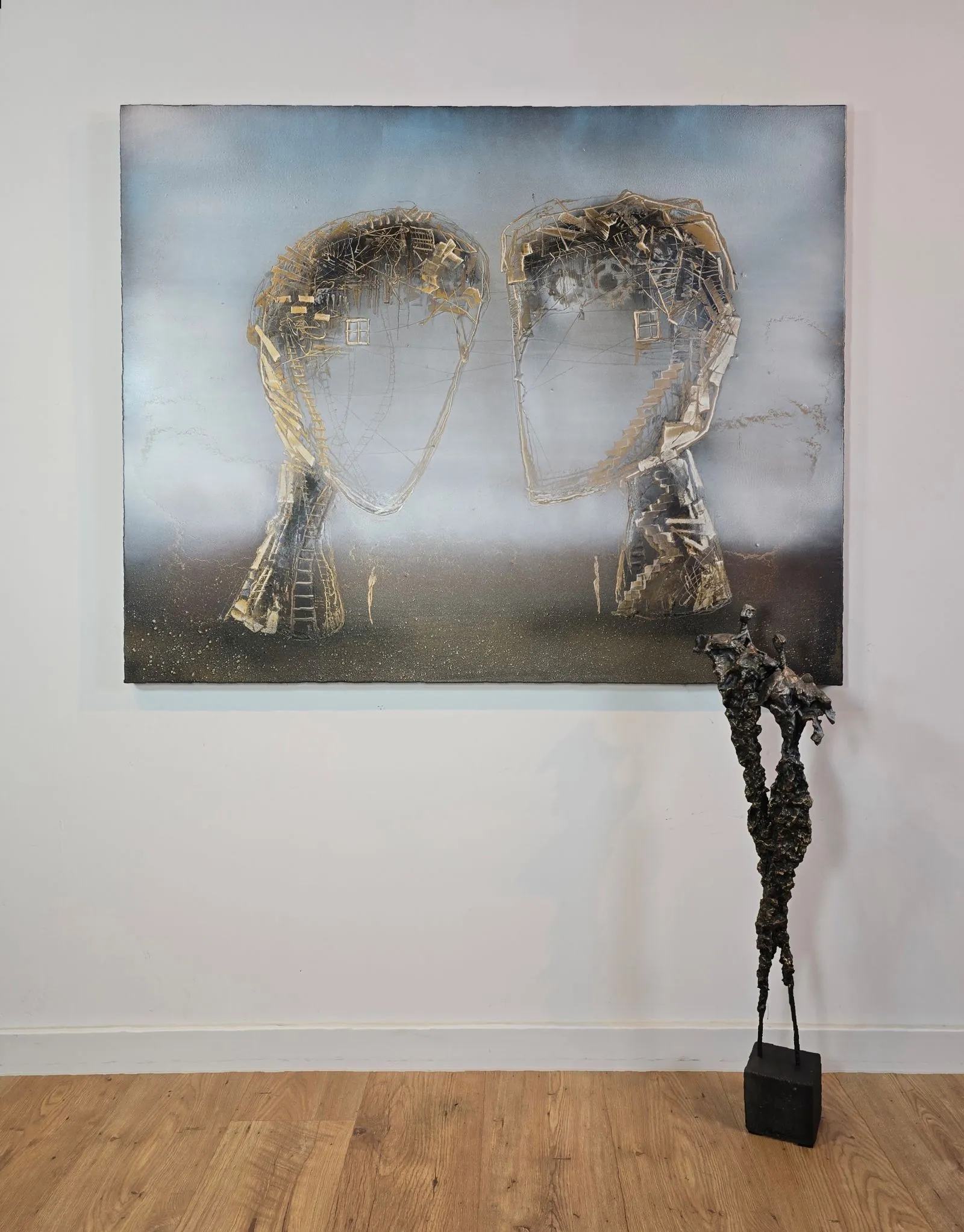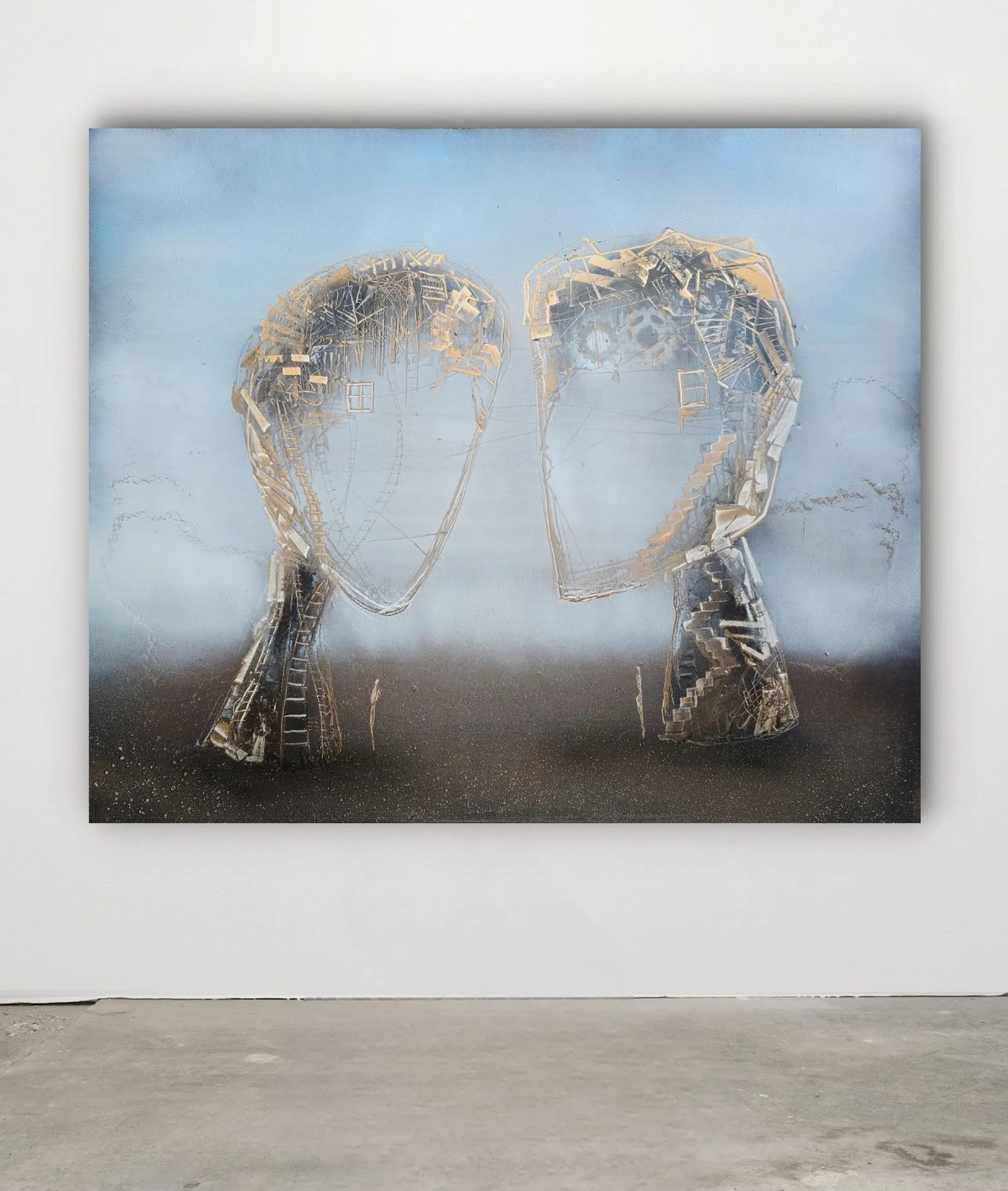 "Nić porozumienia" to dzieło pełne subtelnych odniesień do ludzkich relacji, emocji i wspólnego doświadczenia. Dwie abstrakcyjne sylwetki, zbudowane z misternych struktur przypominających delikatne sieci i schody, symbolizują skomplikowaną, ale piękną naturę wzajemnego zrozumienia. Złote akcenty podkreślają wartość i kruchość relacji, sugerując, że każda nić łącząca te figury jest zarówno delikatna, jak i trwała. Obraz zachęca do refleksji nad tym, jak komunikacja i wspólne doświadczenia kształtują nasz świat wewnętrzny i relacje z innymi.