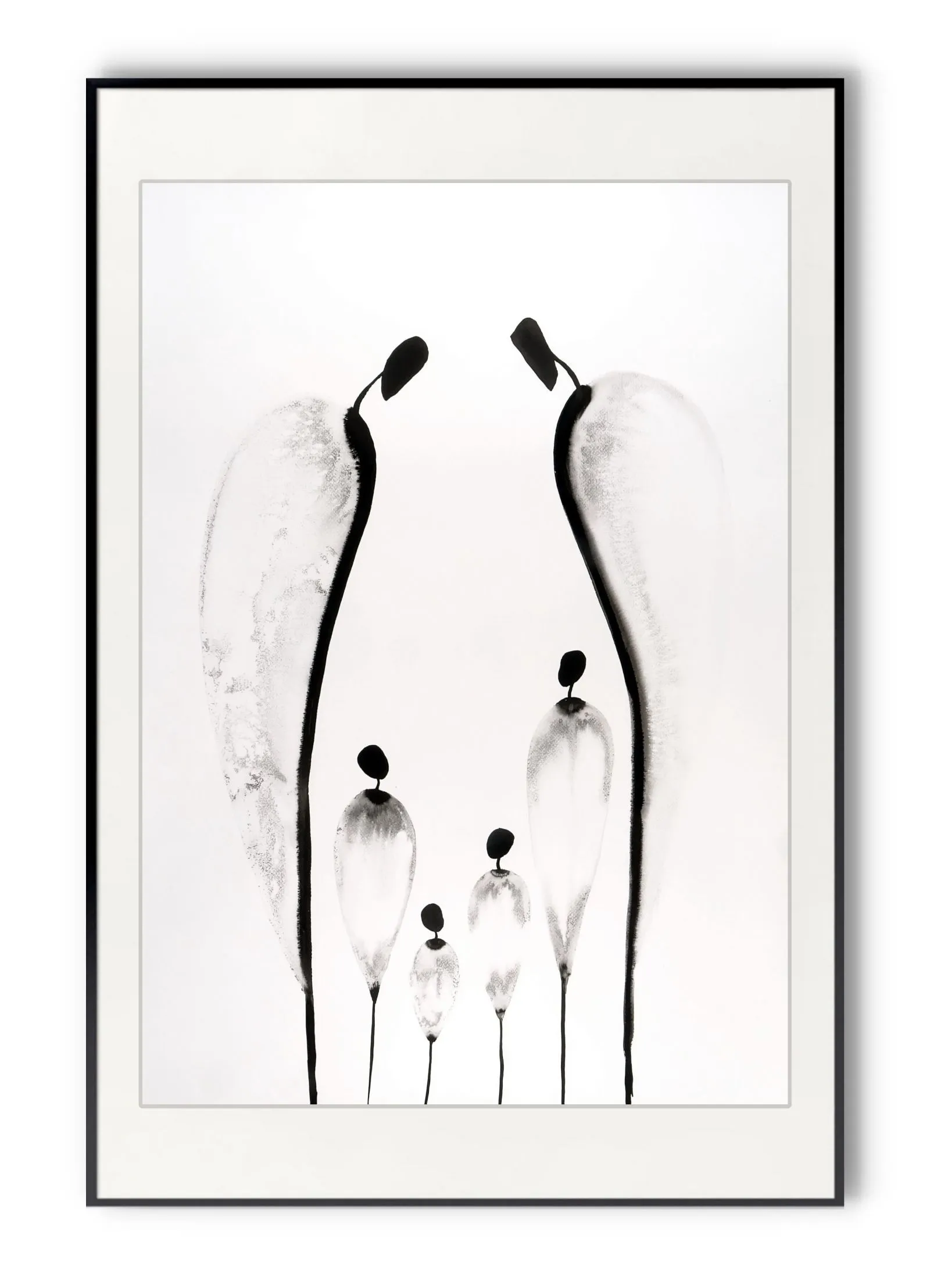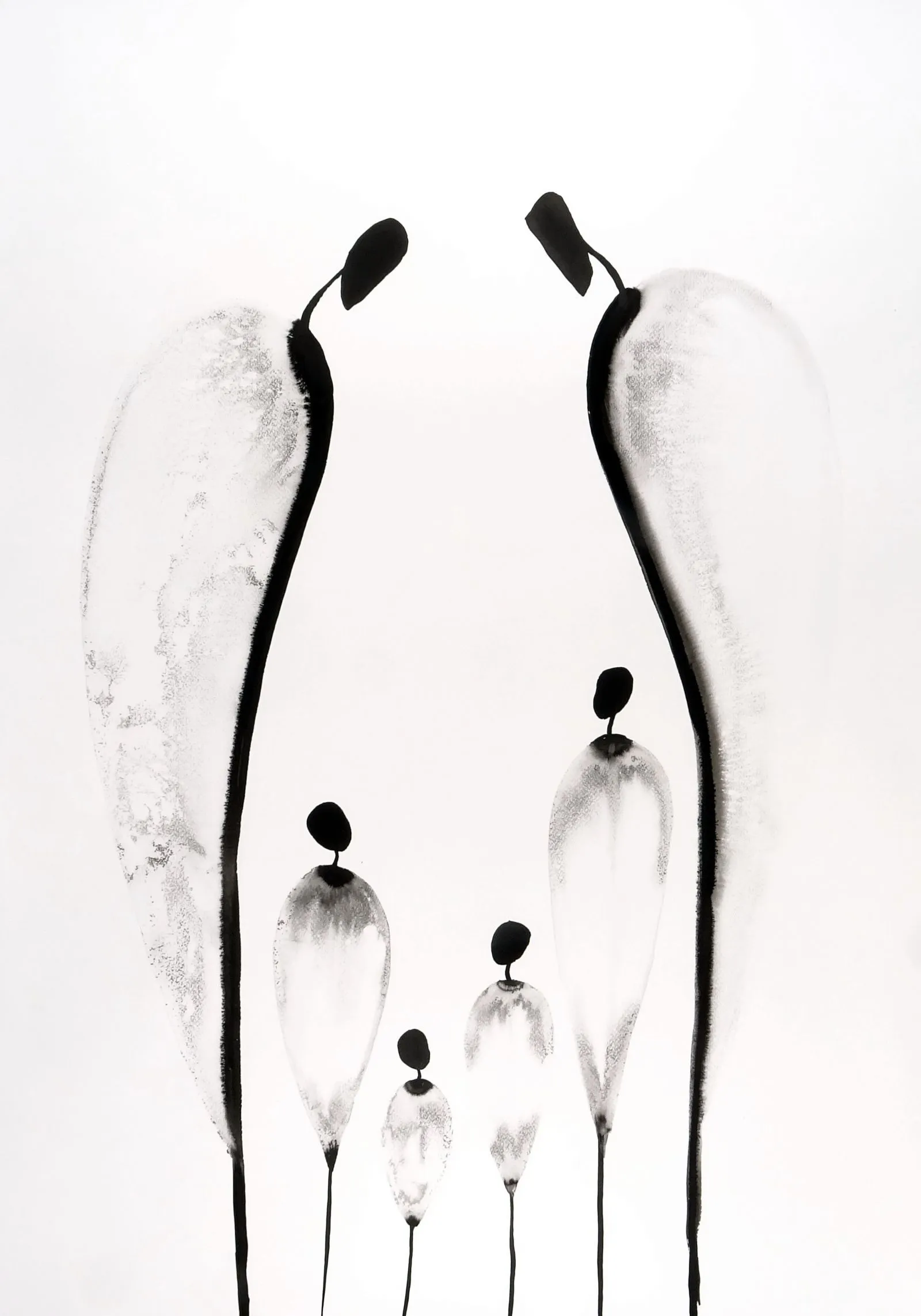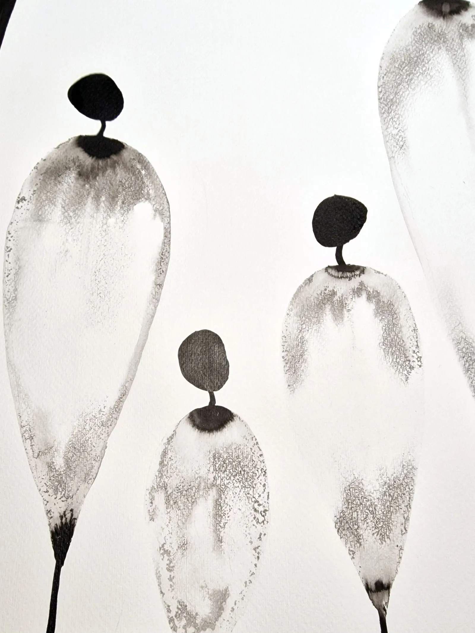 Wyjątkowa kolekcja dużych grafik abstrakcyjnych do salonu i dużych przestrzeni. Ten delikatny obraz namalowany ręcznie tuszem oddaje ulotną chwilę. Ten abstrakcyjny obraz tuszem przedstawia zarys kamiennych form, które przywodzą na myśl ludzkie sylwetki. Zróżnicowane odcienie czerni i szarości wyróżniają postać, sugerując jej unikalną osobowość i siłę, mimo że pozostają one zredukowane do prostych, organicznych kształtów. Tekstury tuszu oddają naturalne pęknięcia i nierówności powierzchni, nadając każdej formie głębię i charakter.