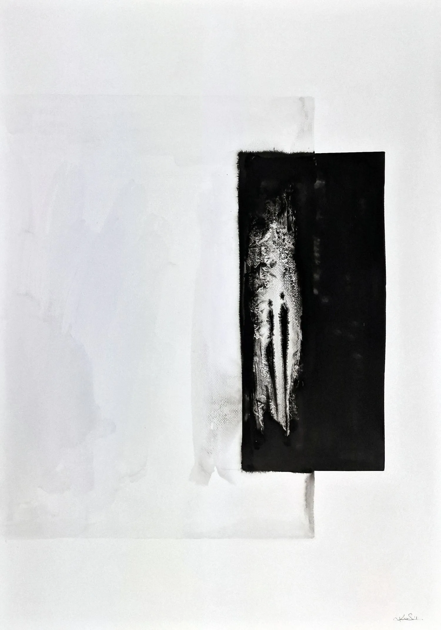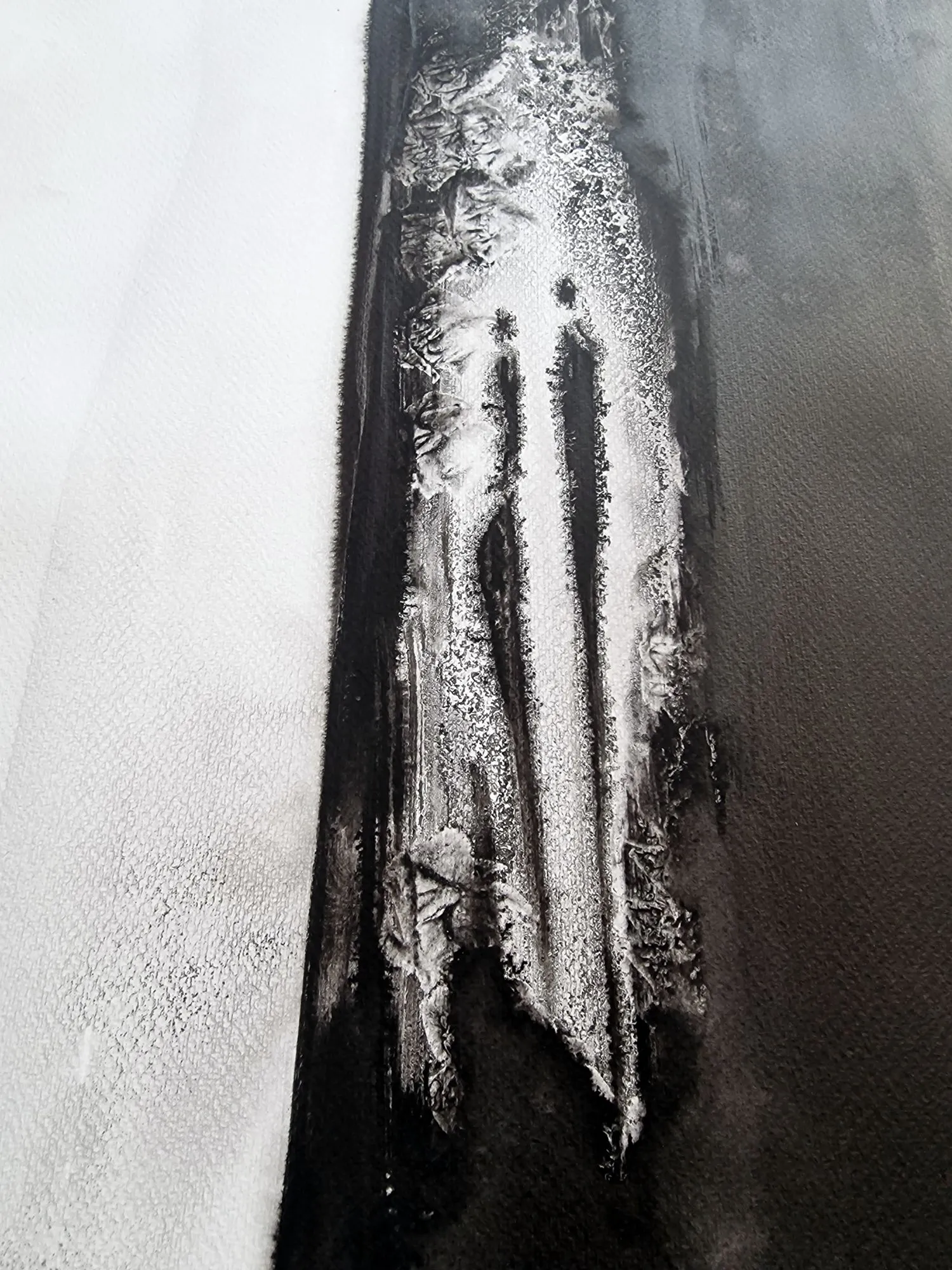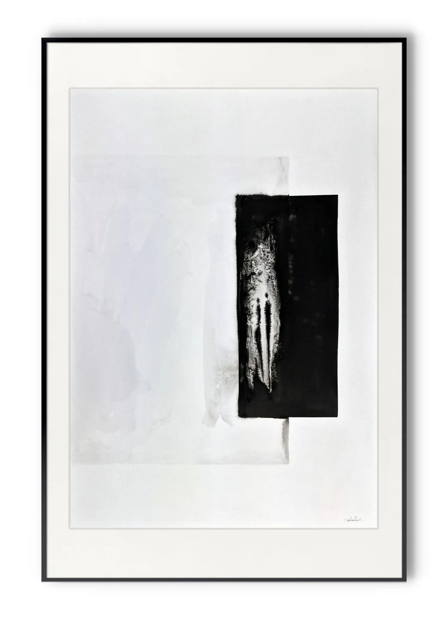 Grafika o abstrakcyjno-symbolicznym charakterze operuje skrajną oszczędnością formy, kontrastem czerni i bieli oraz skupioną, pionową kompozycją. Zestawienie zwartego czarnego pola z delikatnym, niemal świetlnym śladem buduje obraz wyciszony, precyzyjny i otwarty na interpretację.