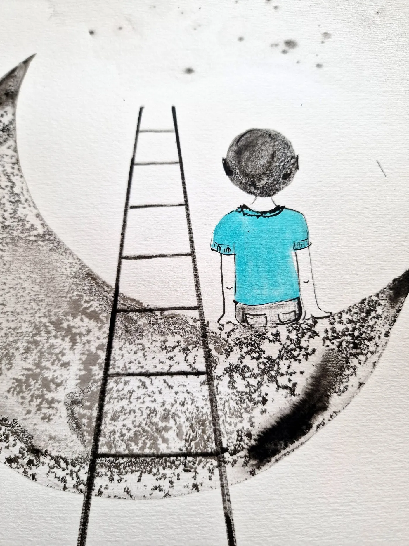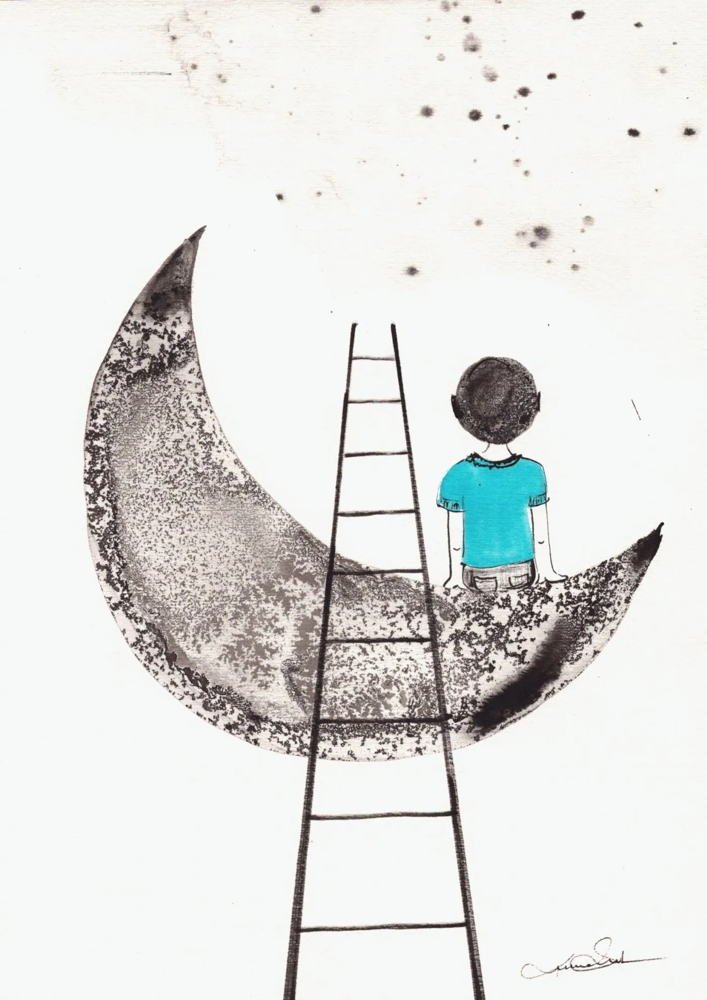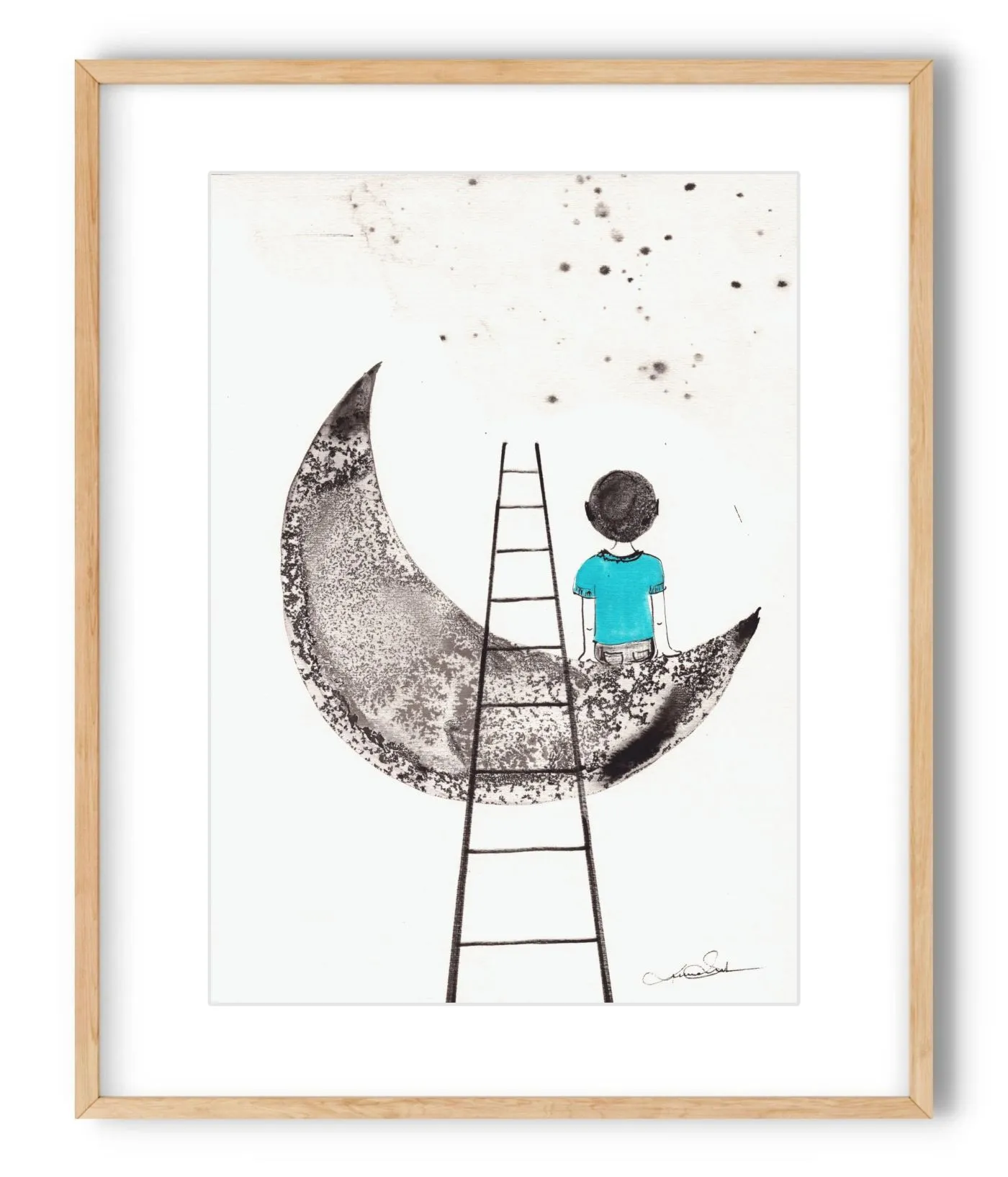 Autorska grafika o subtelnie baśniowym charakterze łączy czarno-biały rysunek z delikatnym akcentem turkusu. Motyw chłopca siedzącego na księżycu buduje nastrój spokoju, marzenia i cichej uważności, dzięki czemu praca wnosi do wnętrza lekkość i poetycki ton.
