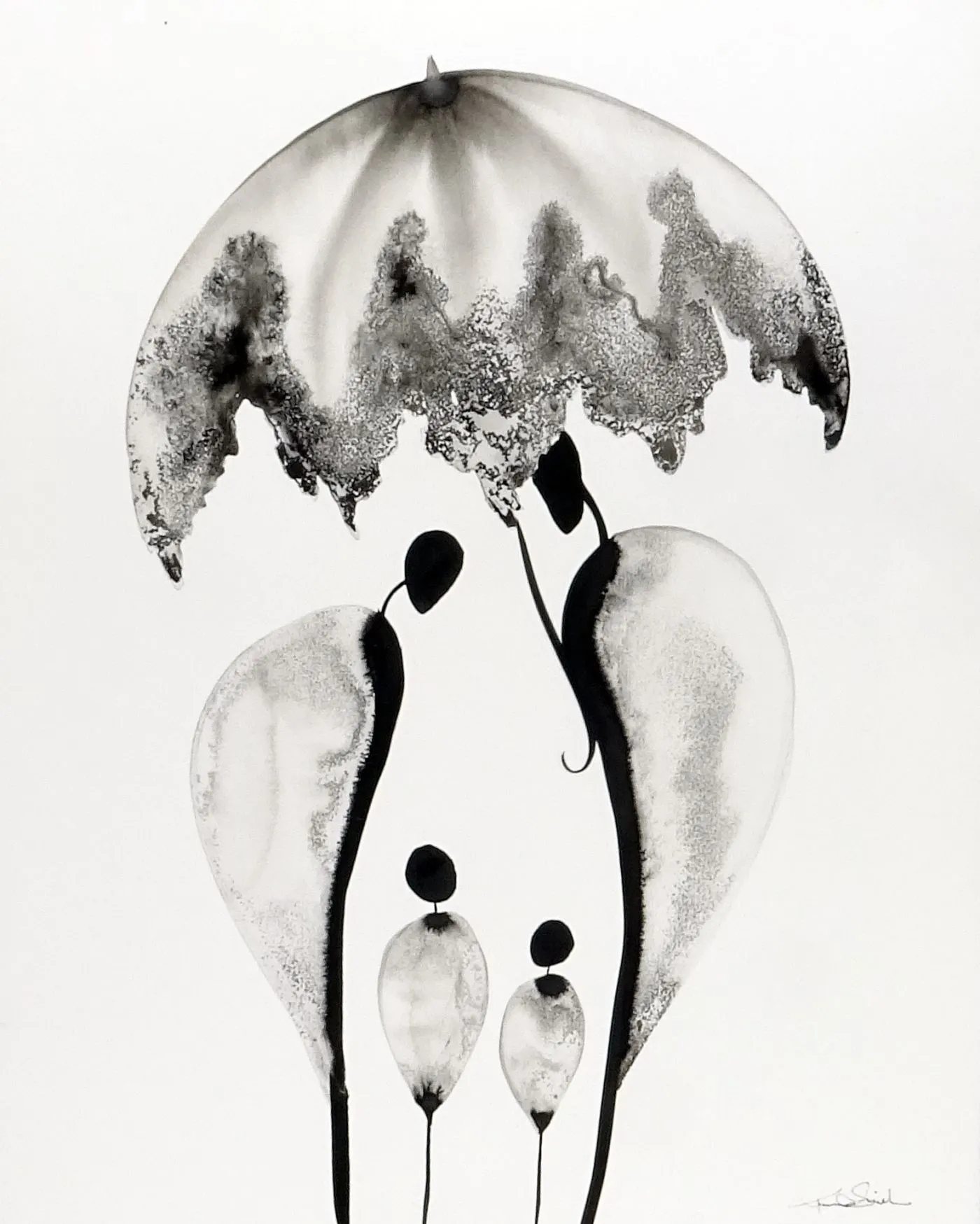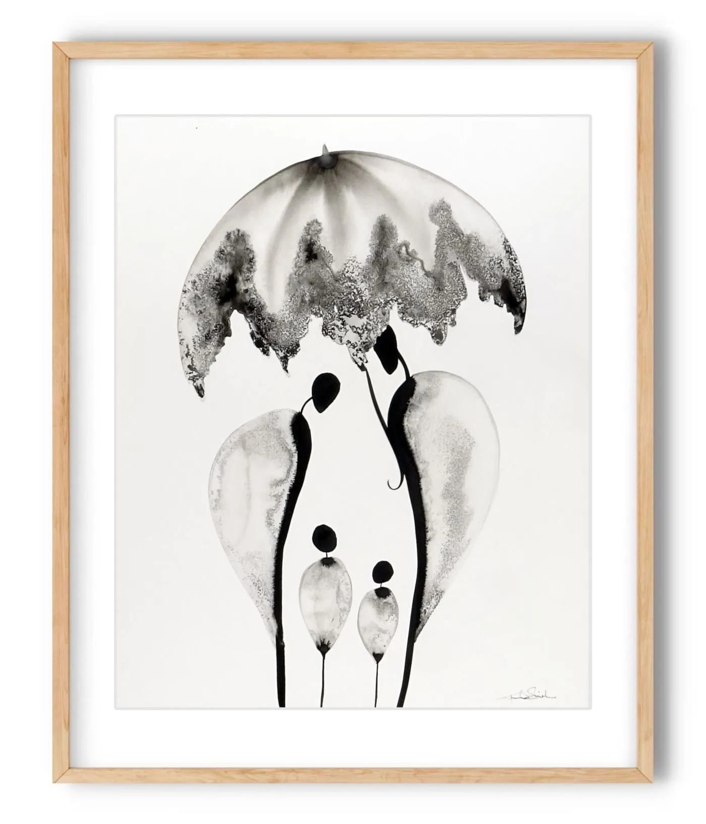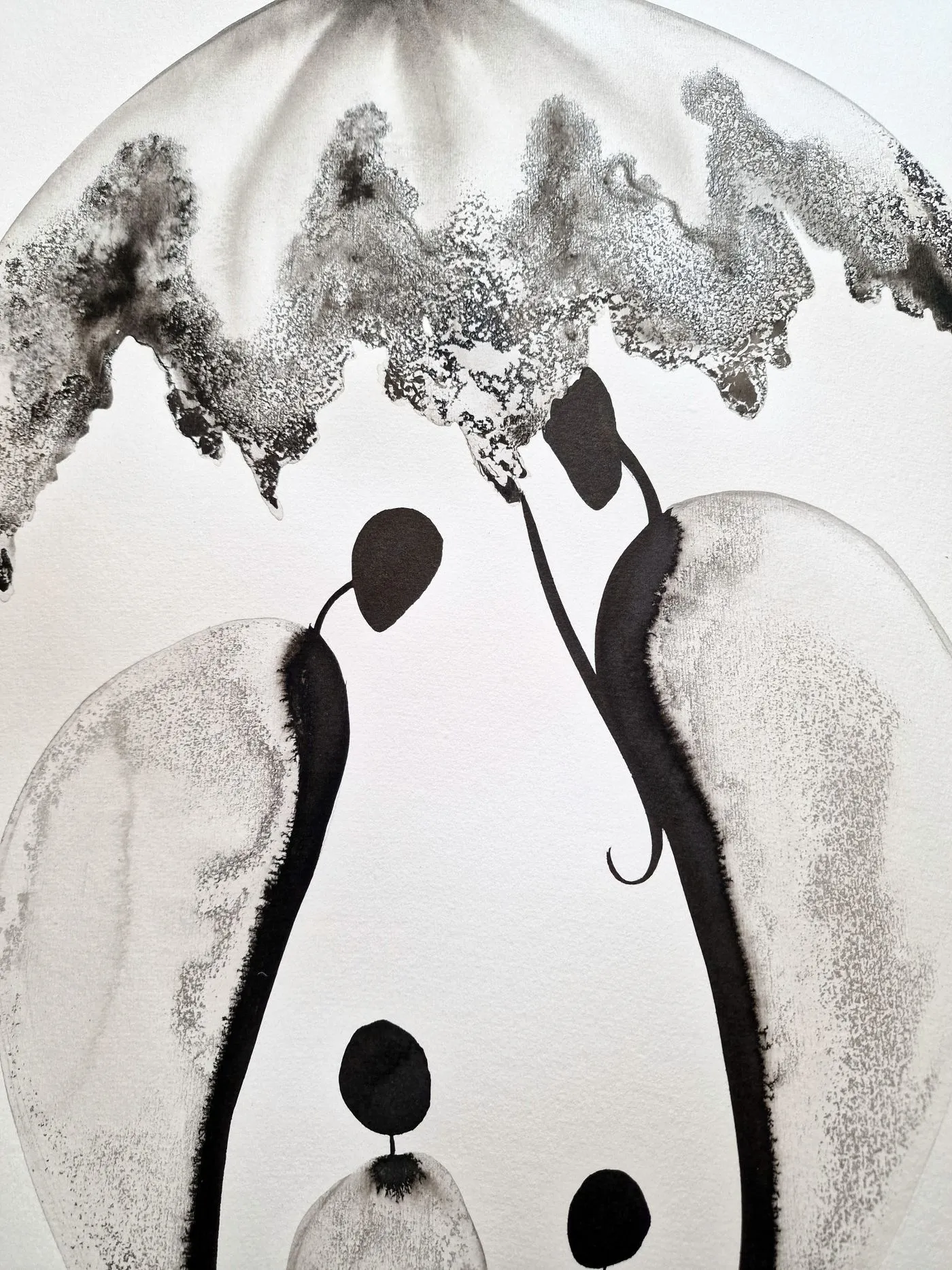 Ręcznie wykonana tuszem na tradycyjnym papierze akwarelowym, którego faktura doskonale komponuje się z delikatnością użytego medium. Czarny tusz z dodatkiem ciepłych odcieni szarości. Elegancki minimalizm z subtelną symboliką.