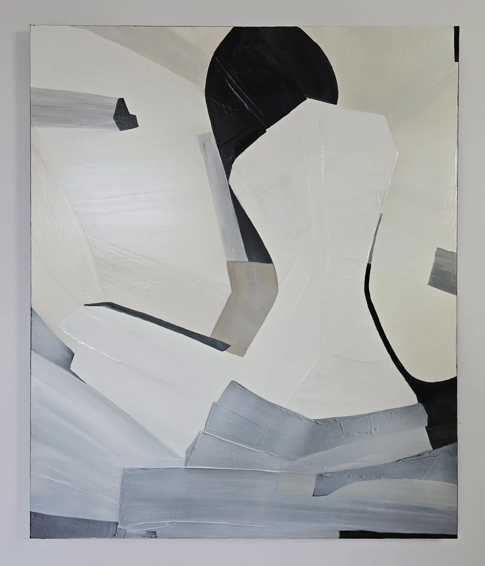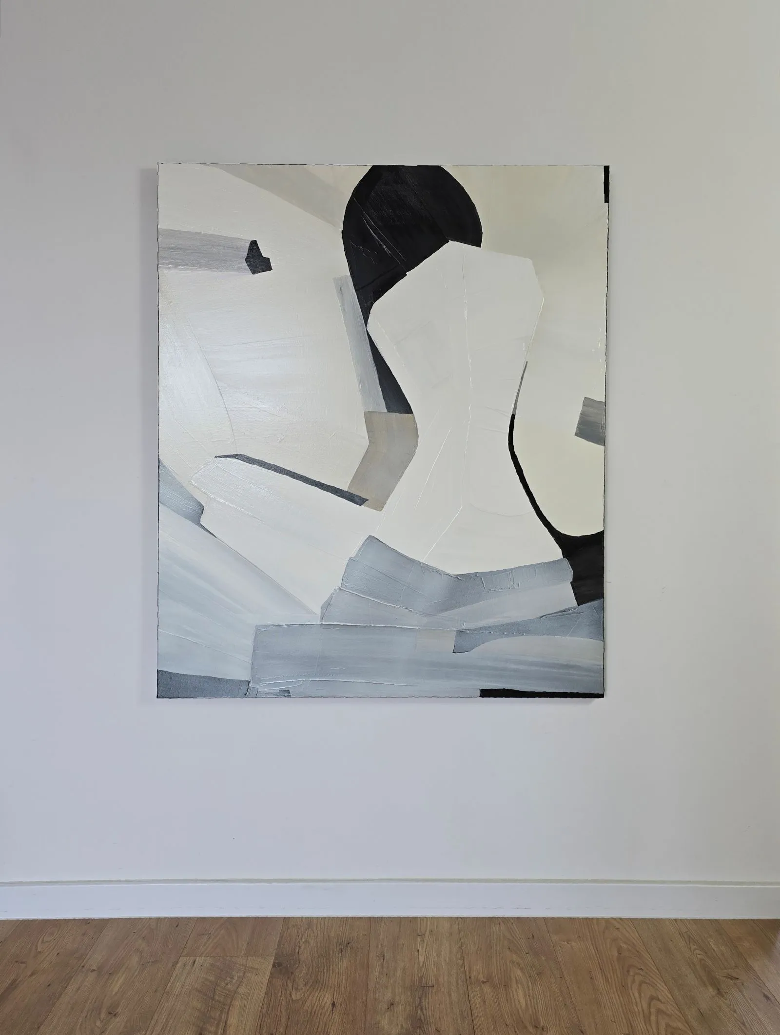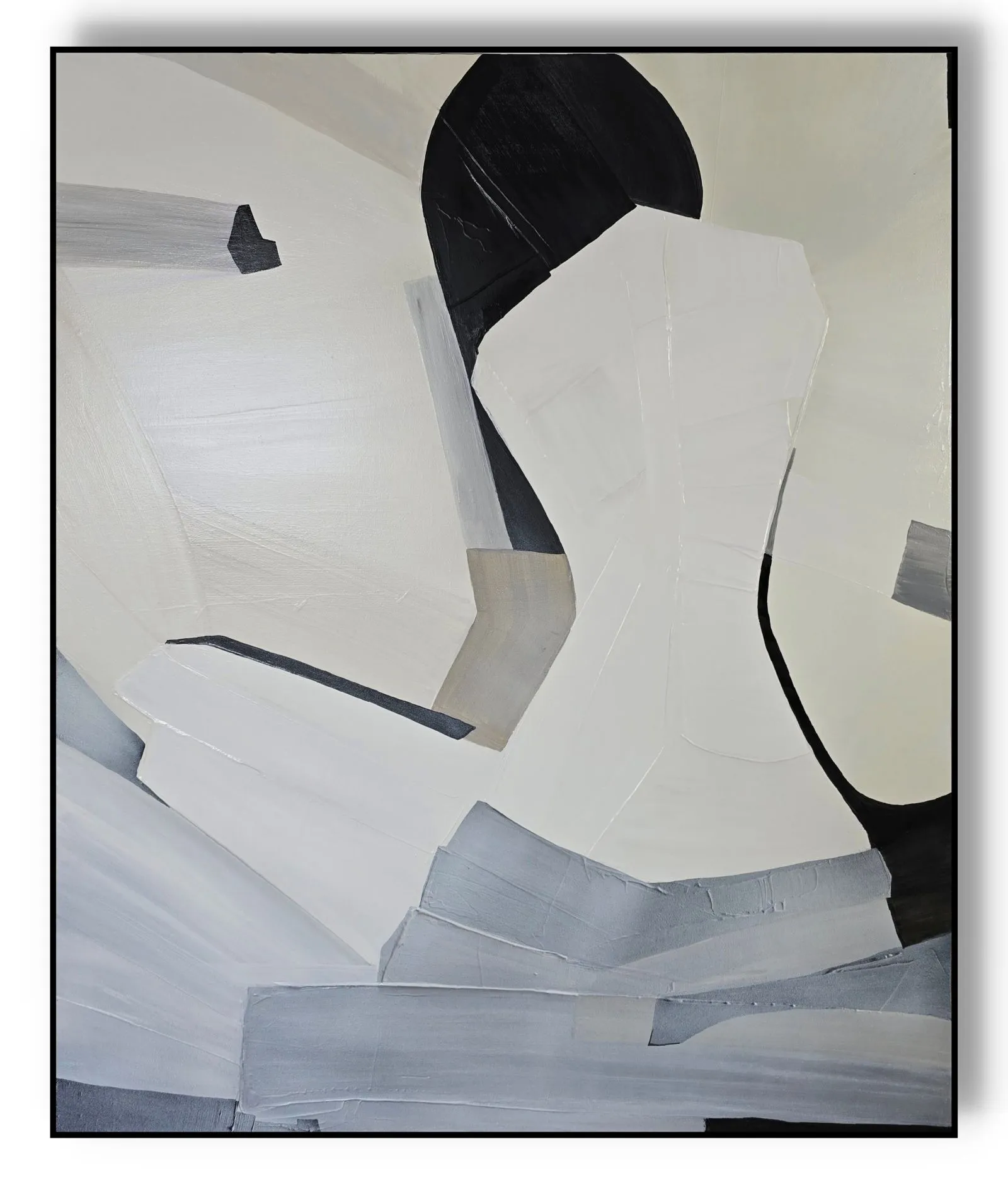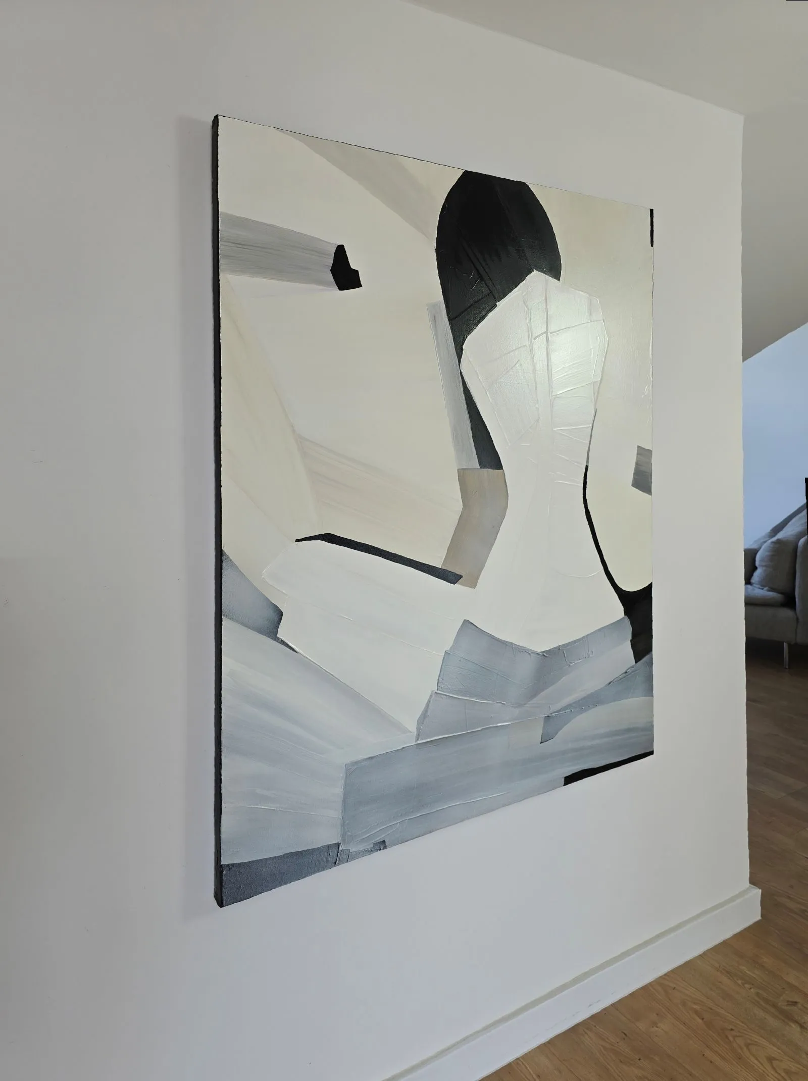 Pochodzący z cyklu Essence, obraz eksploruje fundamentalną esencję kobiecości w formie abstrakcji. Sylwetka kobiety, osadzona na tle bieli, stanowi wyraz minimalizmu, w którym każdy detal skrywa głęboką treść. Geometryczne kształty tworzą wrażenie wyciszenia i kontemplacji, a zarazem uwydatniają delikatność i siłę kobiecej natury. Kontrastujące kolory i wyrazista faktura malarska przenoszą widza w przestrzeń, gdzie forma staje się narracją – cisza i spokój emanują z kompozycji, ale to właśnie ta prostota oddaje najbardziej skomplikowane emocje.