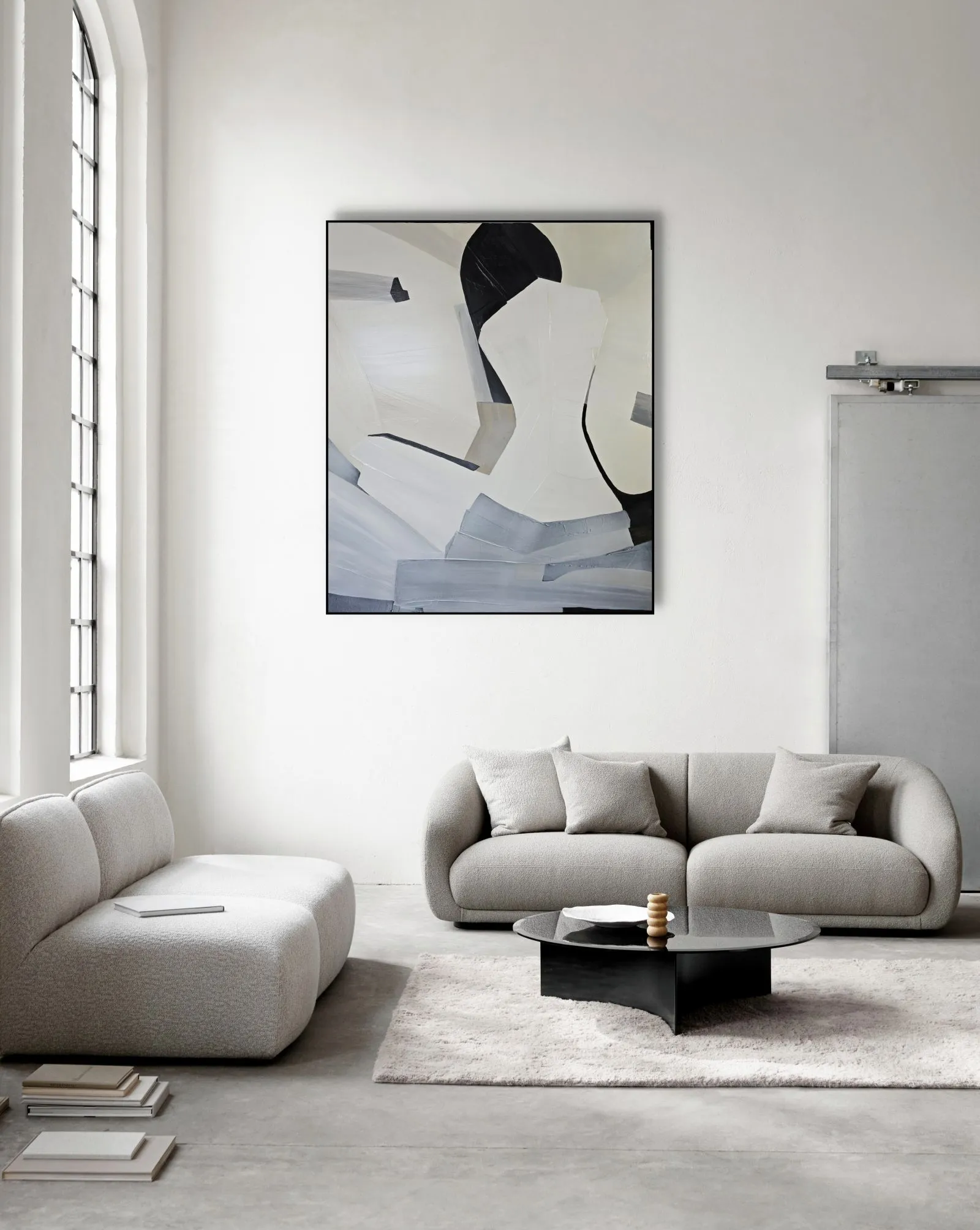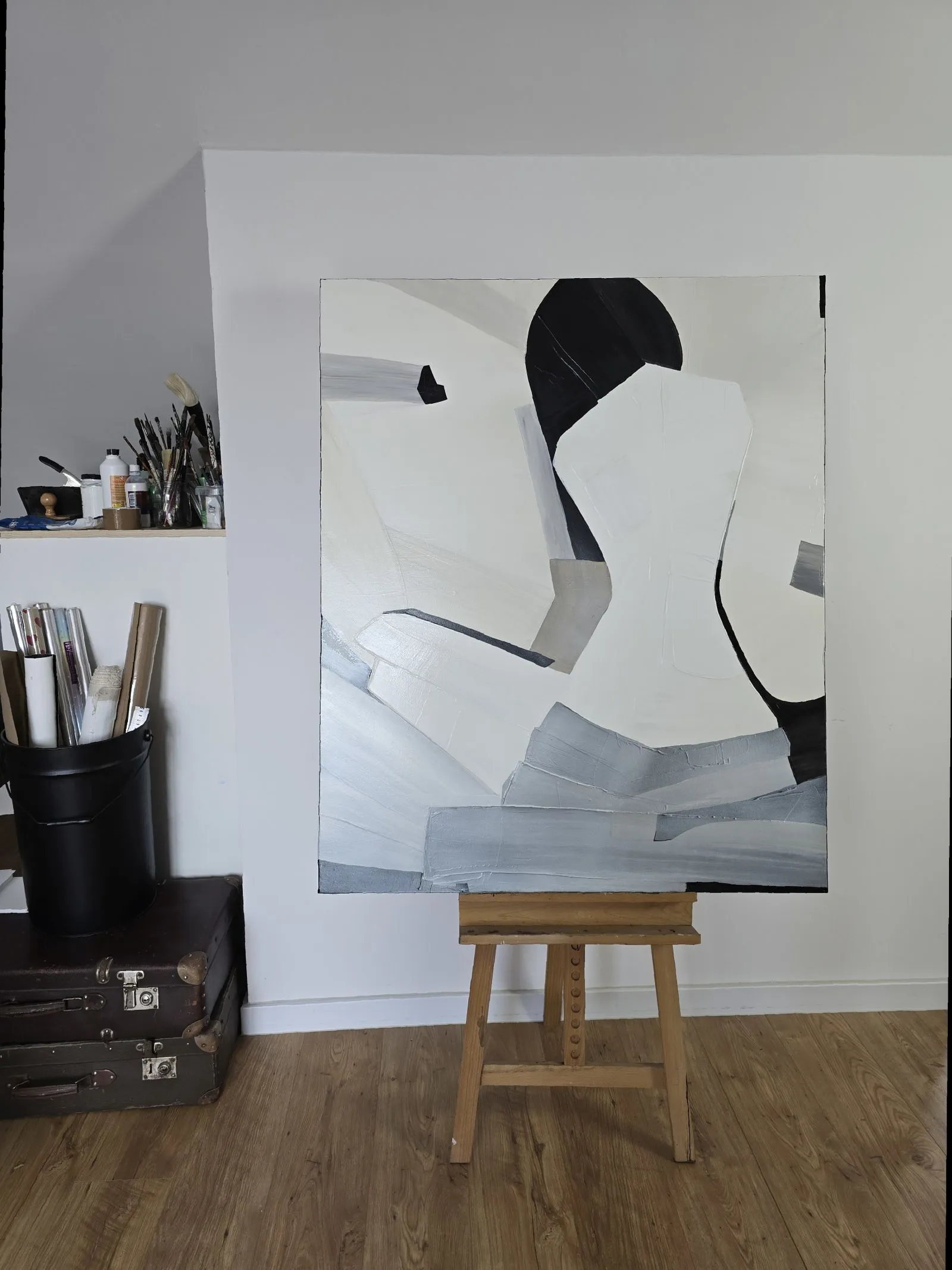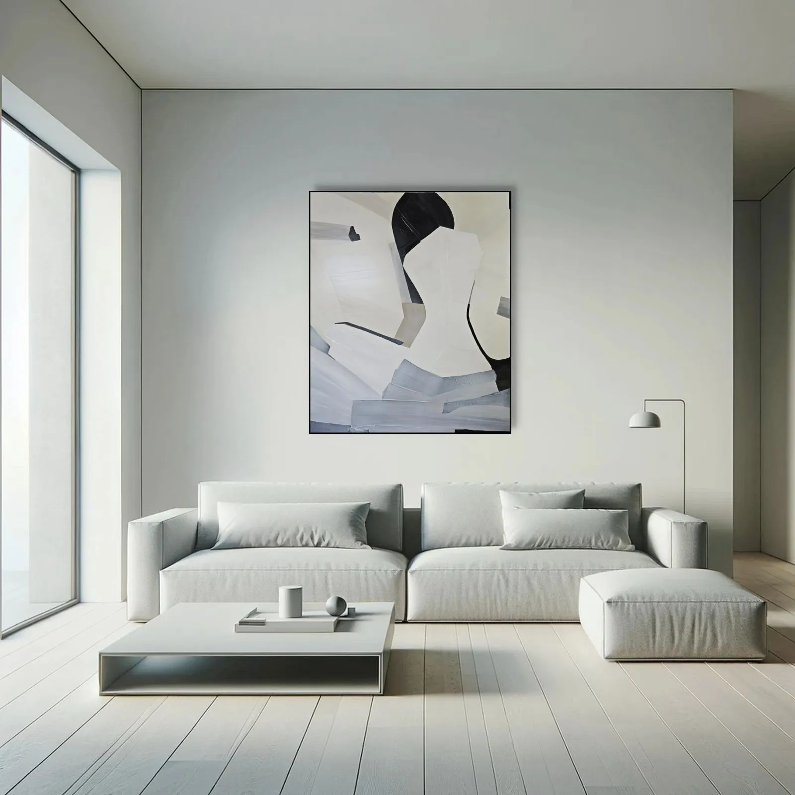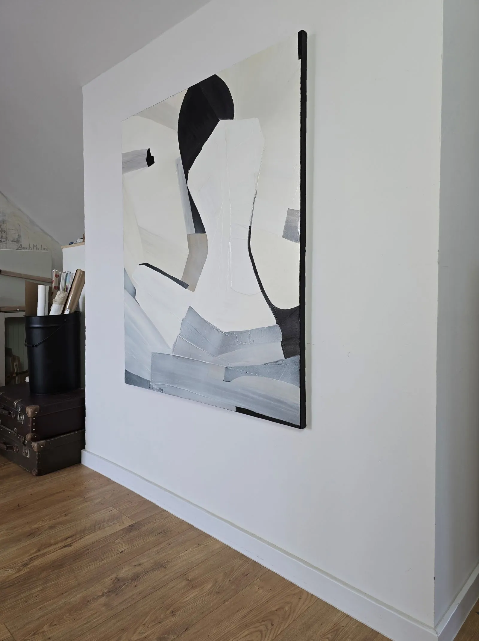 Pochodzący z cyklu Essence, obraz eksploruje fundamentalną esencję kobiecości w formie abstrakcji. Sylwetka kobiety, osadzona na tle bieli, stanowi wyraz minimalizmu, w którym każdy detal skrywa głęboką treść. Geometryczne kształty tworzą wrażenie wyciszenia i kontemplacji, a zarazem uwydatniają delikatność i siłę kobiecej natury. Kontrastujące kolory i wyrazista faktura malarska przenoszą widza w przestrzeń, gdzie forma staje się narracją – cisza i spokój emanują z kompozycji, ale to właśnie ta prostota oddaje najbardziej skomplikowane emocje.