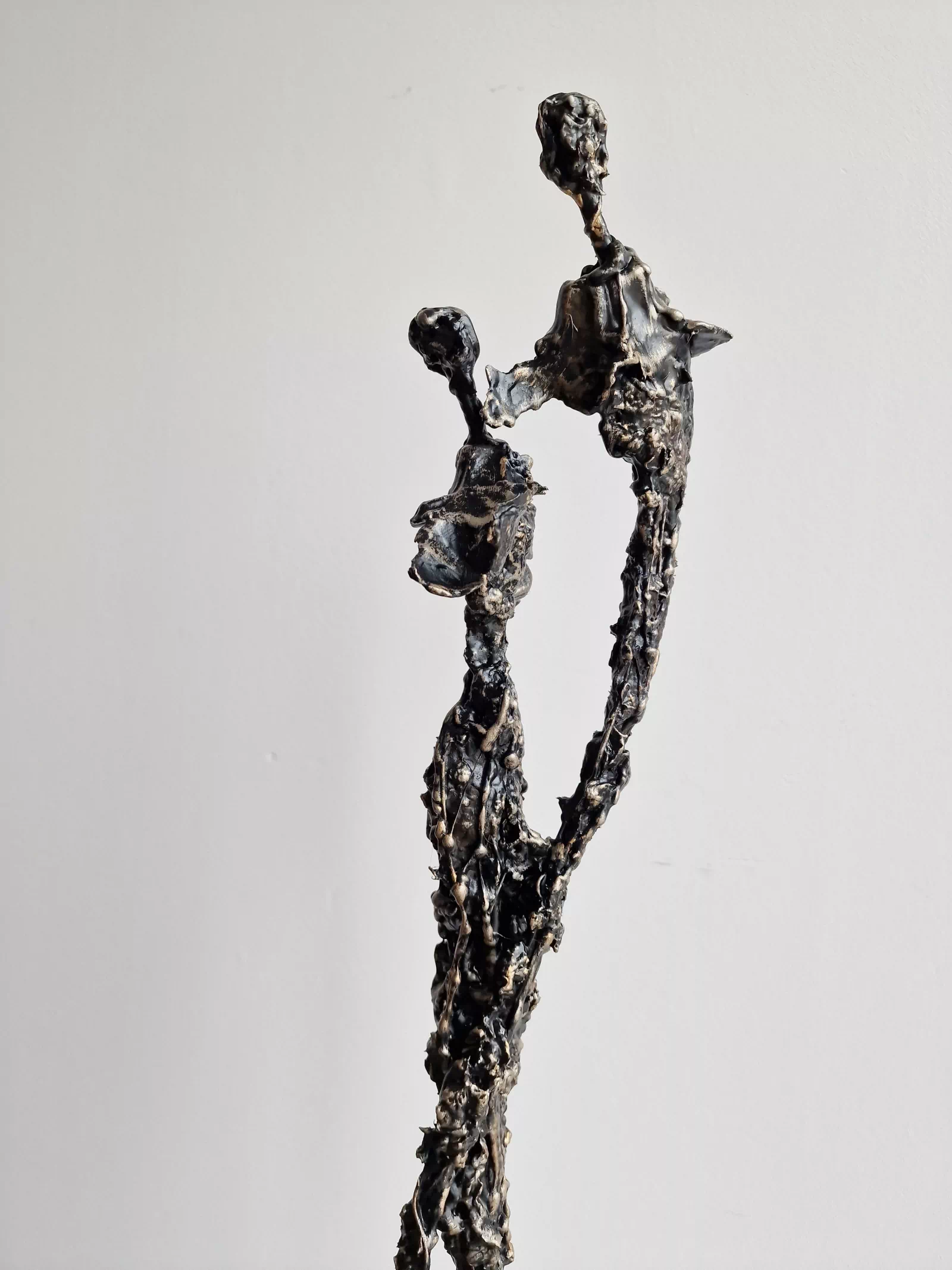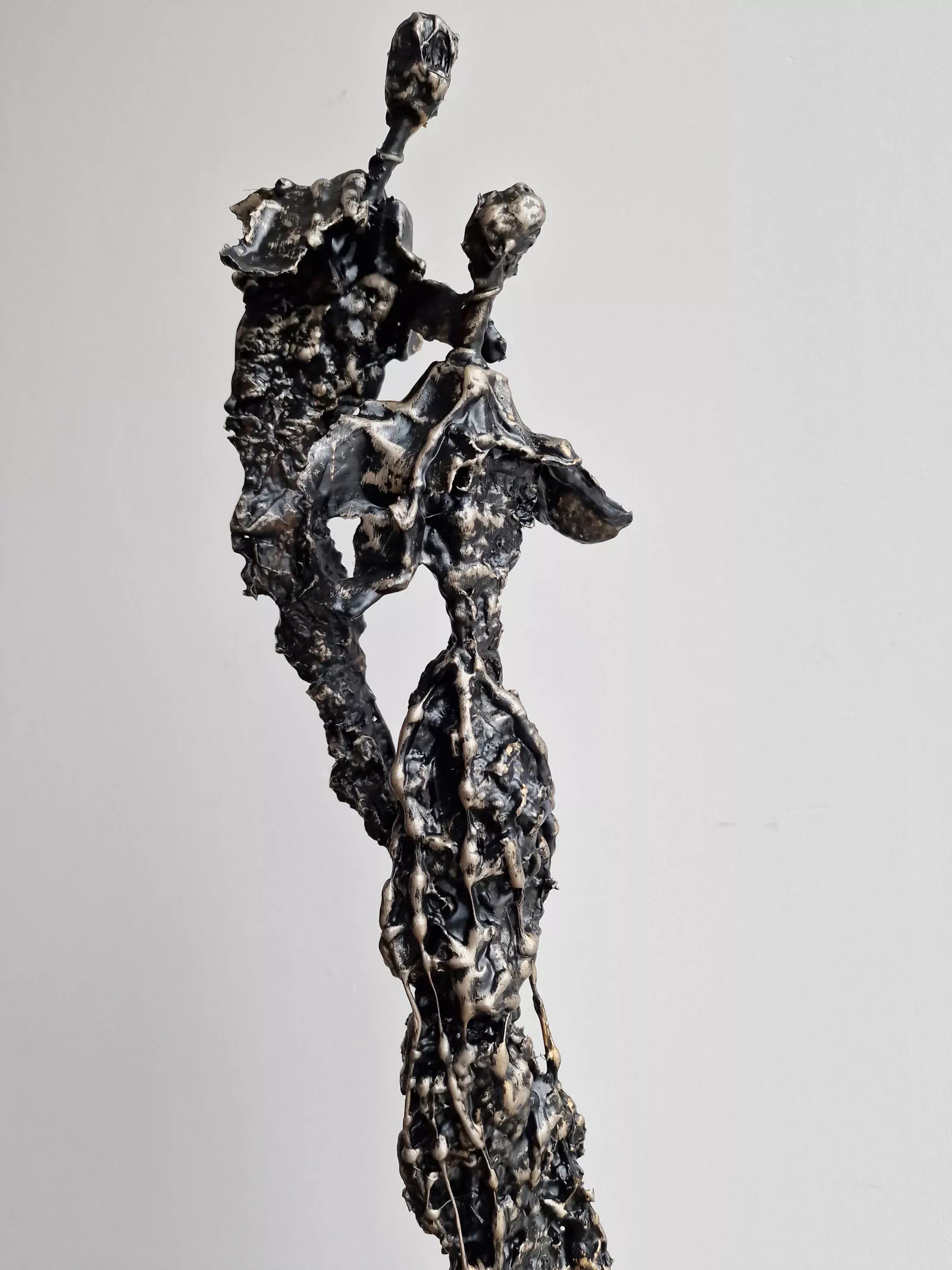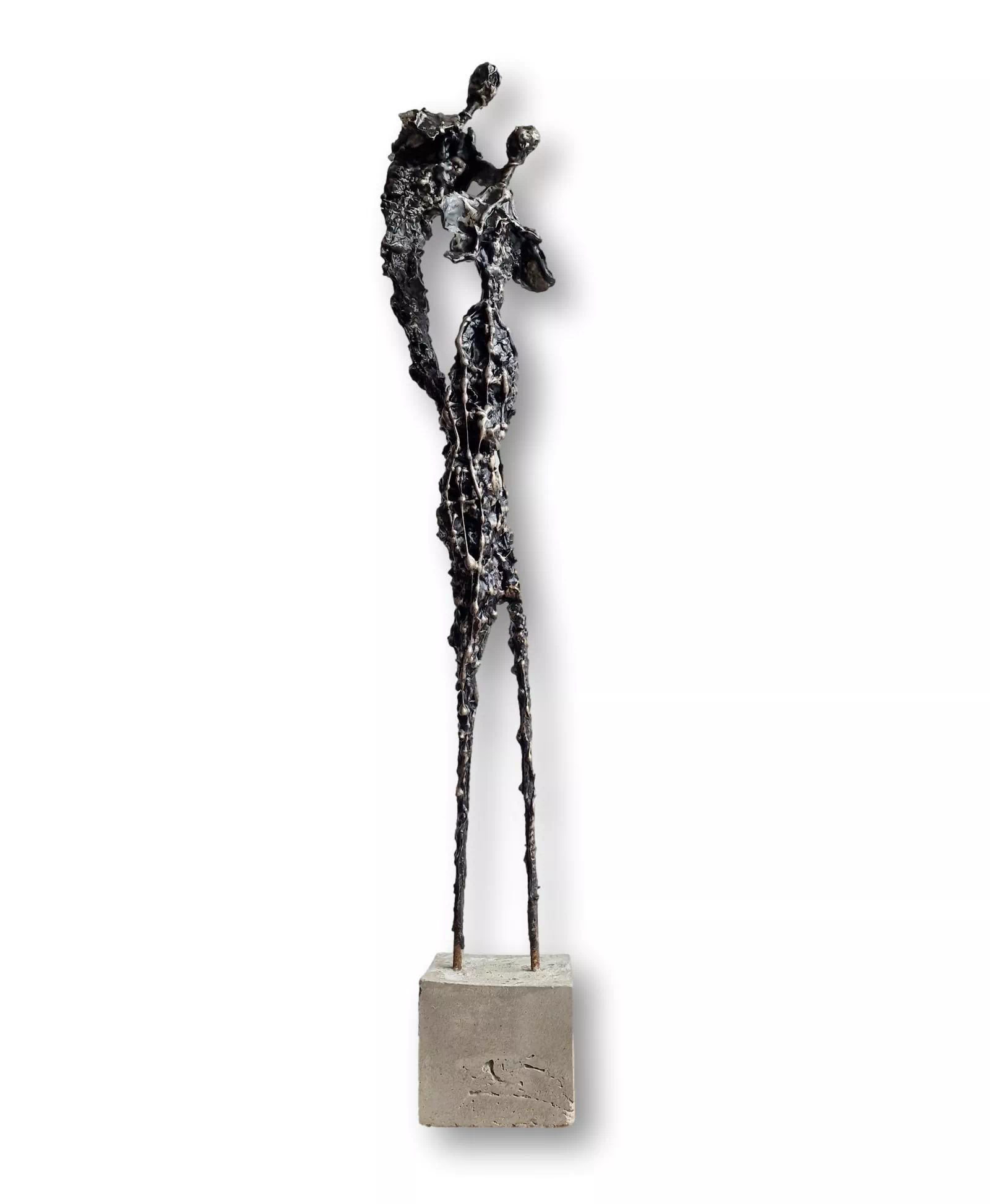 Rzeźba abstrakcyjna została wykonana z metalu, gliny i betonu. Rzeźba pary z bogatą strukturą, która nadaje jej lekkości. Cykl rzeźb nawiązuje do kolekcji obrazów i grafik Point od Balance. Rzeźba jest niezwykle osobliwa również ze względu na efekt jaki wywołuje oglądana z bliska, z uwagi na bogactwo szczegółów i szlachetność wykończenia. Forma i design rzeźby podkreślą charakter nowoczesnego salonu lub gabinetu. Motyw kamiennych postaci został przeniesiony do formy przestrzennej. Biomorficzne kształty nawiązujące do ludzkich sylwetek wyrażają emocje i relacje jakie dzielimy z innymi. Rzeźba ma nowoczesną formę, surowość materiałów z jakich została wykonana, łączenia i spawy została złagodzona plastycznością gliny i masy z sproszkowanego kamienia. Użyta kolorystyka uwydatnia charakter rzeźby.