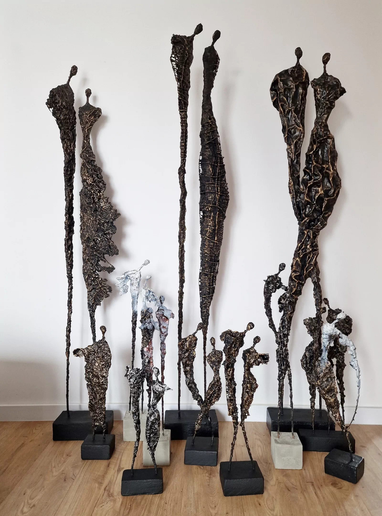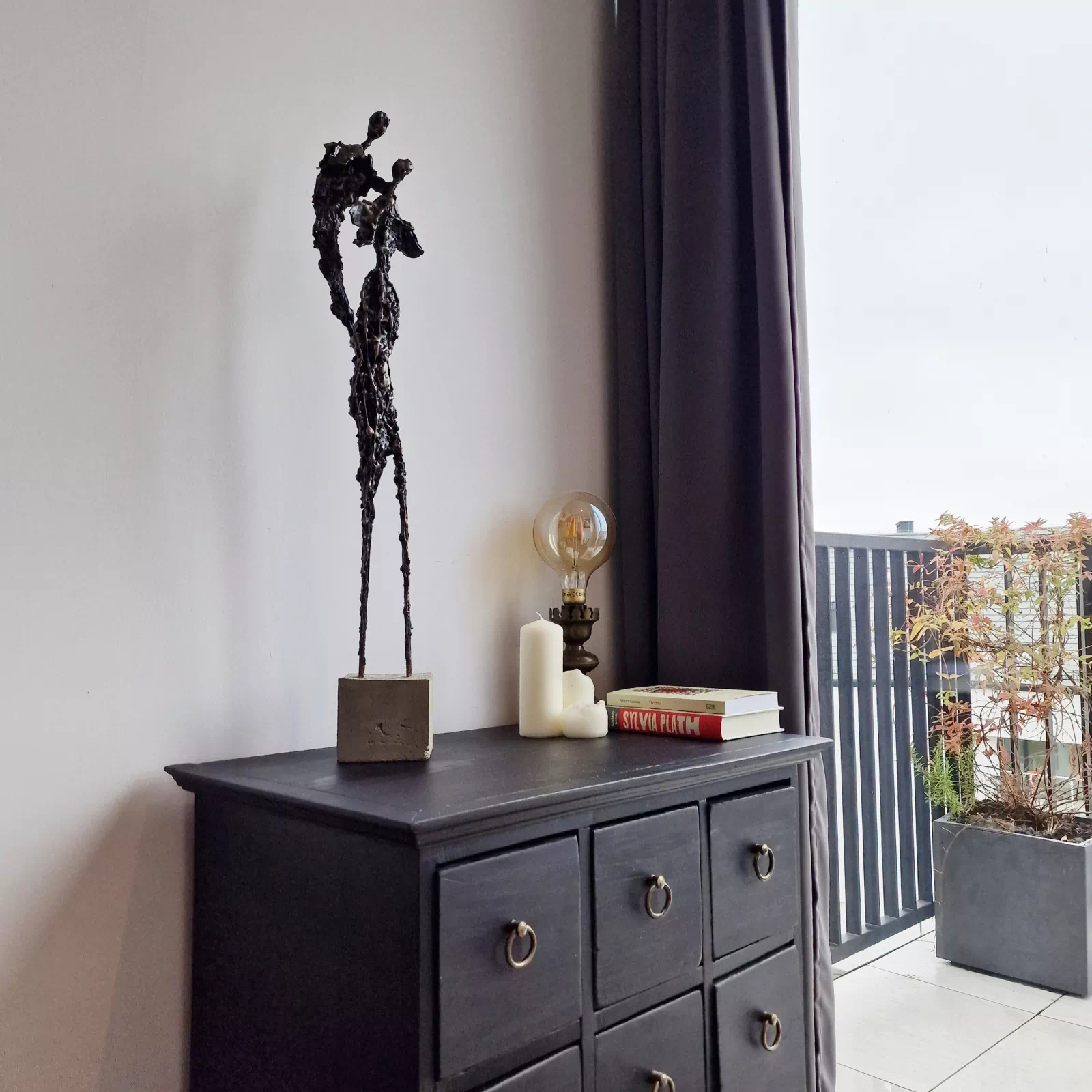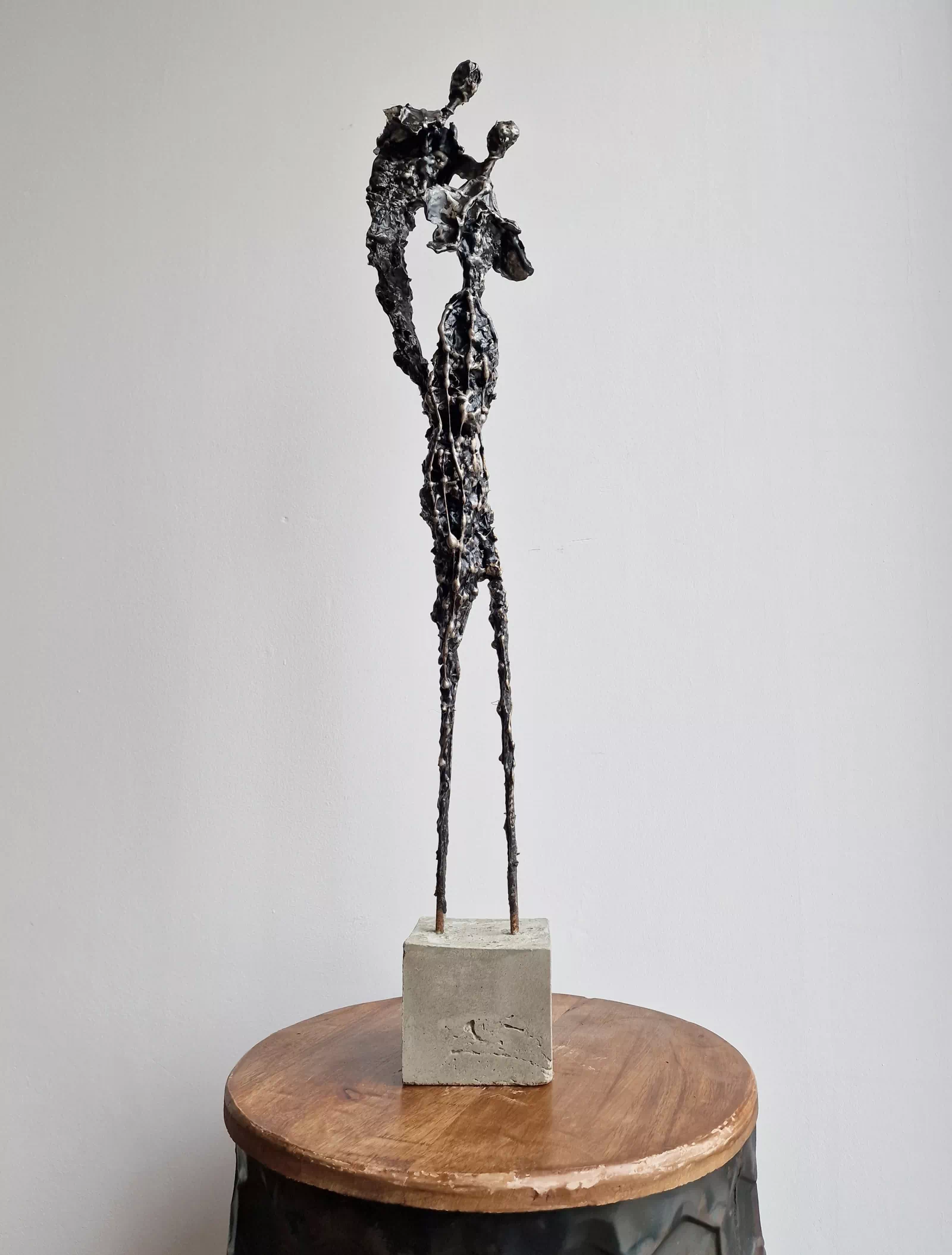 Rzeźba abstrakcyjna została wykonana z metalu, gliny i betonu. Rzeźba pary z bogatą strukturą, która nadaje jej lekkości. Cykl rzeźb nawiązuje do kolekcji obrazów i grafik Point od Balance. Rzeźba jest niezwykle osobliwa również ze względu na efekt jaki wywołuje oglądana z bliska, z uwagi na bogactwo szczegółów i szlachetność wykończenia. Forma i design rzeźby podkreślą charakter nowoczesnego salonu lub gabinetu. Motyw kamiennych postaci został przeniesiony do formy przestrzennej. Biomorficzne kształty nawiązujące do ludzkich sylwetek wyrażają emocje i relacje jakie dzielimy z innymi. Rzeźba ma nowoczesną formę, surowość materiałów z jakich została wykonana, łączenia i spawy została złagodzona plastycznością gliny i masy z sproszkowanego kamienia. Użyta kolorystyka uwydatnia charakter rzeźby.