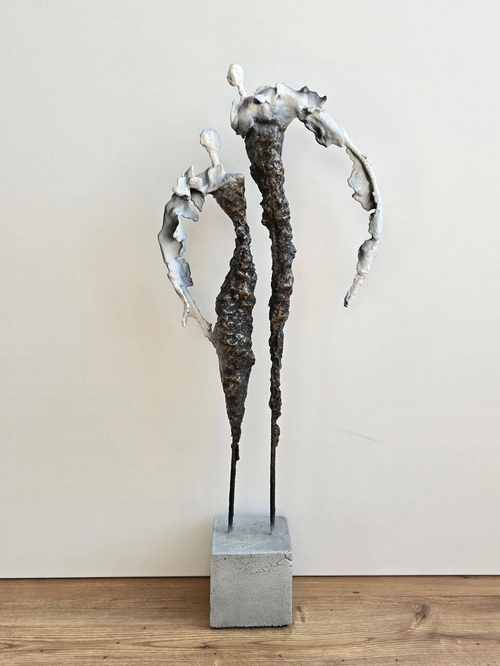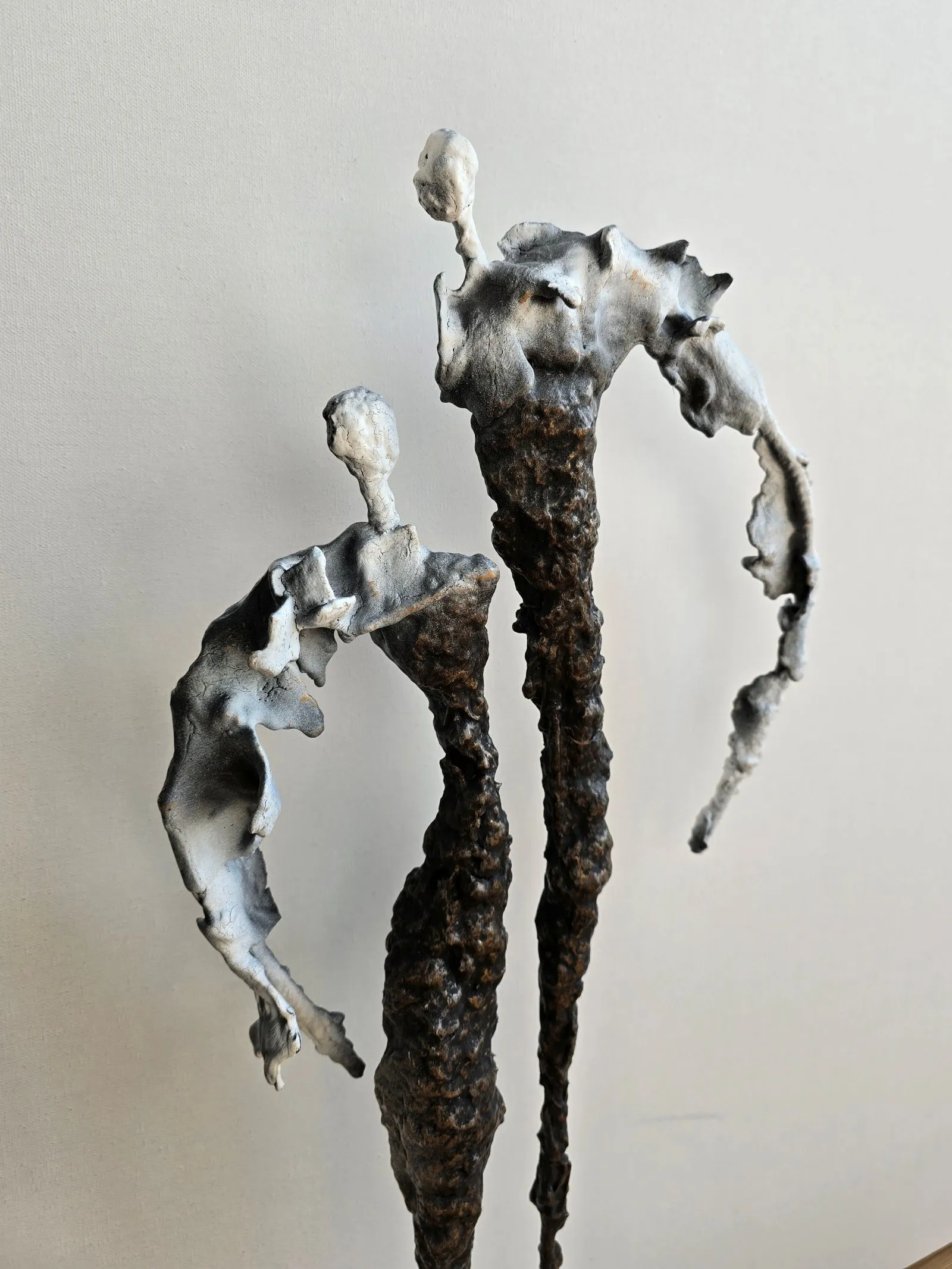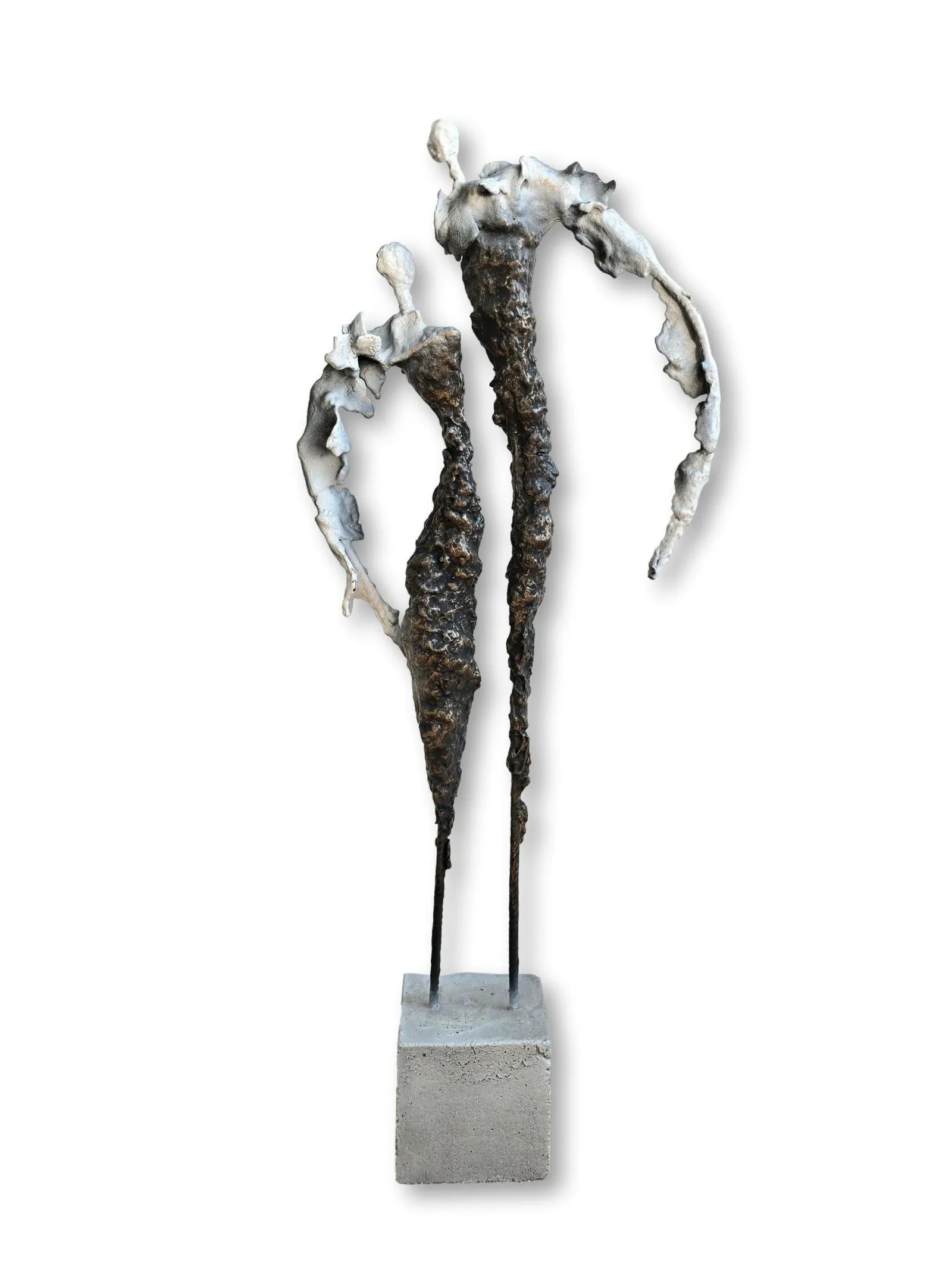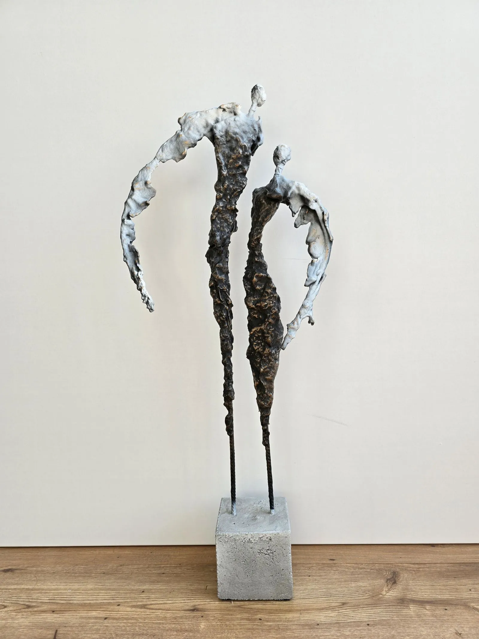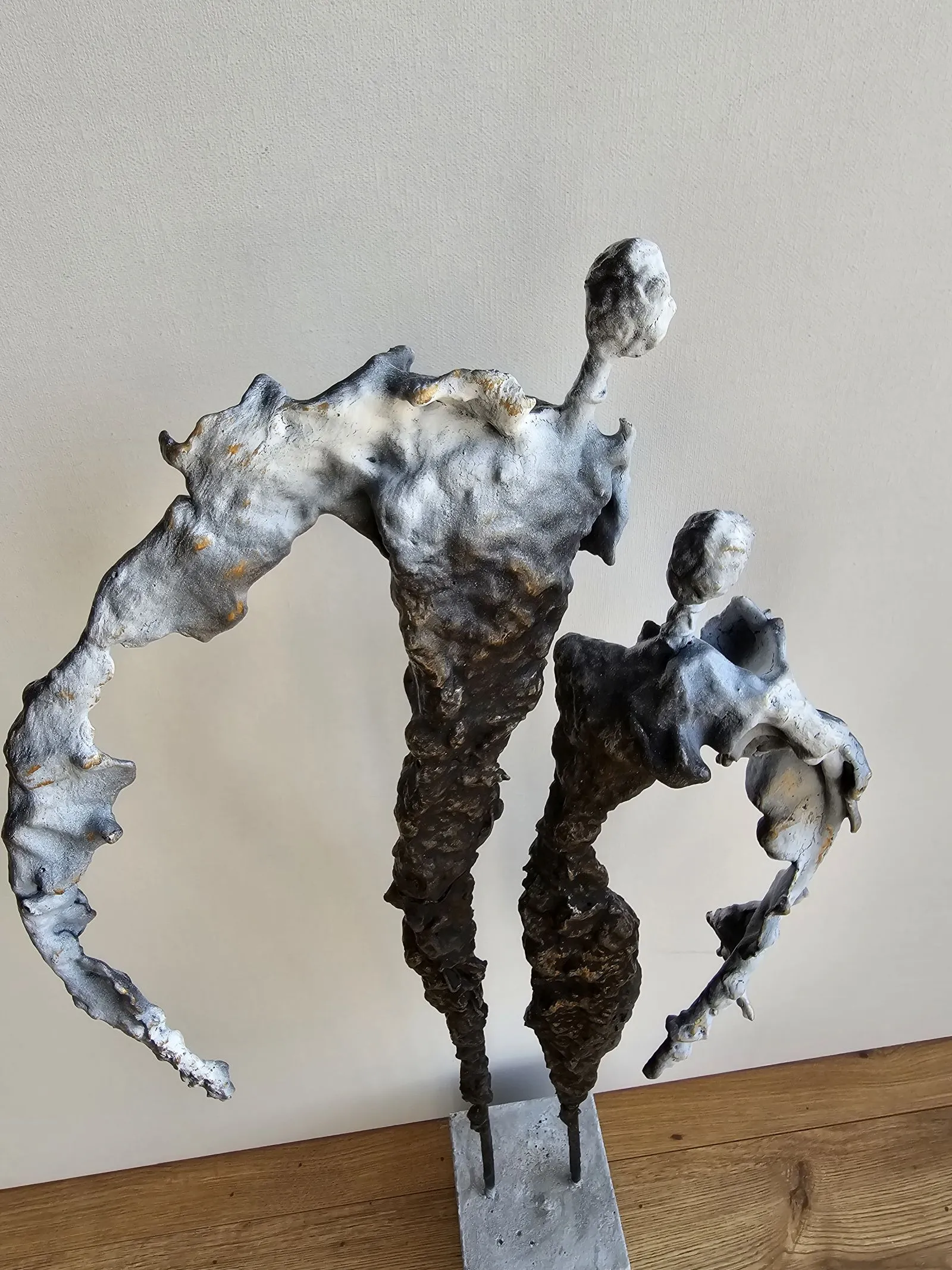 Rzeźba abstrakcyjna została wykonana z metalu, gliny i betonu. Rzeźba pary z bogatą strukturą, która nadaje jej lekkości.  Cykl rzeźb nawiązuje do kolekcji obrazów i grafik Point od Balance. Rzeźba jest niezwykle osobliwa również ze względu na efekt jaki wywołuje oglądana z bliska, z uwagi na bogactwo szczegółów i szlachetność wykończenia. Forma i design rzeźby podkreślą charakter nowoczesnego salonu lub gabinetu. Motyw kamiennych postaci został przeniesiony do formy przestrzennej. Biomorficzne kształty nawiązujące do ludzkich sylwetek wyrażają emocje i relacje jakie dzielimy z innymi. Rzeźba ma nowoczesną formę, surowość materiałów z jakich została wykonana, łączenia i spawy została złagodzona plastycznością gliny i masy z sproszkowanego kamienia. Użyta kolorystyka uwydatnia charakter rzeźby.