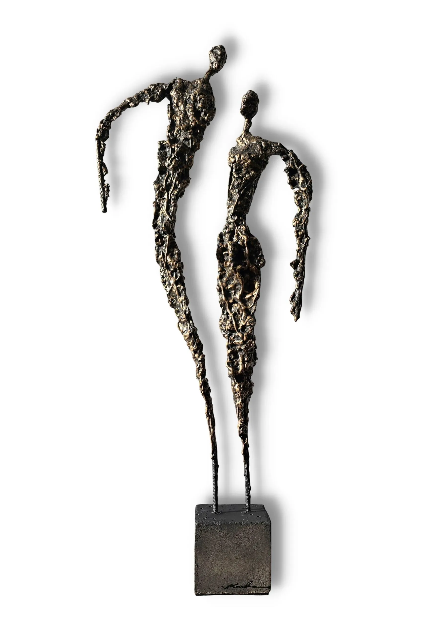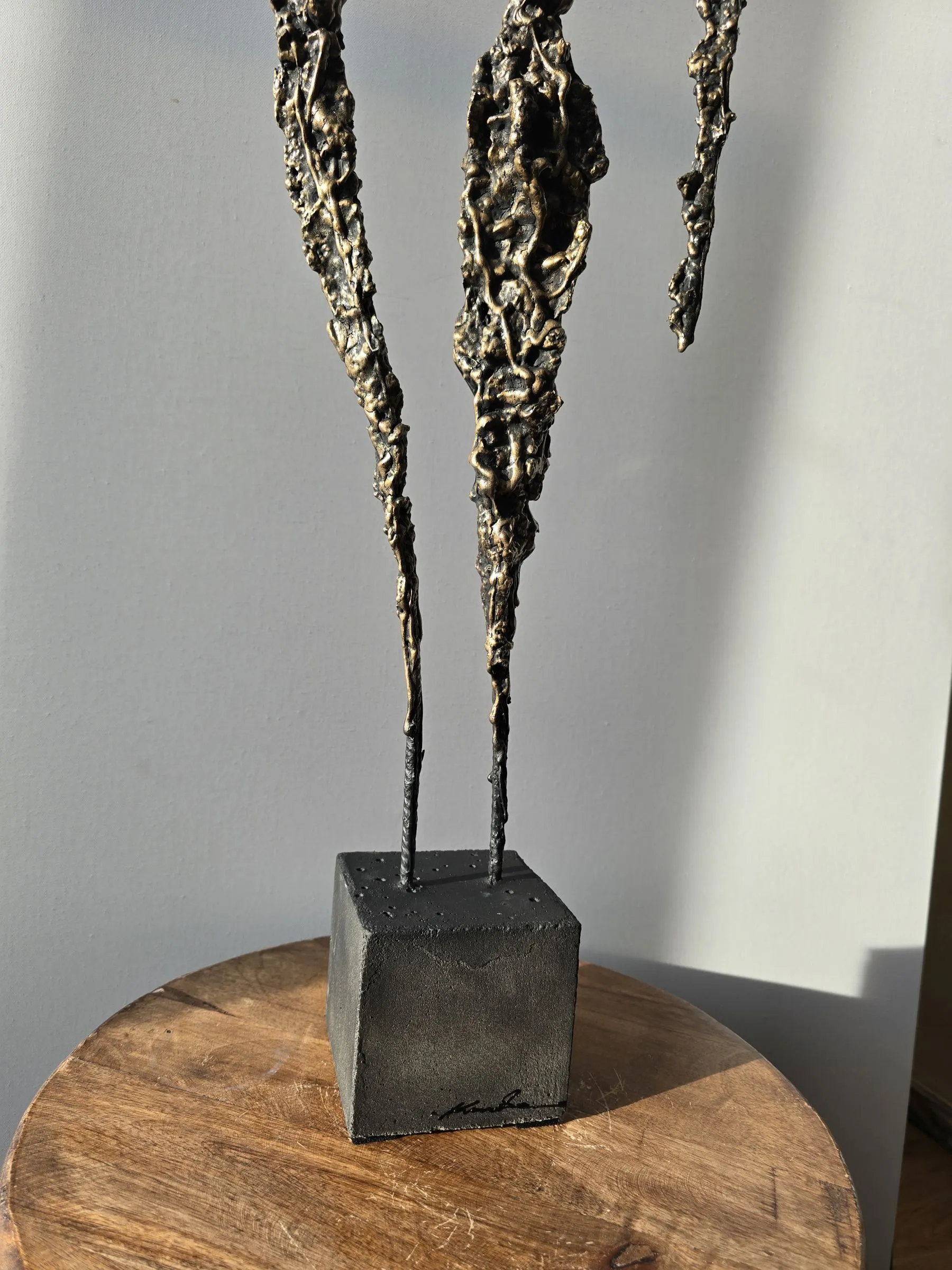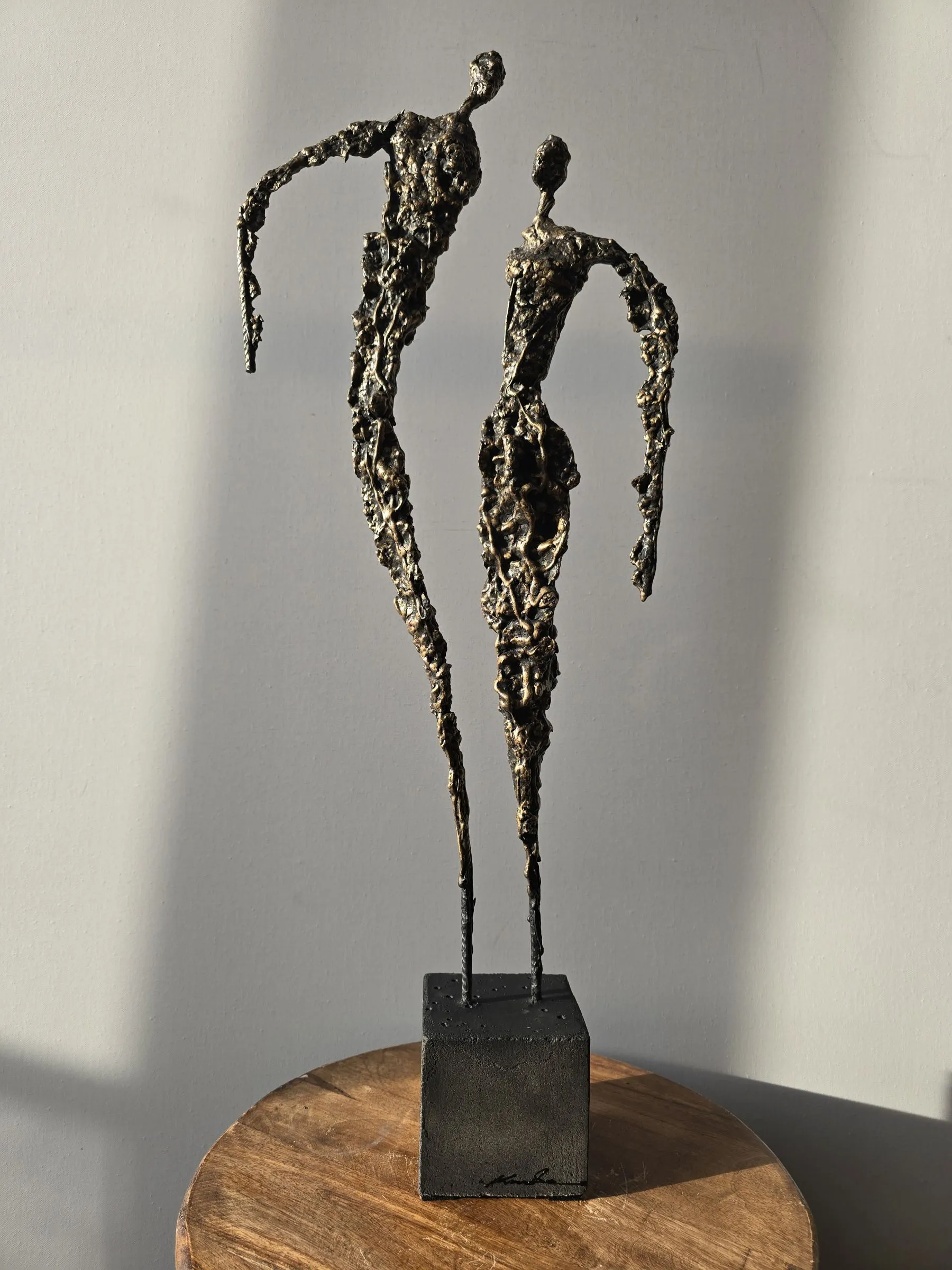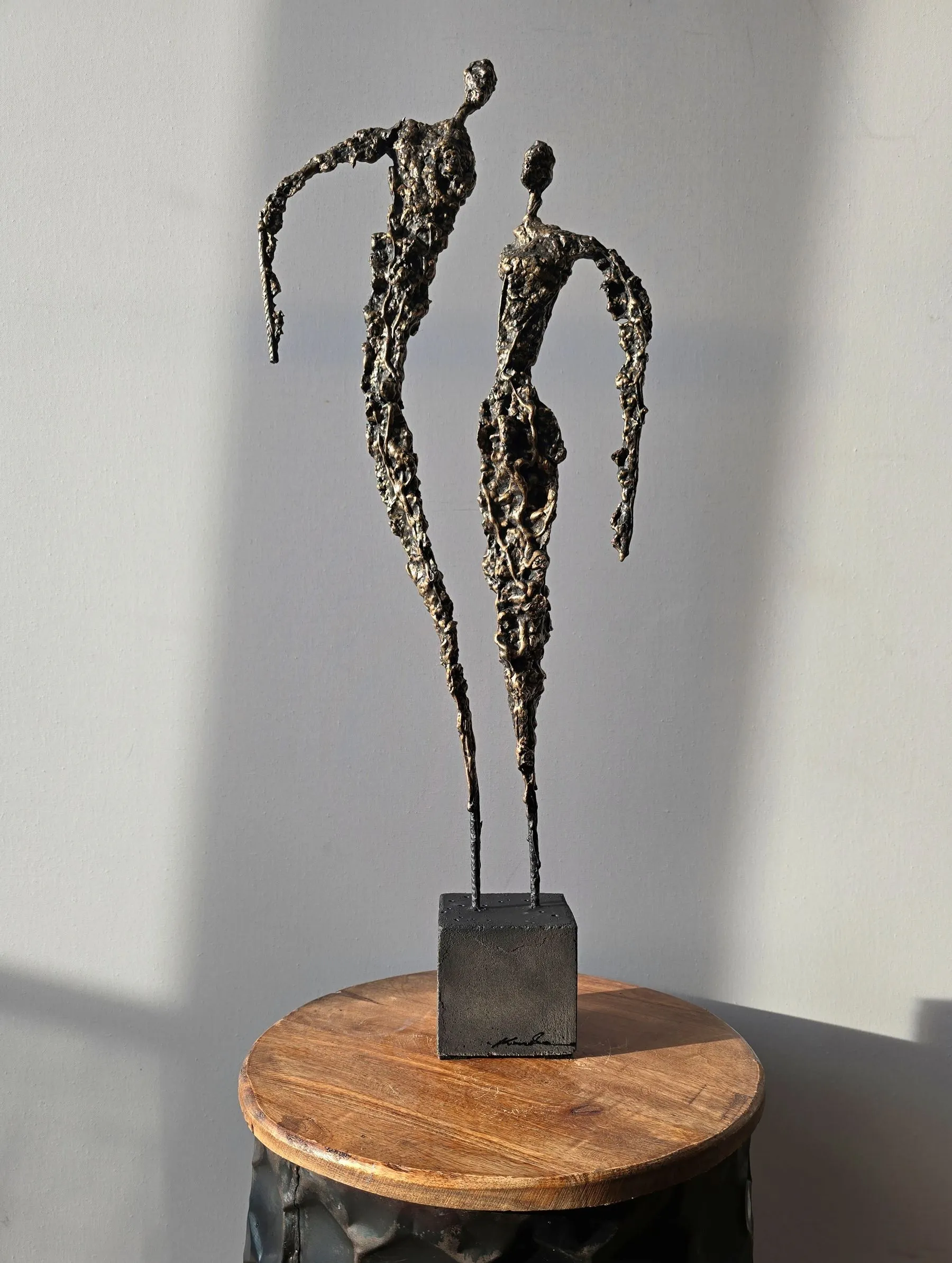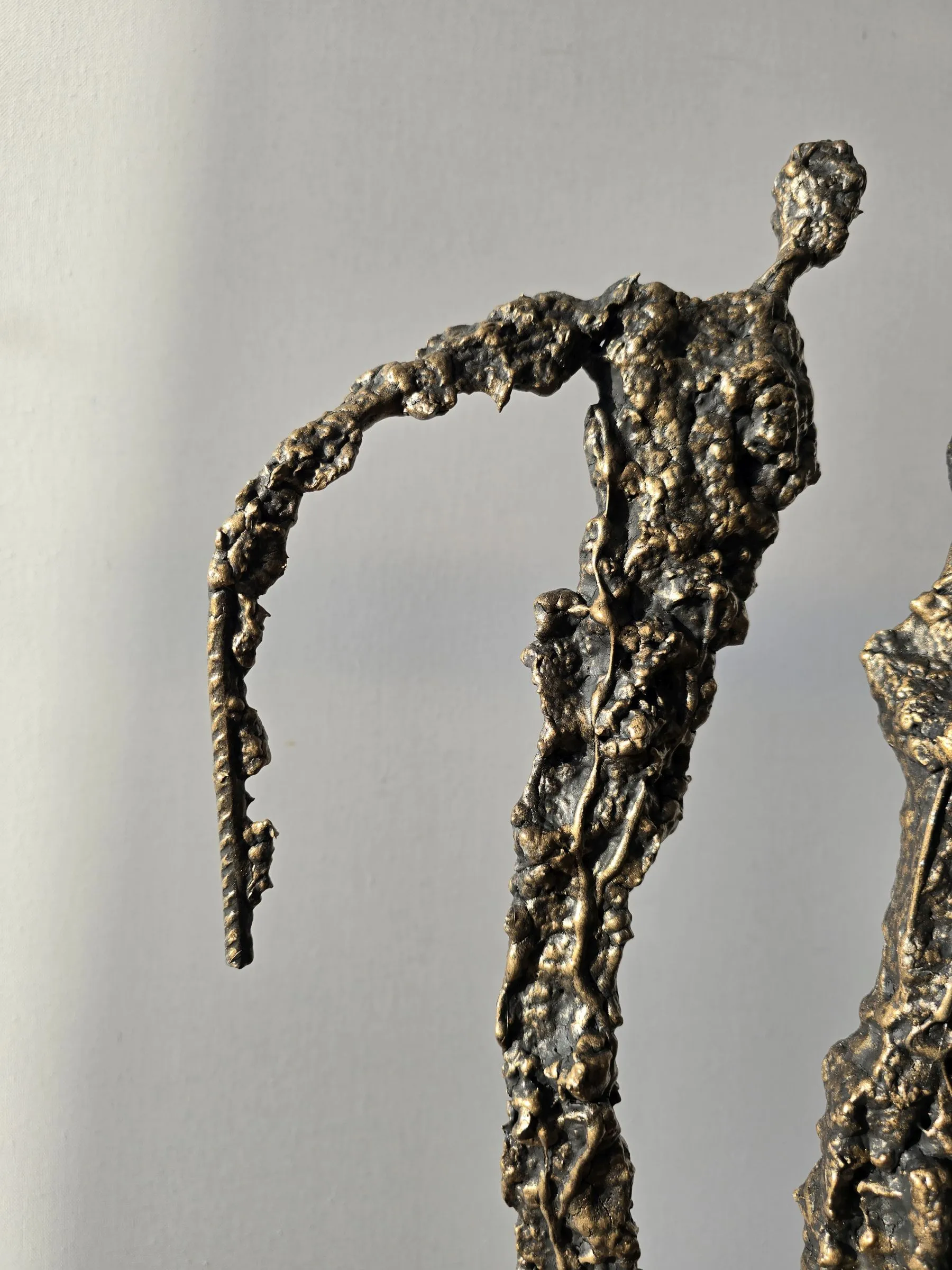 Rzeźba buduje ten dialog kontrastem materiałów: krucha glina spotyka surowy metal, a całość osadzona jest na solidnej podstawie. To metafora związku – dynamicznego, ale zakorzenionego.