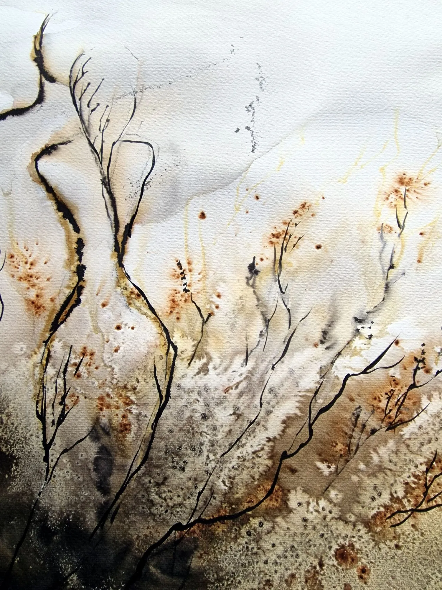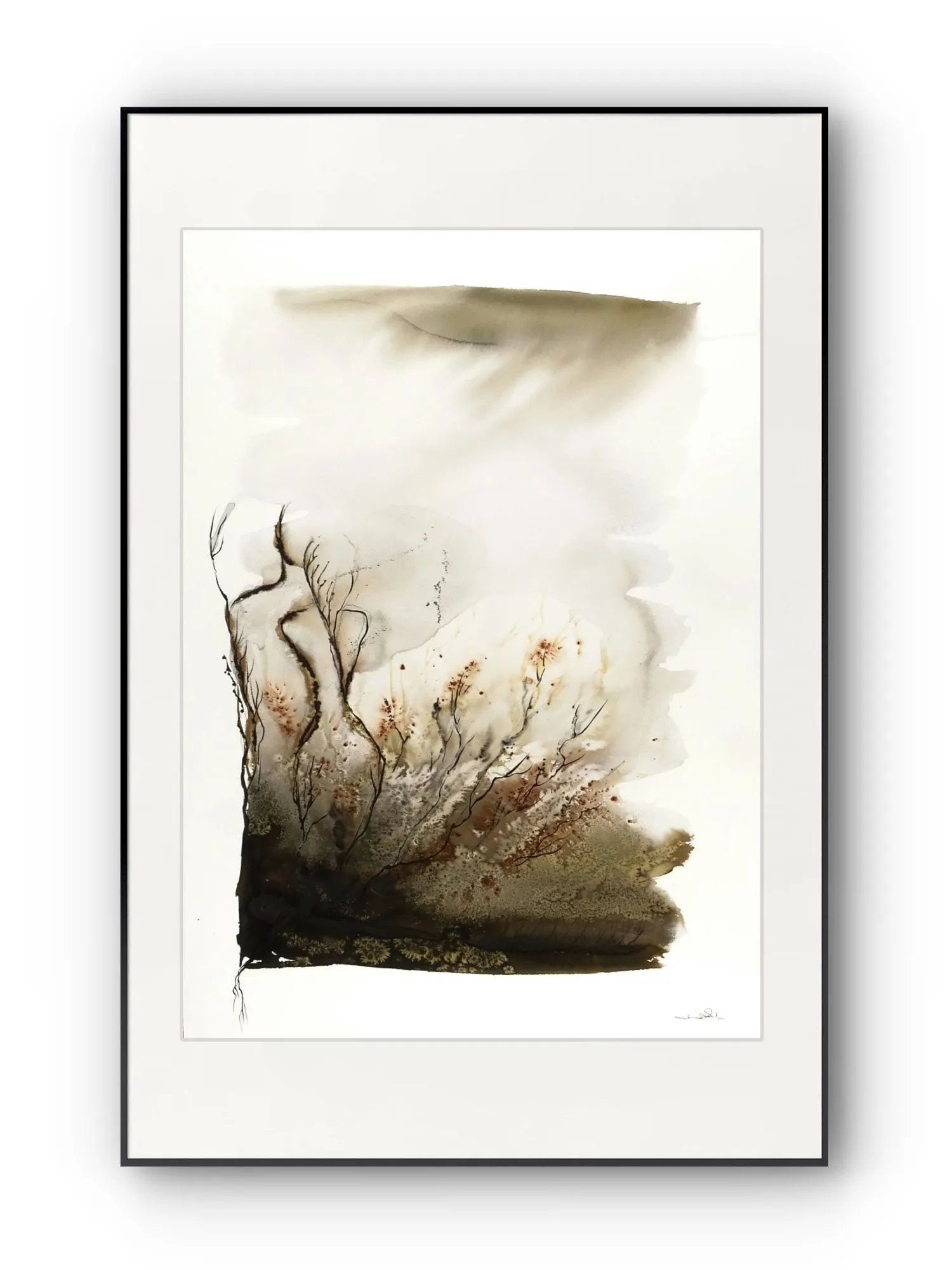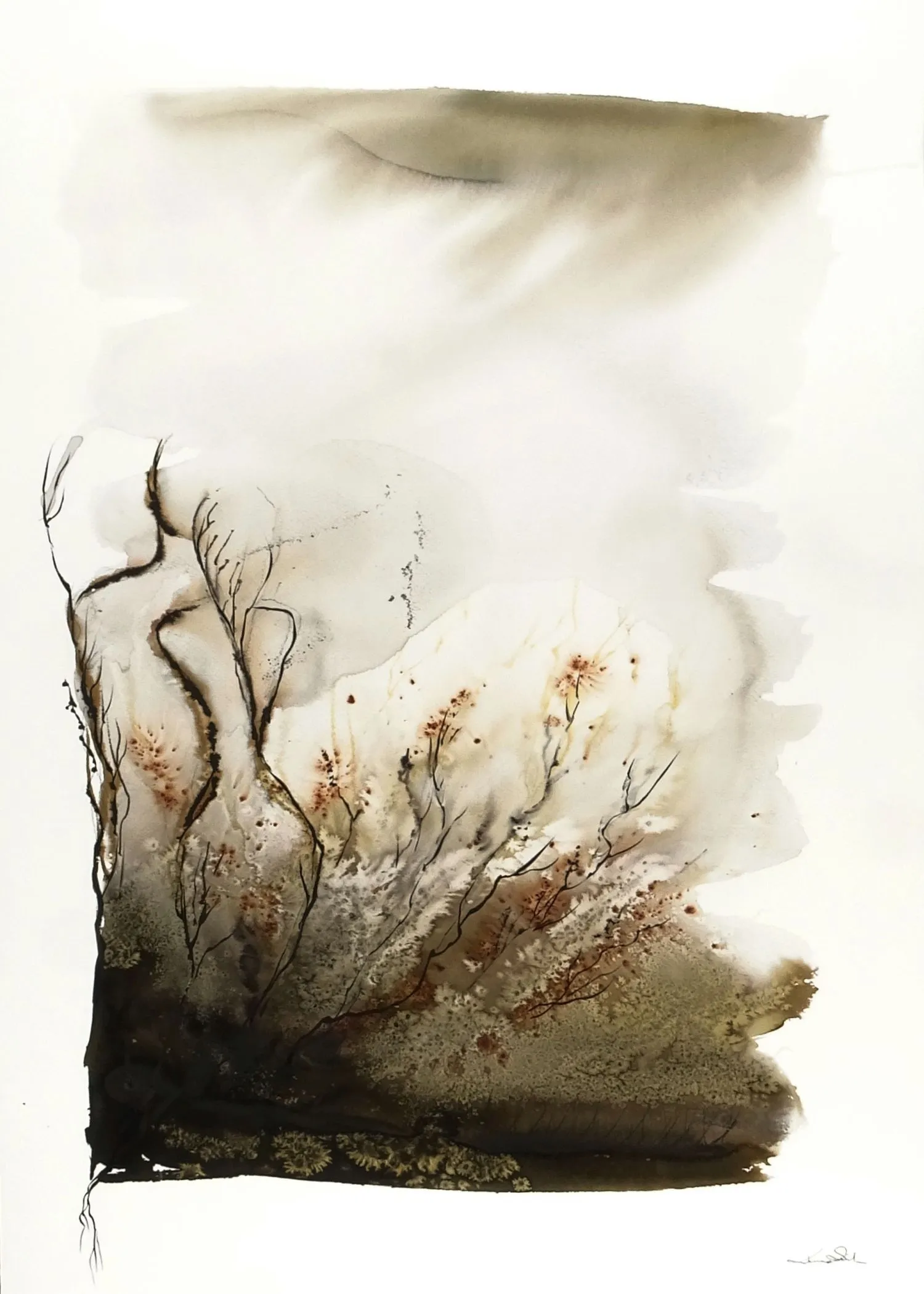 Akwarela o wyciszonym, pejzażowo-florystycznym charakterze została zbudowana z miękkich przejść ciepłych szarości, złamanych beżów, przygaszonych brązów i głębokich, niemal ziemistych akcentów. Delikatny rysunek linearny oraz oszczędna kompozycja budują obraz subtelny i kontemplacyjny, pozostawiający przestrzeń dla własnego odczytania.