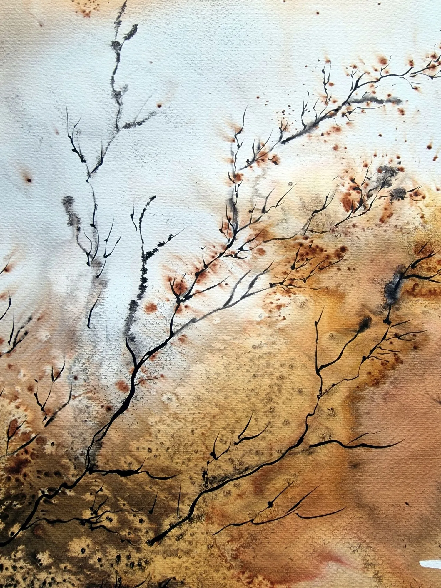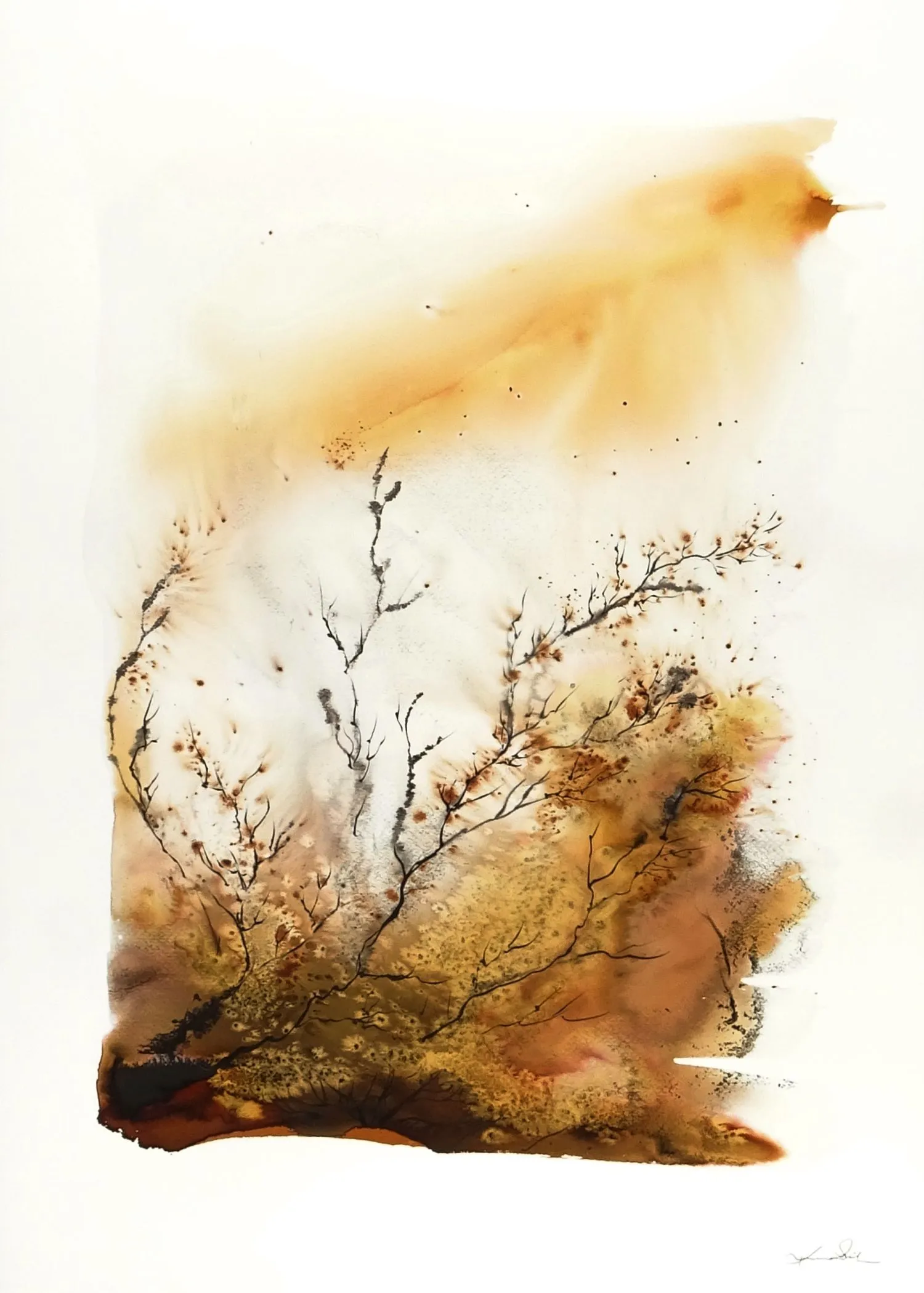 Akwarela o pejzażowym, abstrakcyjno-florystycznym charakterze została zbudowana z lekkich przejść złamanej ochry, miodowych beżów, karmelu i głębokich brązów. Swobodna plama, delikatny rysunek roślinnych linii i duża ilość światła tworzą kompozycję organiczną, wyciszoną i otwartą, pozostawiającą przestrzeń dla własnych skojarzeń.