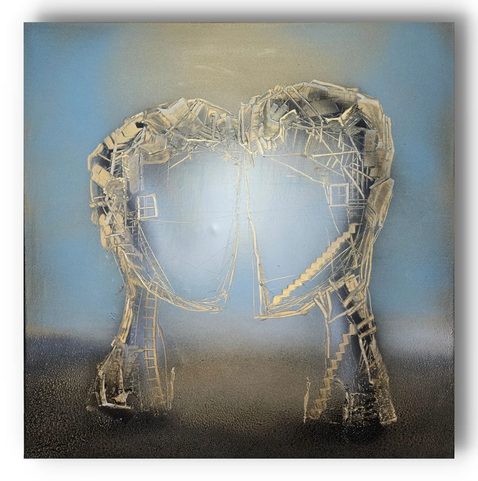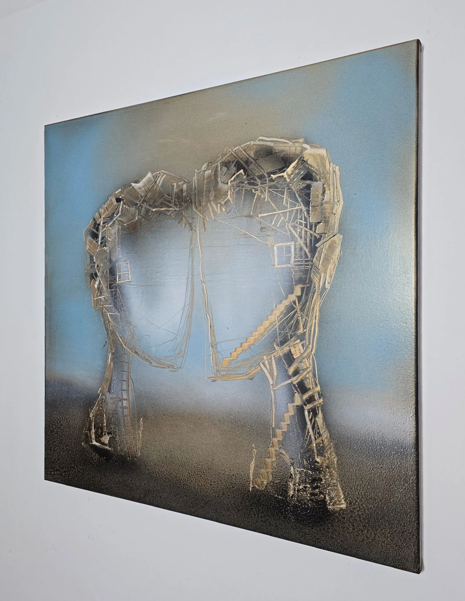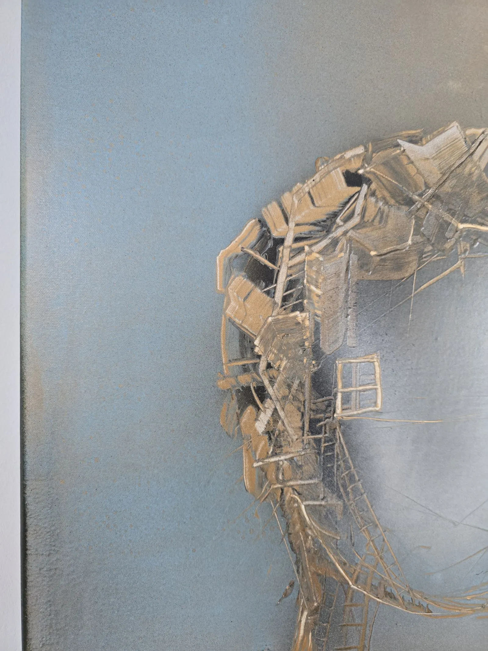 Obraz z cyklu Sploty (80x80 cm) ukazuje dwie architektoniczne, organiczne formy, które stykają się ze sobą, tworząc wizualną metaforę spotkania i połączenia. Ich struktura, zbudowana z warstw faktur, linii i geometrycznych fragmentów, przypomina zarówno architektoniczne konstrukcje, jak i tkankę żywą – delikatną, a jednocześnie silną. W przestrzeni między nimi rodzi się napięcie – most, nić, dialog, który nadaje sens obu strukturom. To dzieło opowiada o wzajemnym oddziaływaniu, bliskości i zależności – o tym, jak każdy splot relacji tworzy nową, unikalną całość.