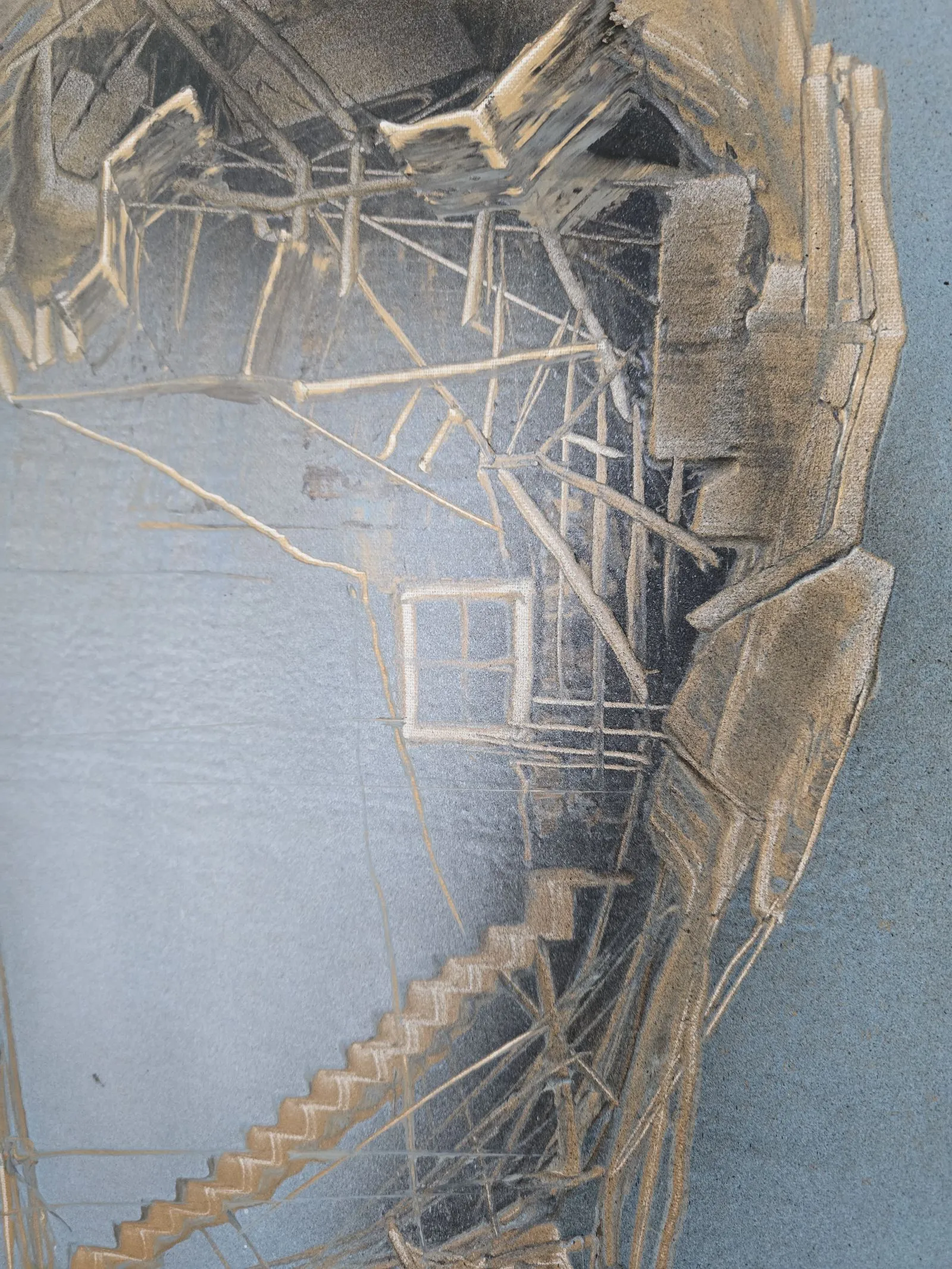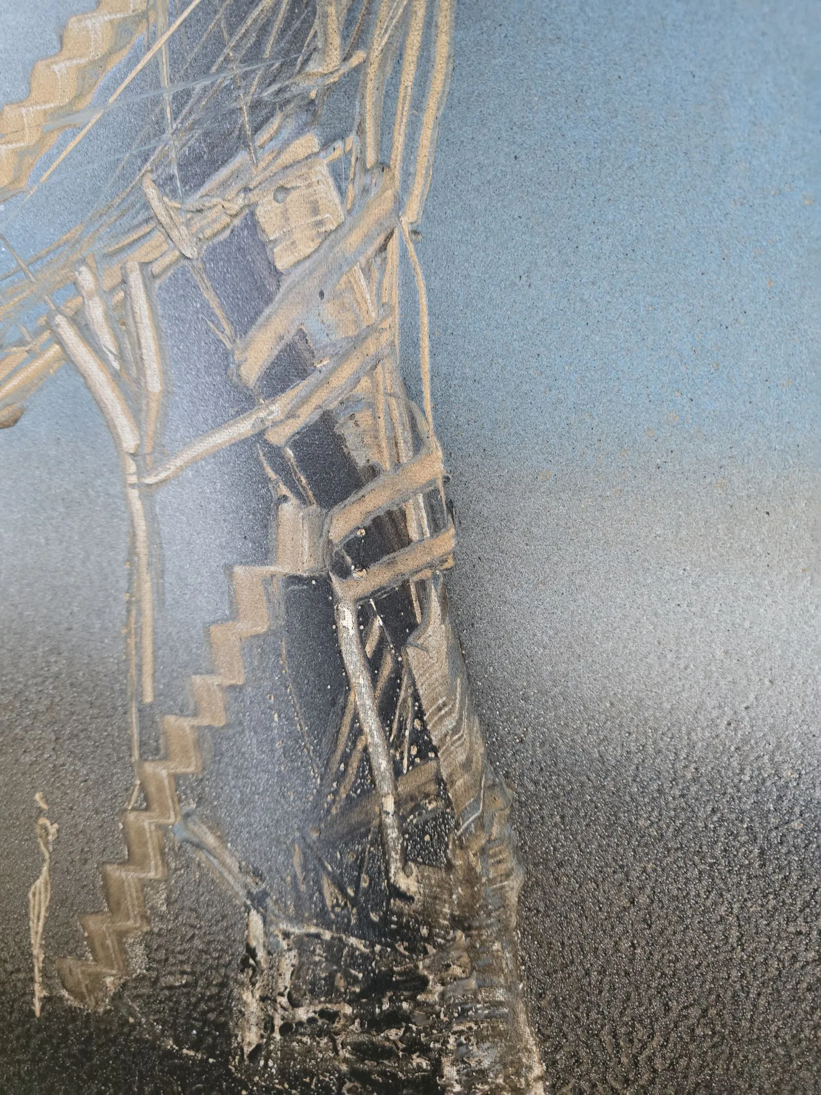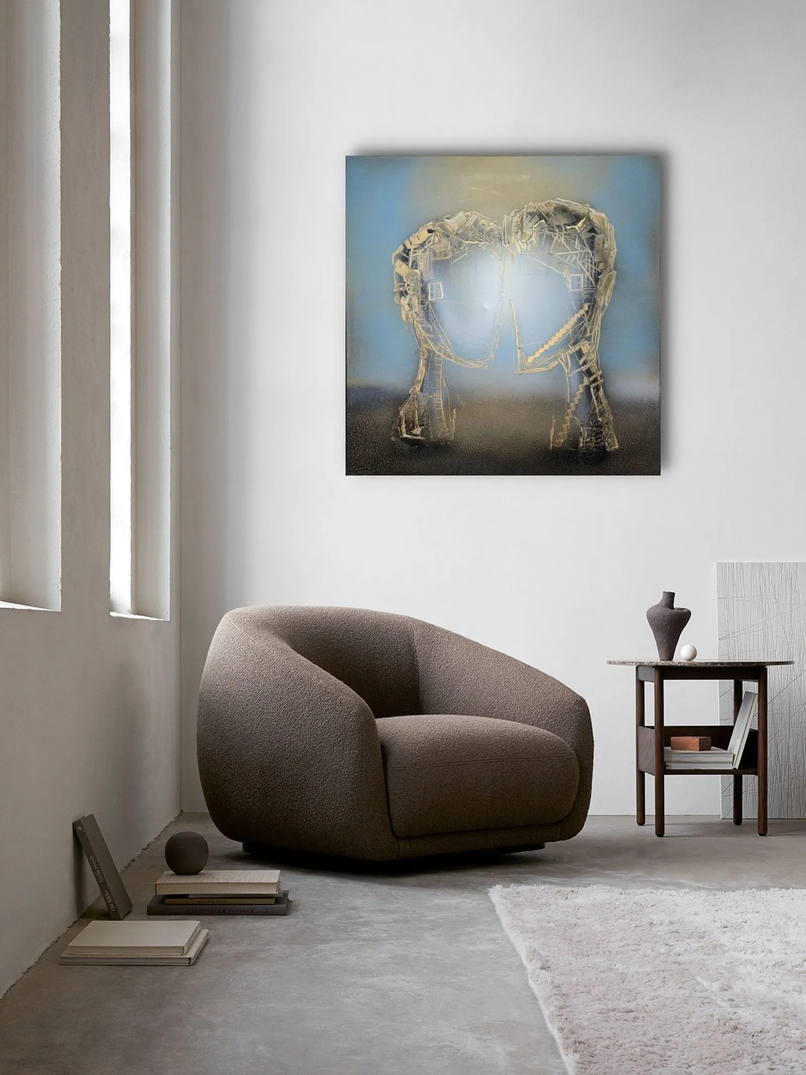 Obraz z cyklu Sploty (80x80 cm) ukazuje dwie architektoniczne, organiczne formy, które stykają się ze sobą, tworząc wizualną metaforę spotkania i połączenia. Ich struktura, zbudowana z warstw faktur, linii i geometrycznych fragmentów, przypomina zarówno architektoniczne konstrukcje, jak i tkankę żywą – delikatną, a jednocześnie silną. W przestrzeni między nimi rodzi się napięcie – most, nić, dialog, który nadaje sens obu strukturom. To dzieło opowiada o wzajemnym oddziaływaniu, bliskości i zależności – o tym, jak każdy splot relacji tworzy nową, unikalną całość.