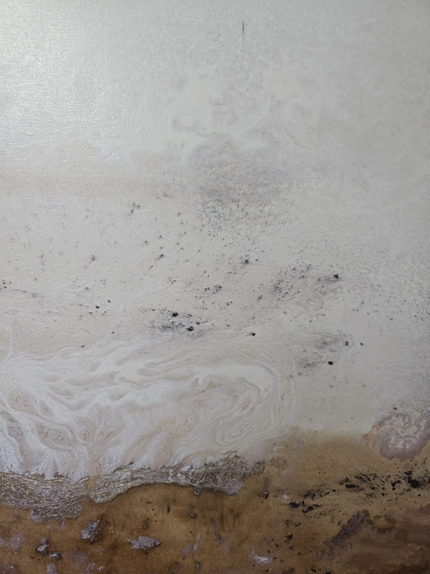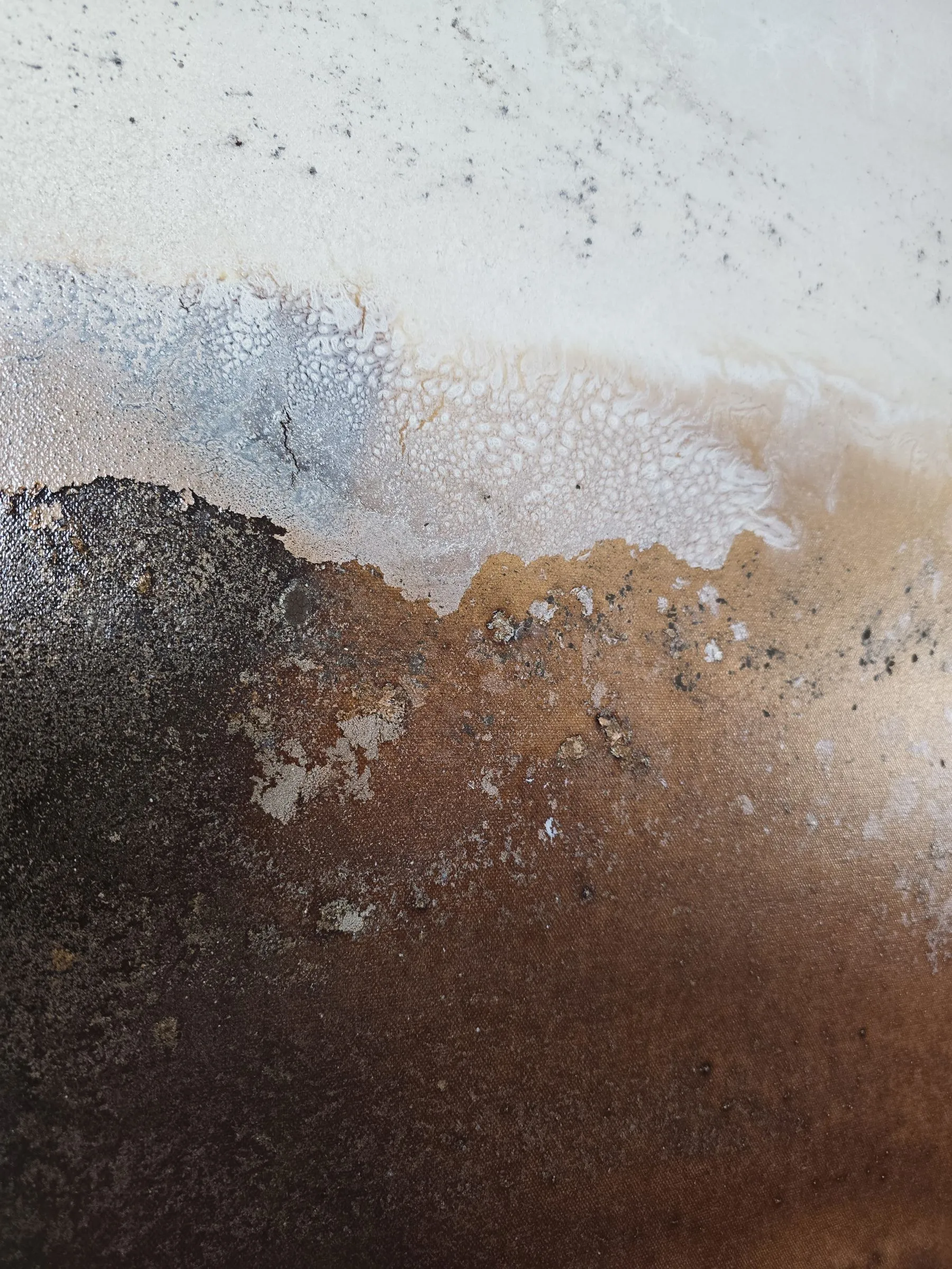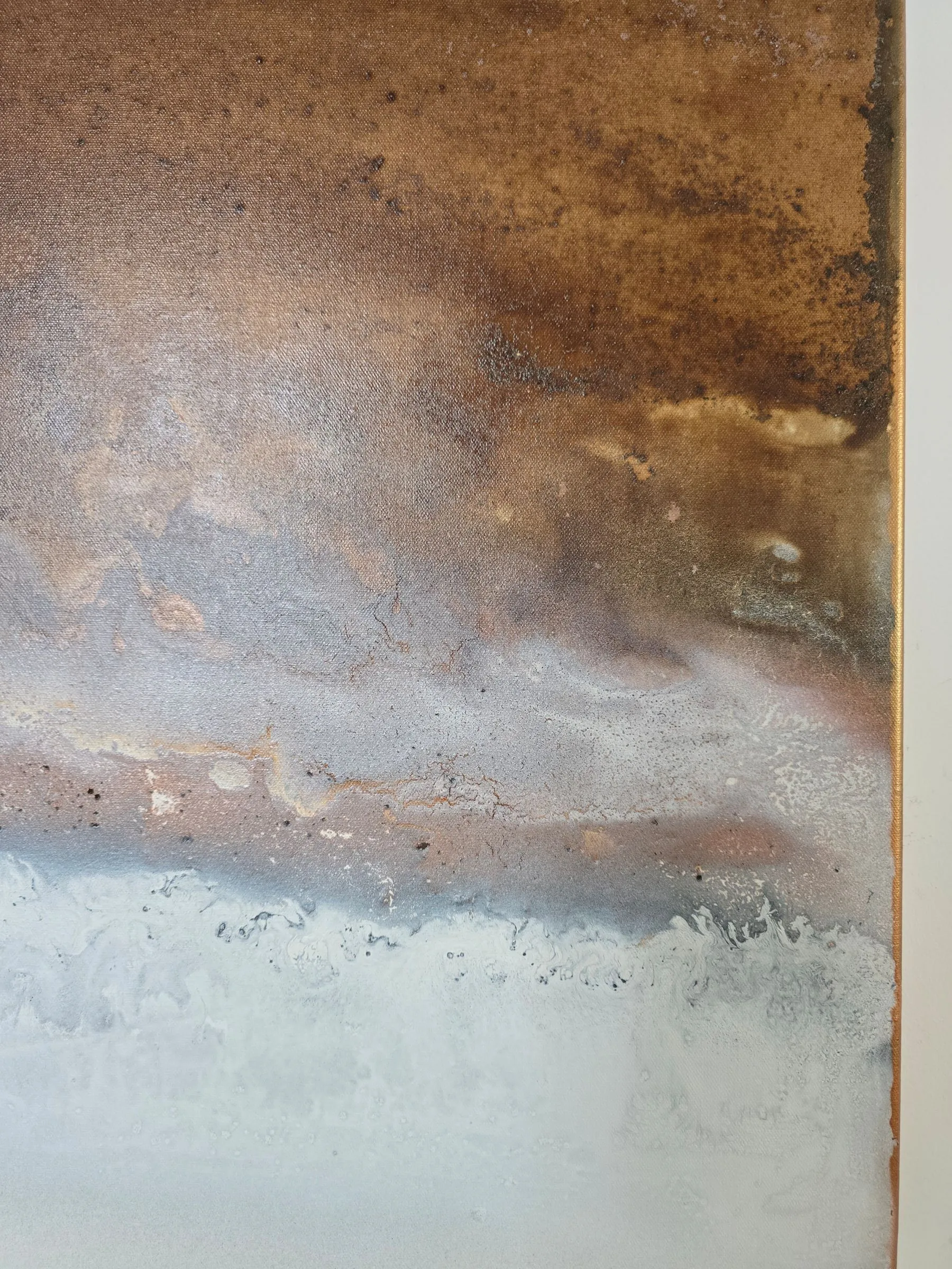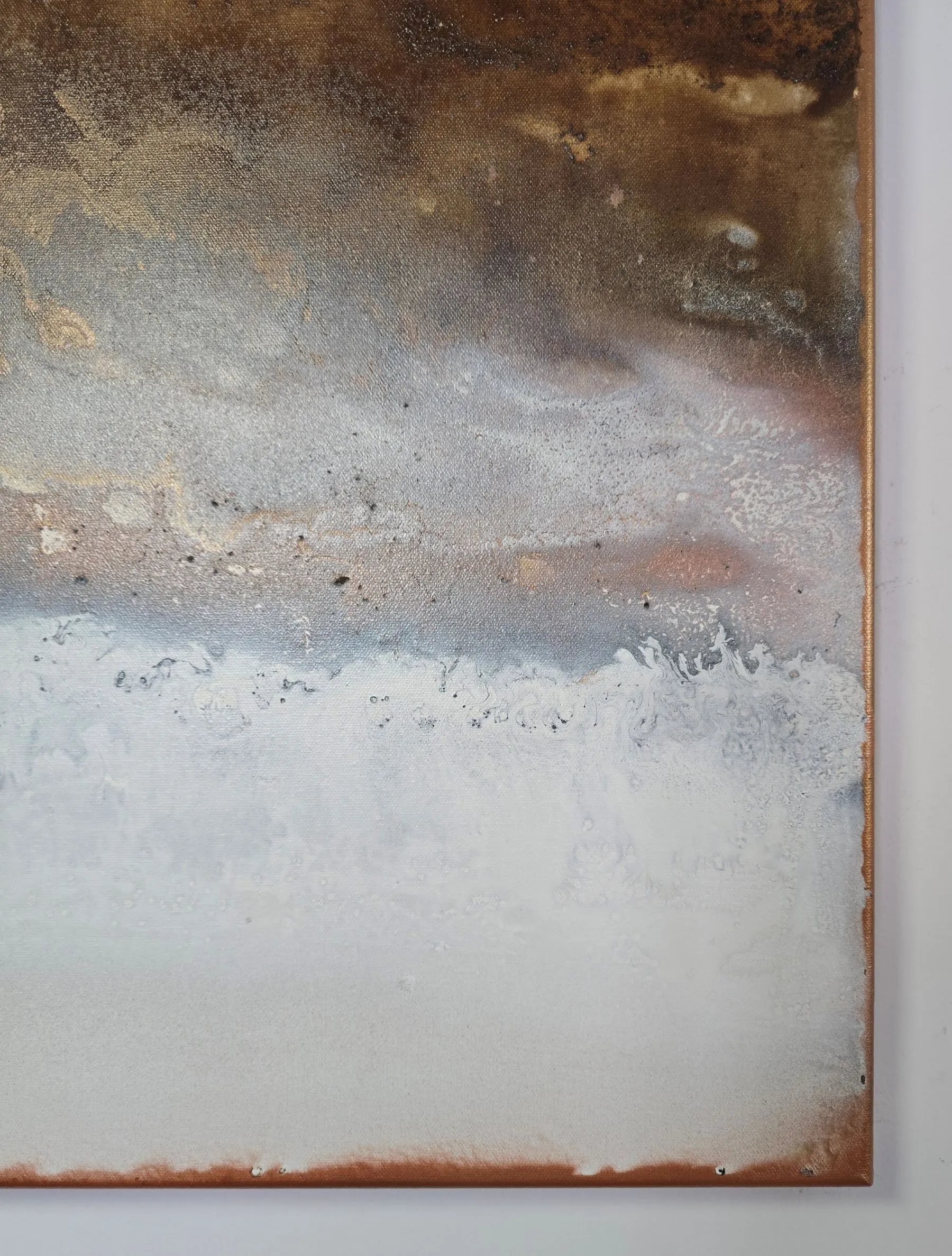 Kolory: złamana biel, miedź, jasny beż, piaskowy ton, przydymiony brąz, umbry i subtelne przejścia grafitu. Subtelna faktura zmienia się w zależności od oświetlenia i kąta patrzenia. Obraz został sfotografowany w różnych warunkach oświetlenia, by oddać jego złożoną paletę i teksturę.
