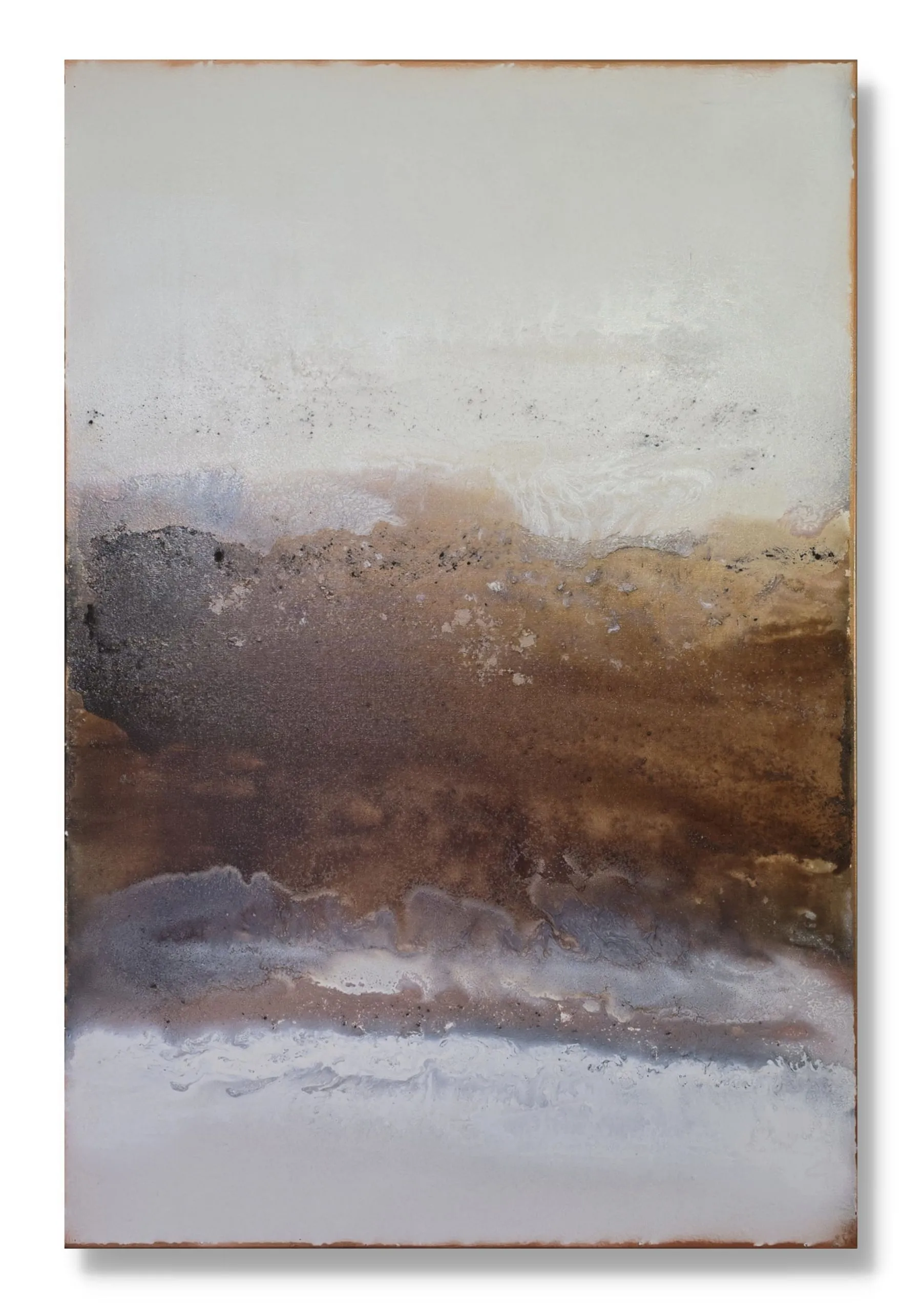 Ta kompozycja opiera się na spokojnym napięciu między jasną, rozświetloną przestrzenią a szerokim, ziemistym pasmem materii prowadzonym przez środek obrazu. Miękkie przejścia bieli, przygaszonych brązów, miedzi i beżów nadają jej charakter wyciszony, szlachetny i głęboko malarski. To abstrakcja o kontemplacyjnej obecności, która działa subtelnie, ale pozostaje wyraźna w odbiorze.