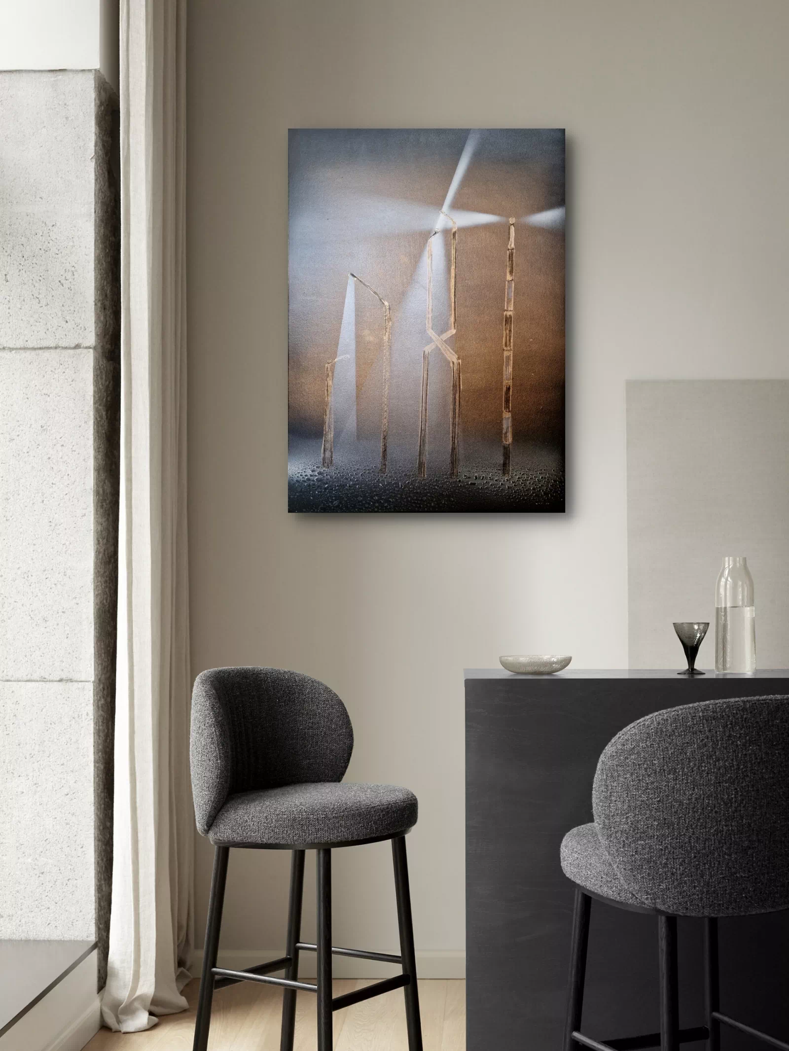 Obraz olejny na płótnie wykonany w technice mix media. Malarstwo surrealistyczne intryguje i pobudzają wyobraźnie. Obraz z bogatą strukturą farby. Nieoczywista forma wyrazu prowokuje nasz umysł, pobudza myśli i skojarzenia. Obrazy surrealistyczne celowo burzą logiczny porządek rzeczywistości, porywają do świata surrealistycznej fantazji. Forma i kolorystyka obrazu podkreśli charakter nowoczesnej przestrzeni. Idealny do białych i szarych ścian, również betonów i cegły.