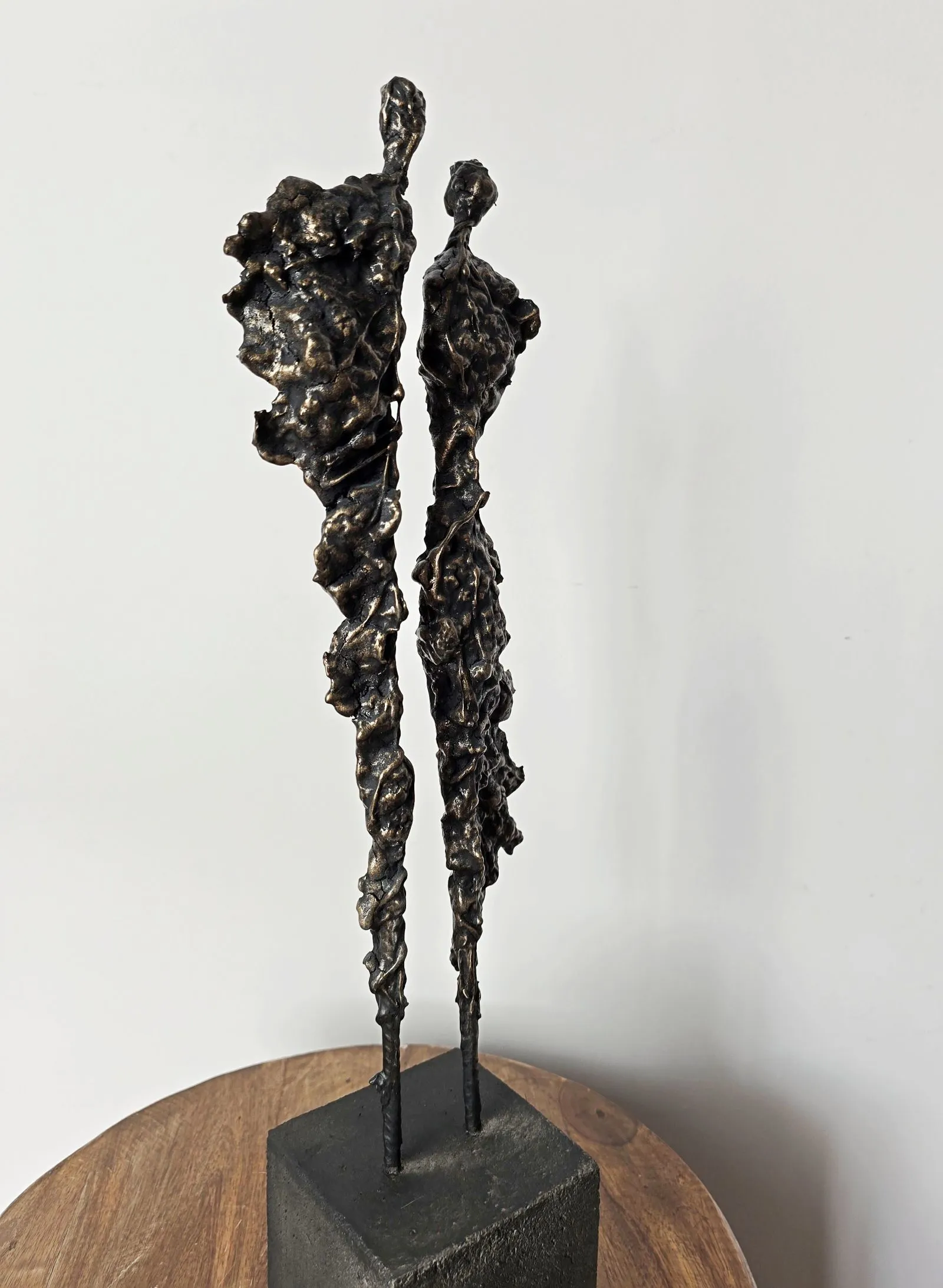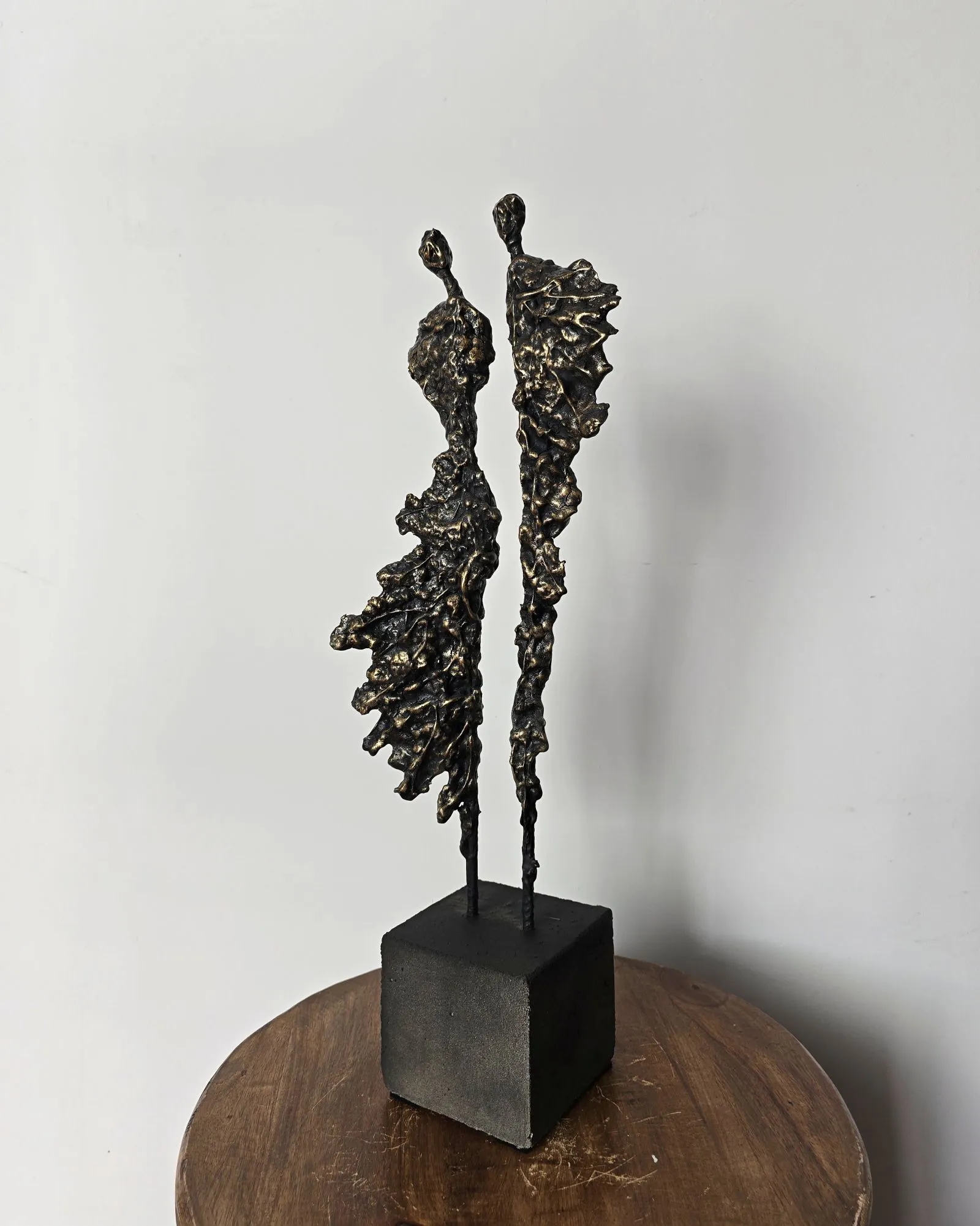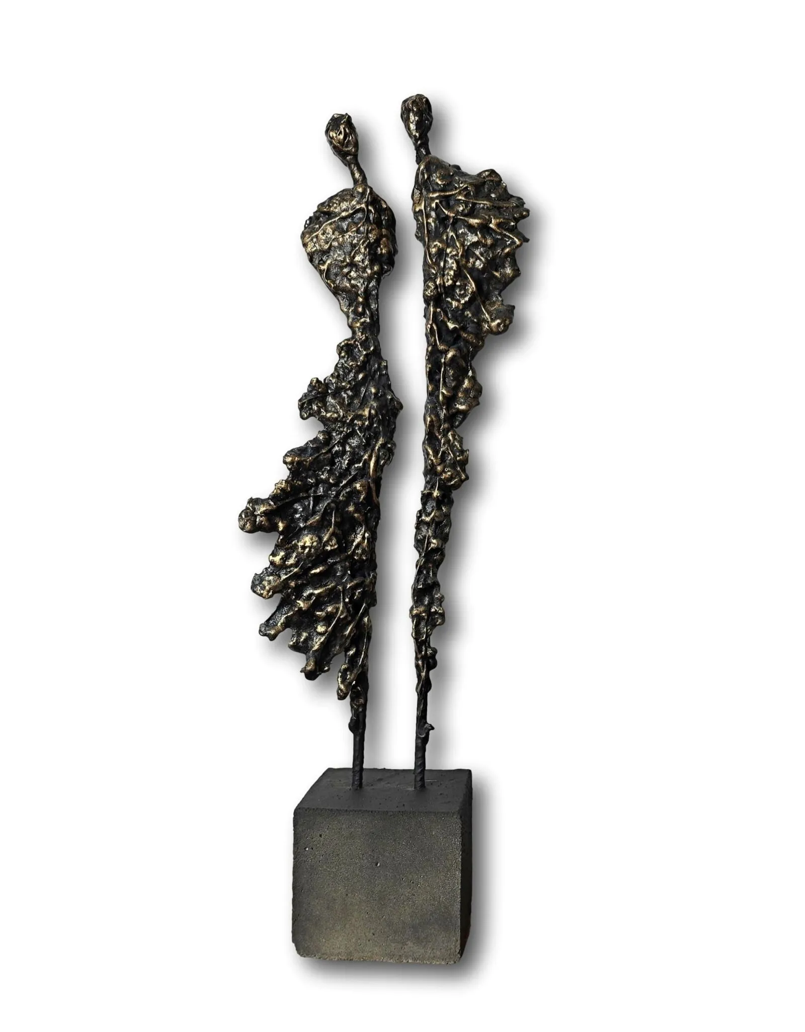 Rzeźba przedstawiająca ludzką postać, wykonana z metalu, gliny i betonu, to intrygujące dzieło, które harmonizuje piękno niedoskonałej formy z subtelnymi emocjami. Postać, spleciona z gliny i otoczona skomplikowaną siecią nieregularnych linii, przywodzi na myśl korzenie i gałęzie drzew, tworząc emocjonalny krwiobieg rzeźby. Te linie, niczym żywe nerwy, oplatają postać, nadając jej dynamiczną i poruszającą teksturę, która wciąga widza w intymny dialog z materią.