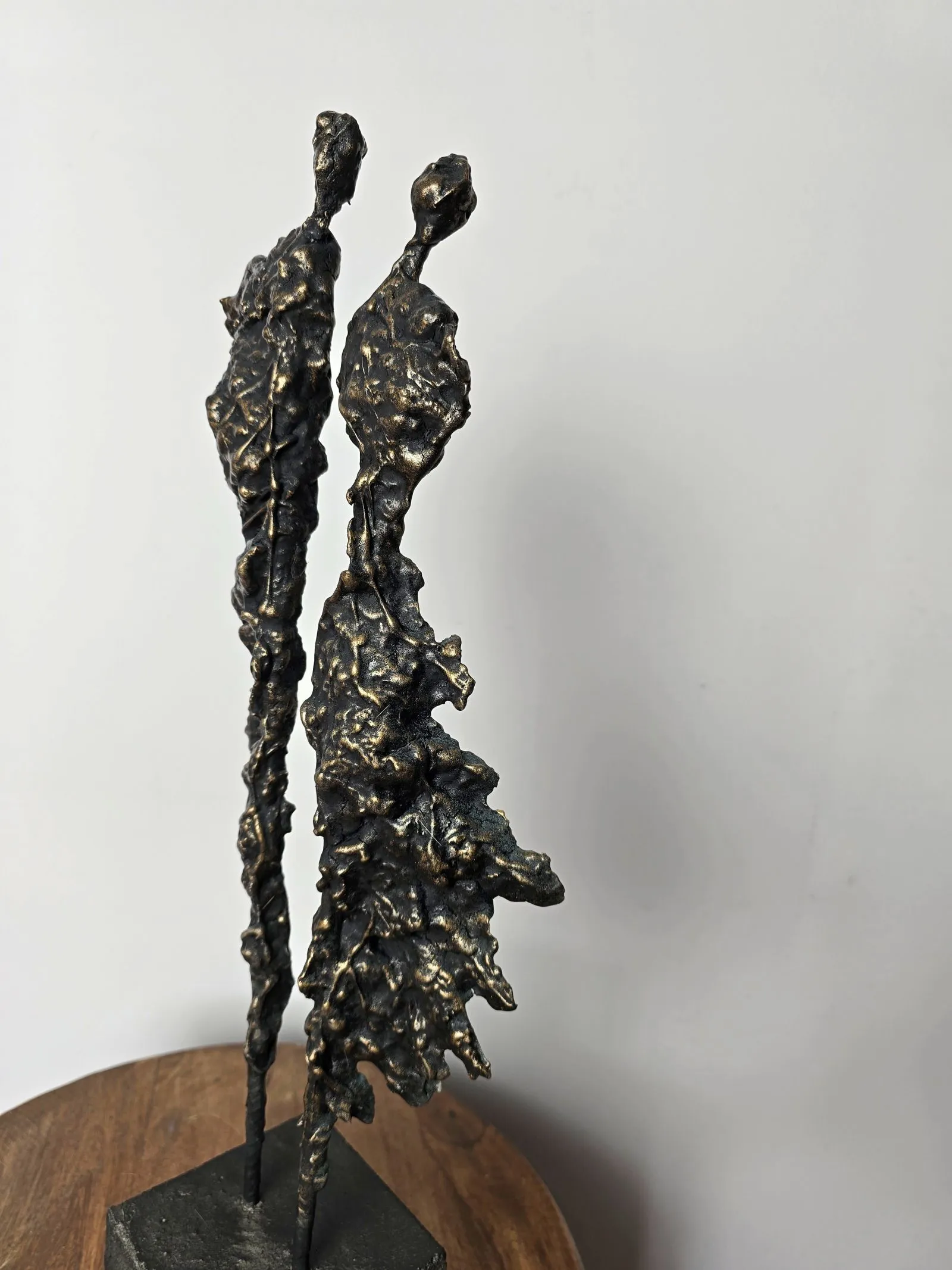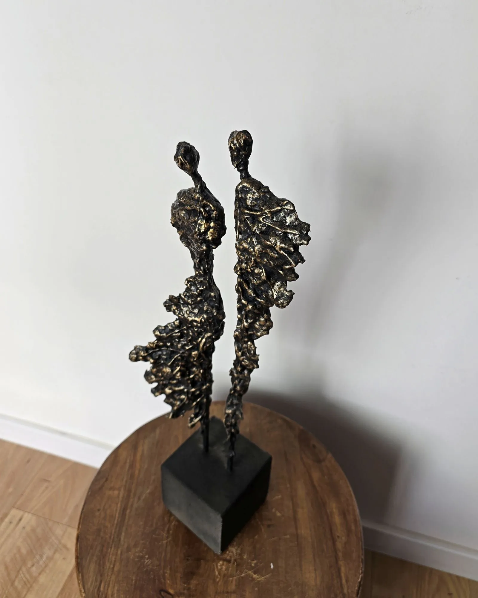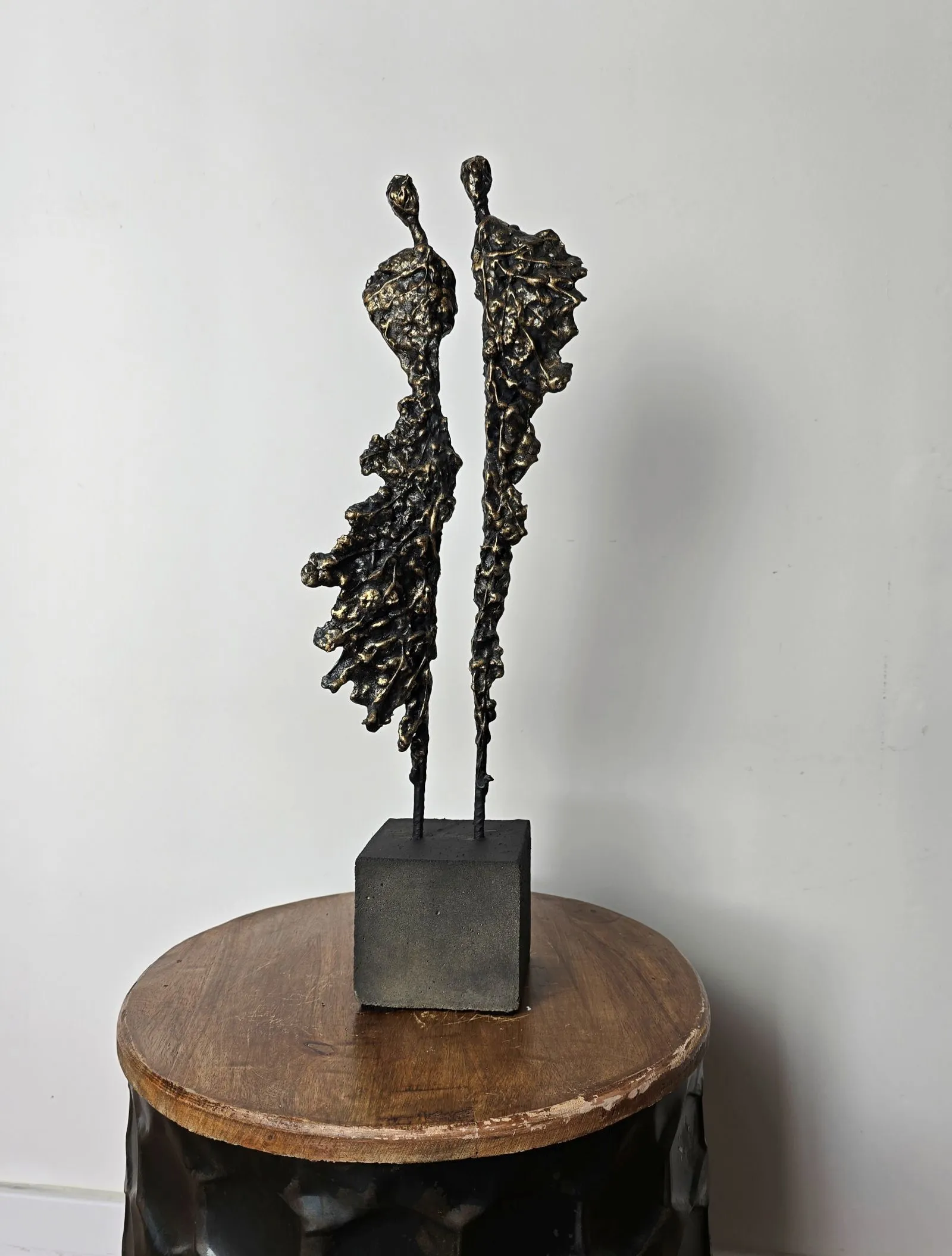 Rzeźba przedstawiająca ludzką postać, wykonana z metalu, gliny i betonu, to intrygujące dzieło, które harmonizuje piękno niedoskonałej formy z subtelnymi emocjami. Postać, spleciona z gliny i otoczona skomplikowaną siecią nieregularnych linii, przywodzi na myśl korzenie i gałęzie drzew, tworząc emocjonalny krwiobieg rzeźby. Te linie, niczym żywe nerwy, oplatają postać, nadając jej dynamiczną i poruszającą teksturę, która wciąga widza w intymny dialog z materią.