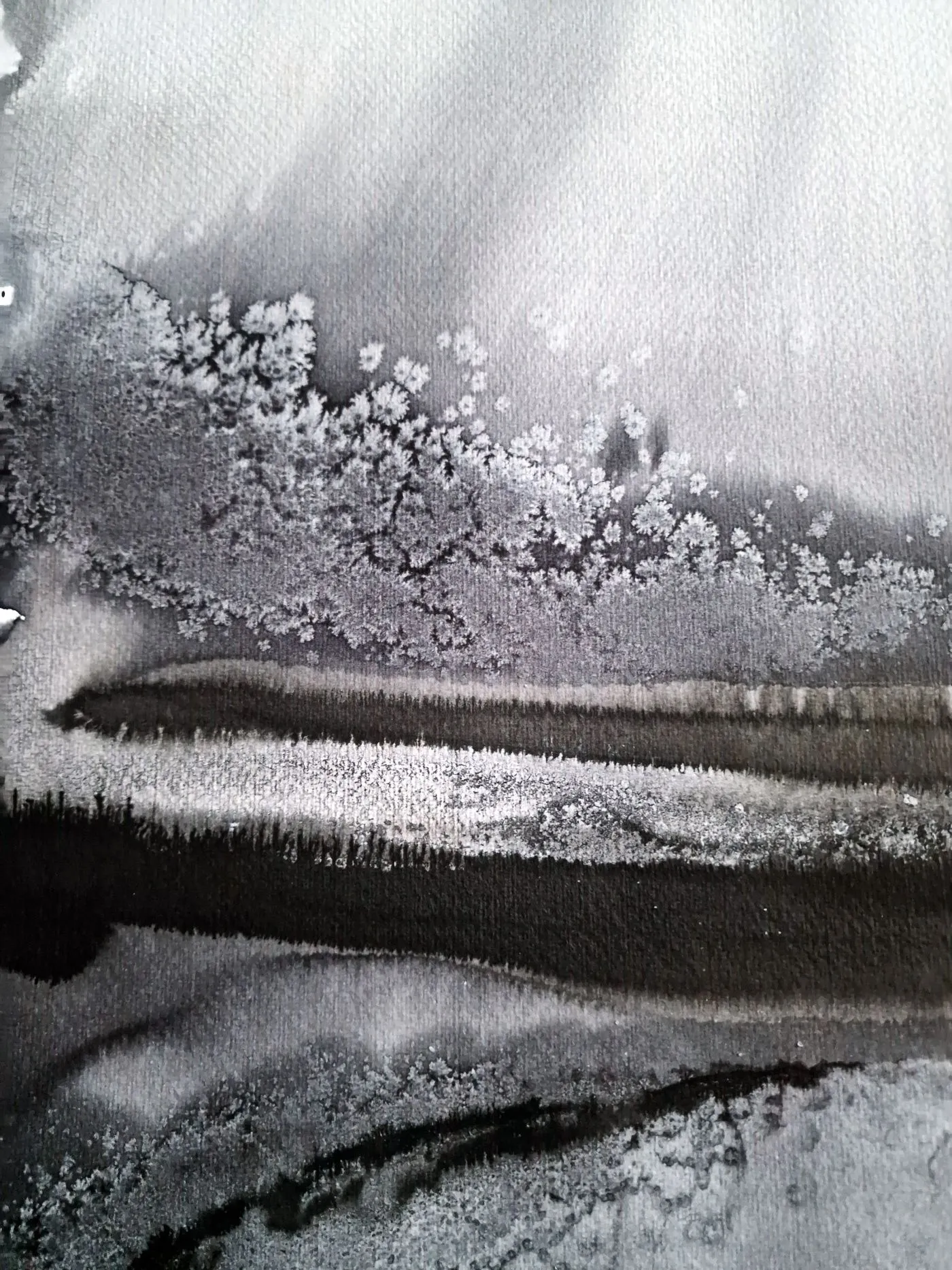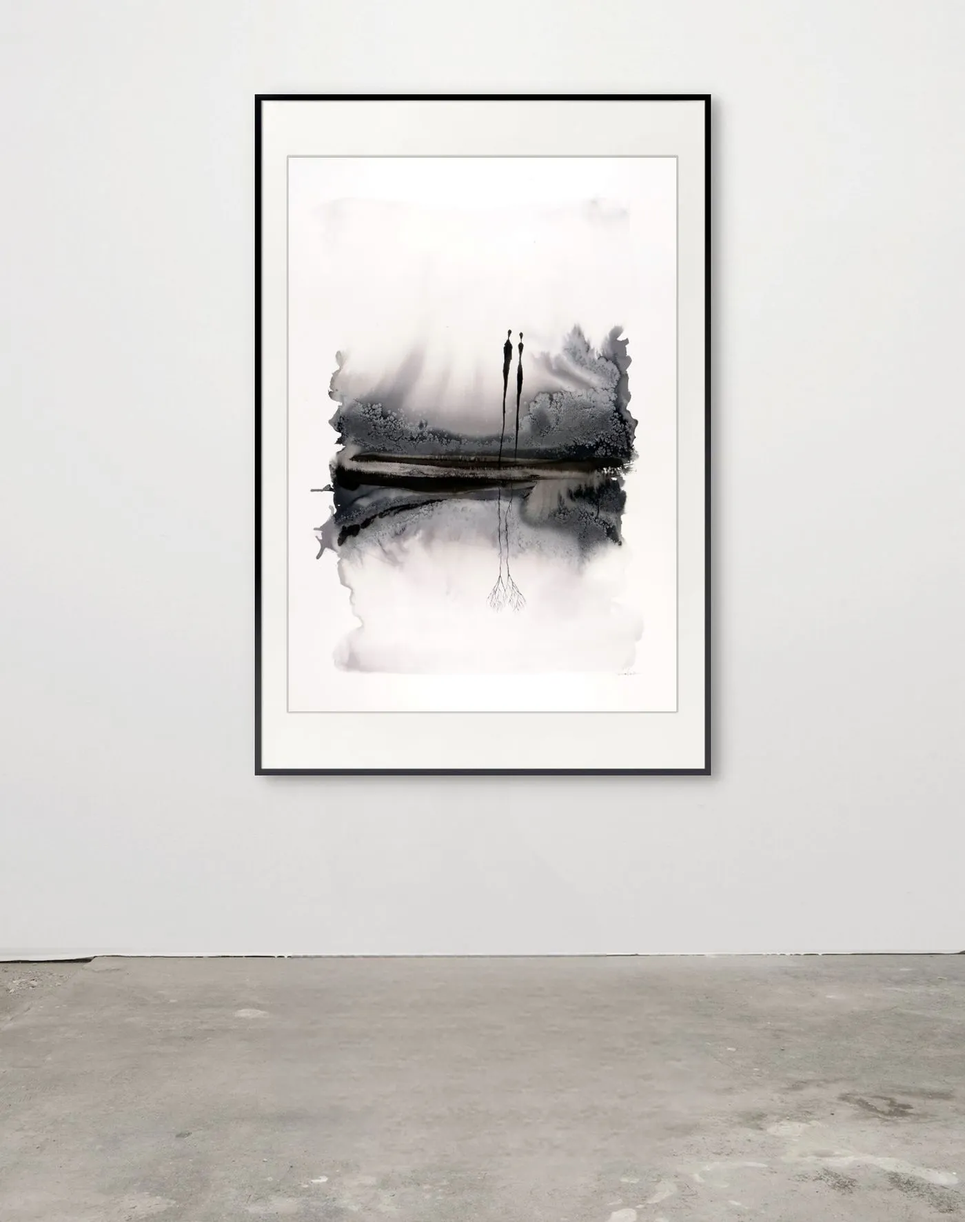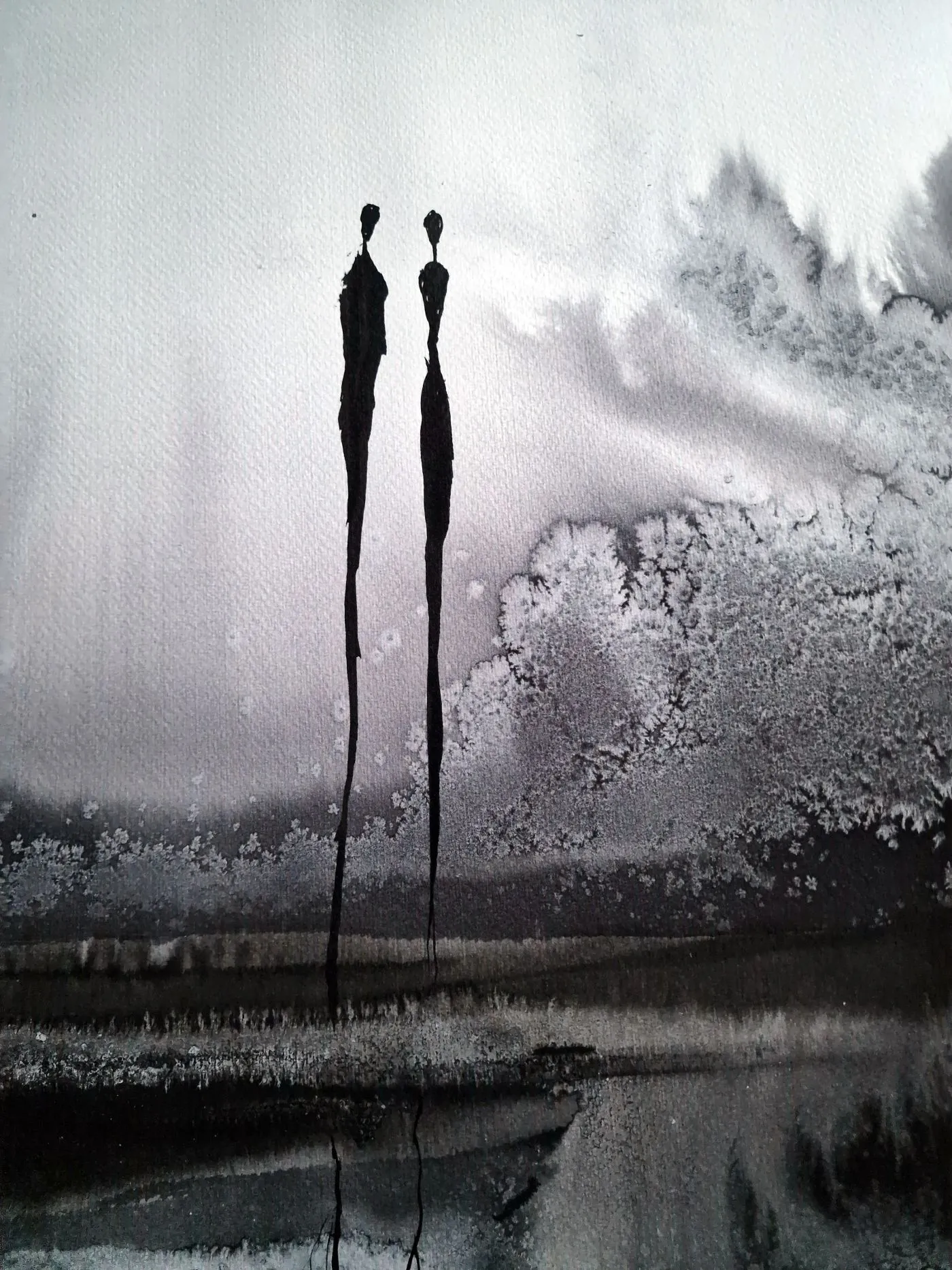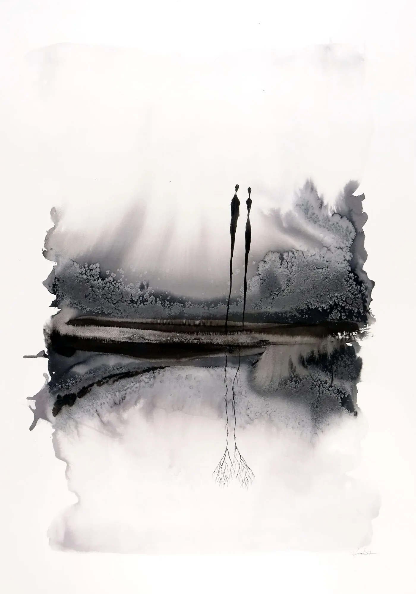 Monochromatyczność pracy podkreśla kontrast między kontrolą a spontanicznością, między formą a przypadkiem. To dzieło zaprasza do zanurzenia się w ciszy i obserwacji – z każdą chwilą ujawniają się nowe detale, subtelne rozmycia tuszu, które odsłaniają wewnętrzny rytm i emocje.