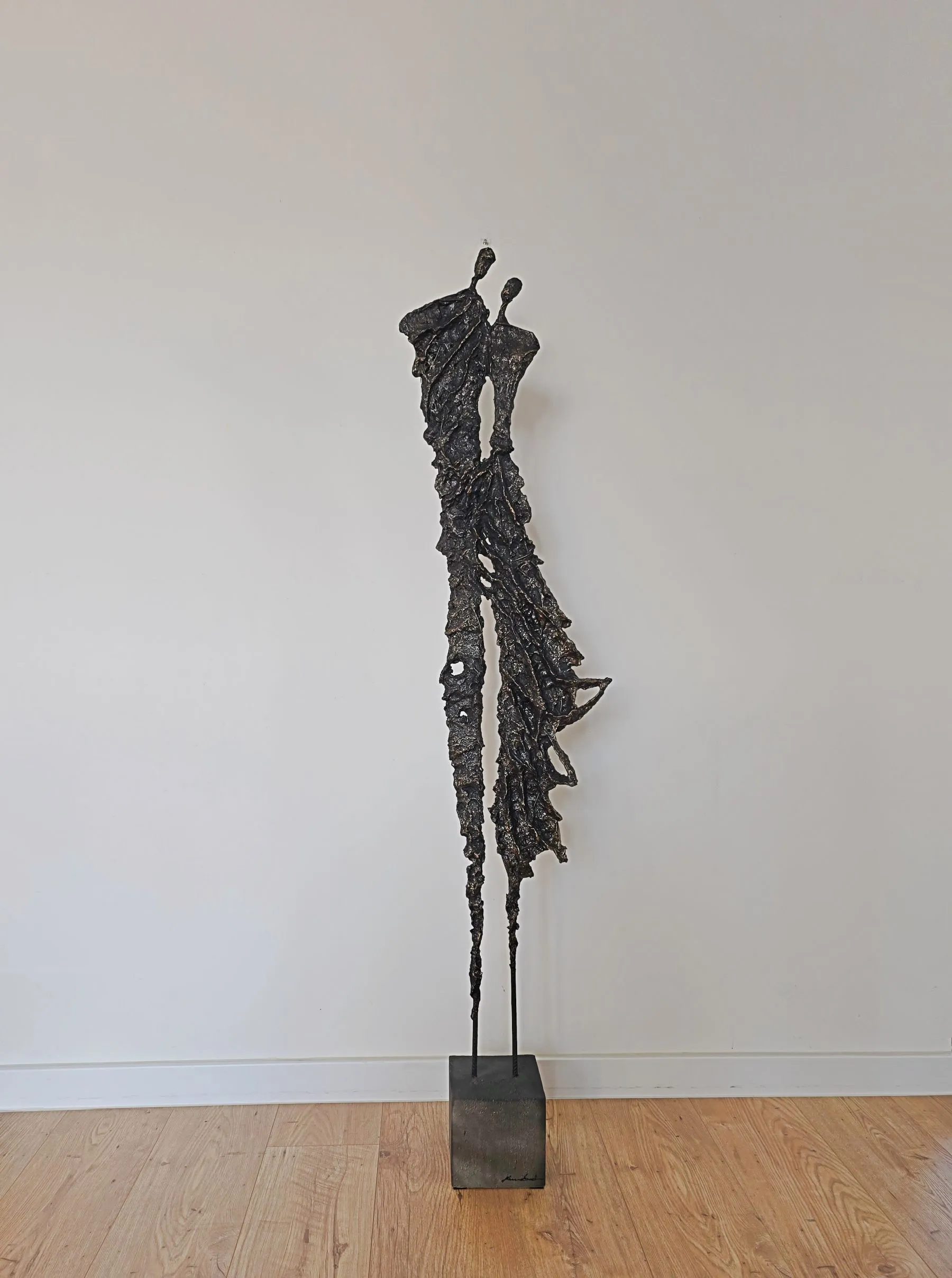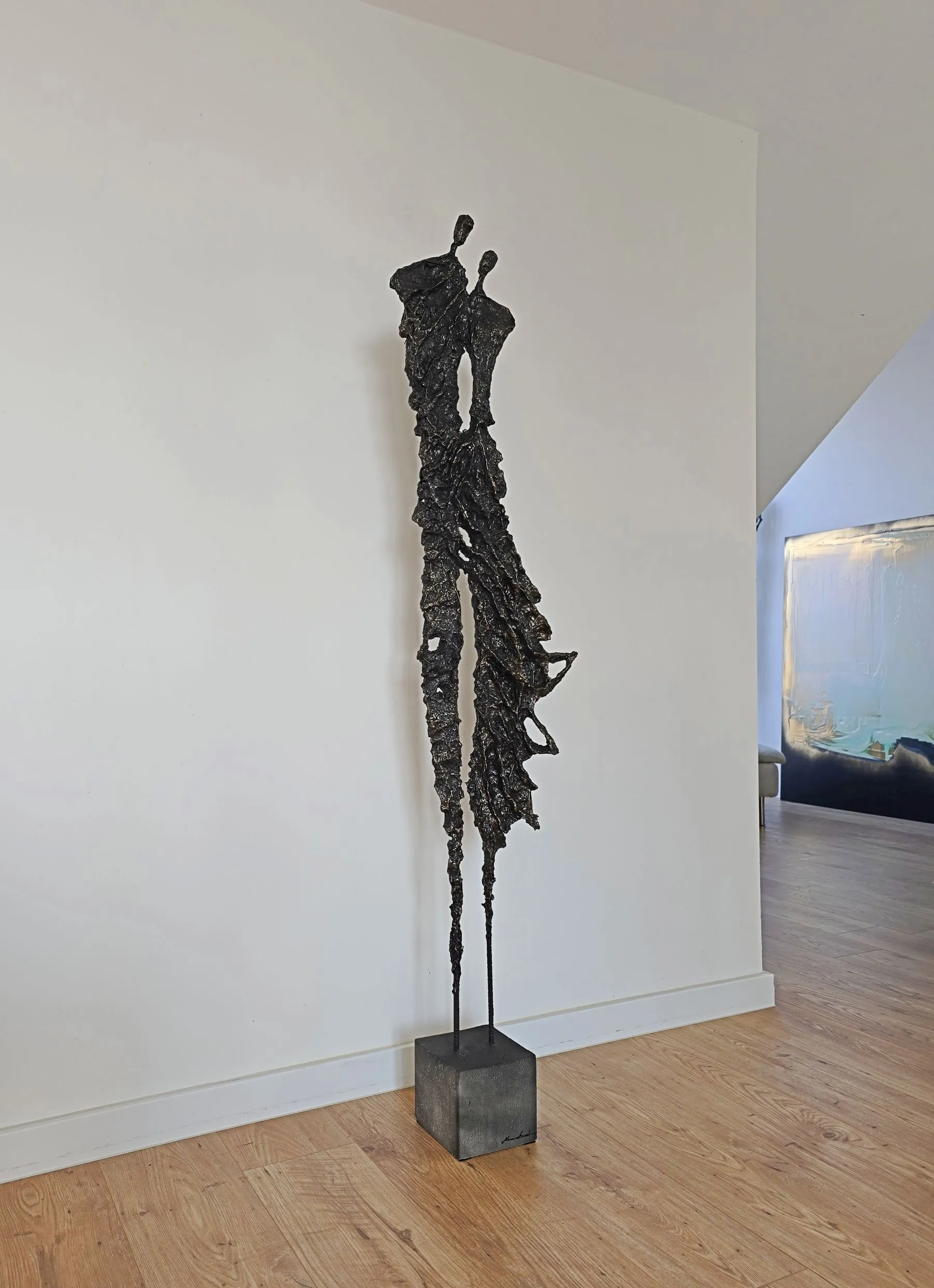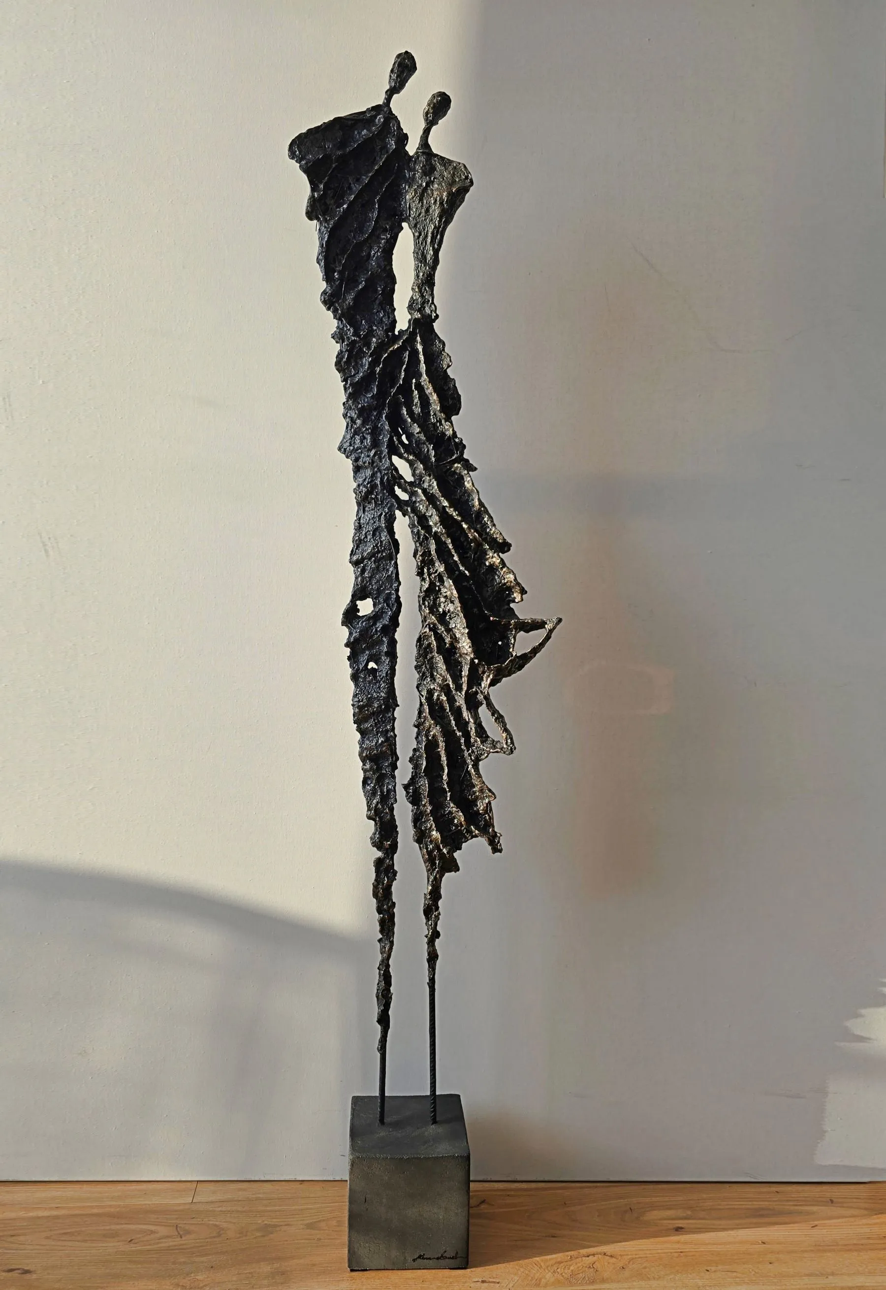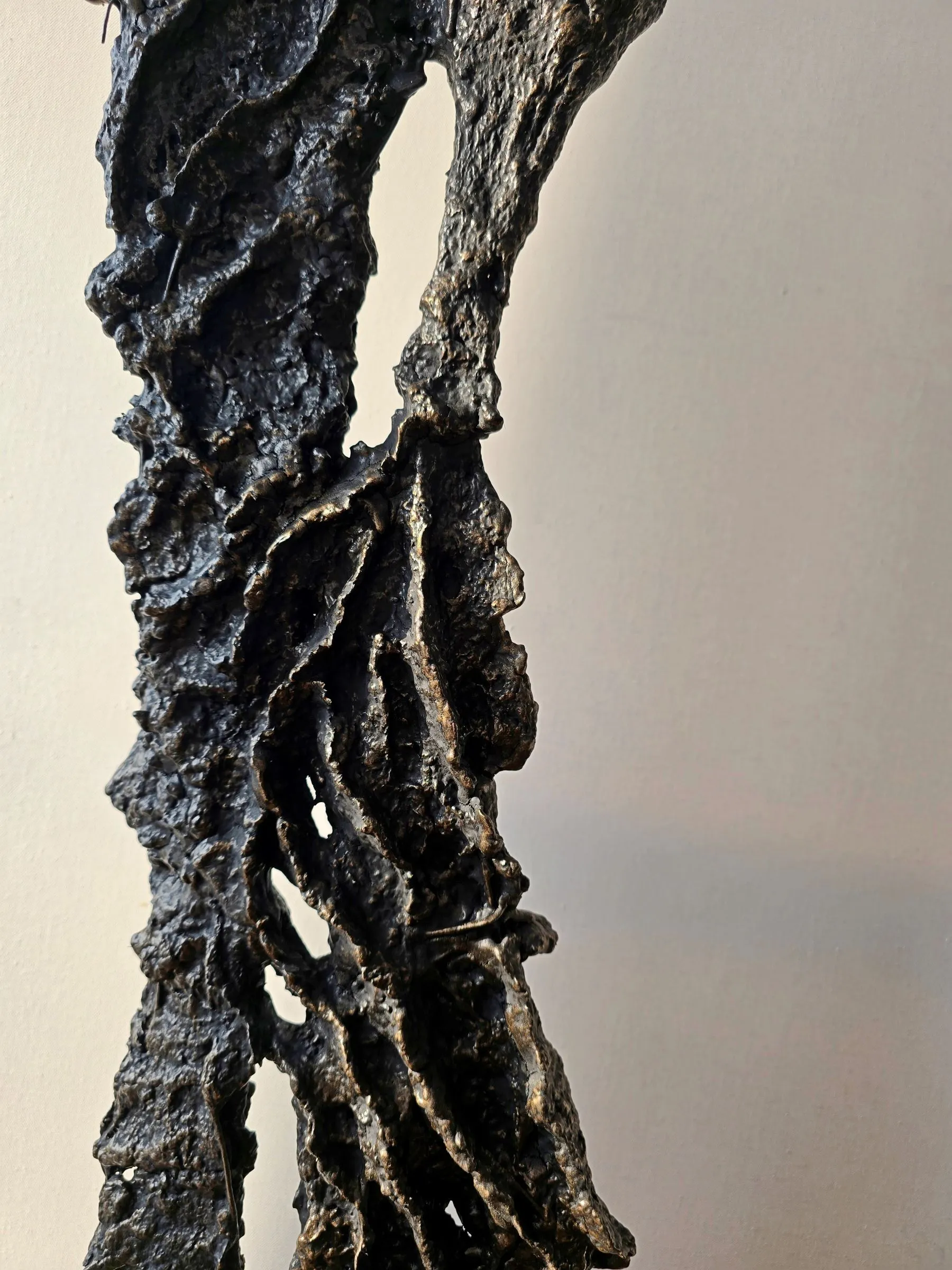 Rzeźba z cyklu Sploty emanuje lekkością mimo swojej surowej, metalicznej formy, ukazując subtelne napięcie między kruchością a siłą. Organiczna struktura przypomina delikatnie splatające się linie ludzkiej obecności, zatrzymane w dynamicznym geście. To forma, która zaprasza do kontemplacji relacji, rytmu i przestrzeni, pozostawiając miejsce na indywidualny odbiór.