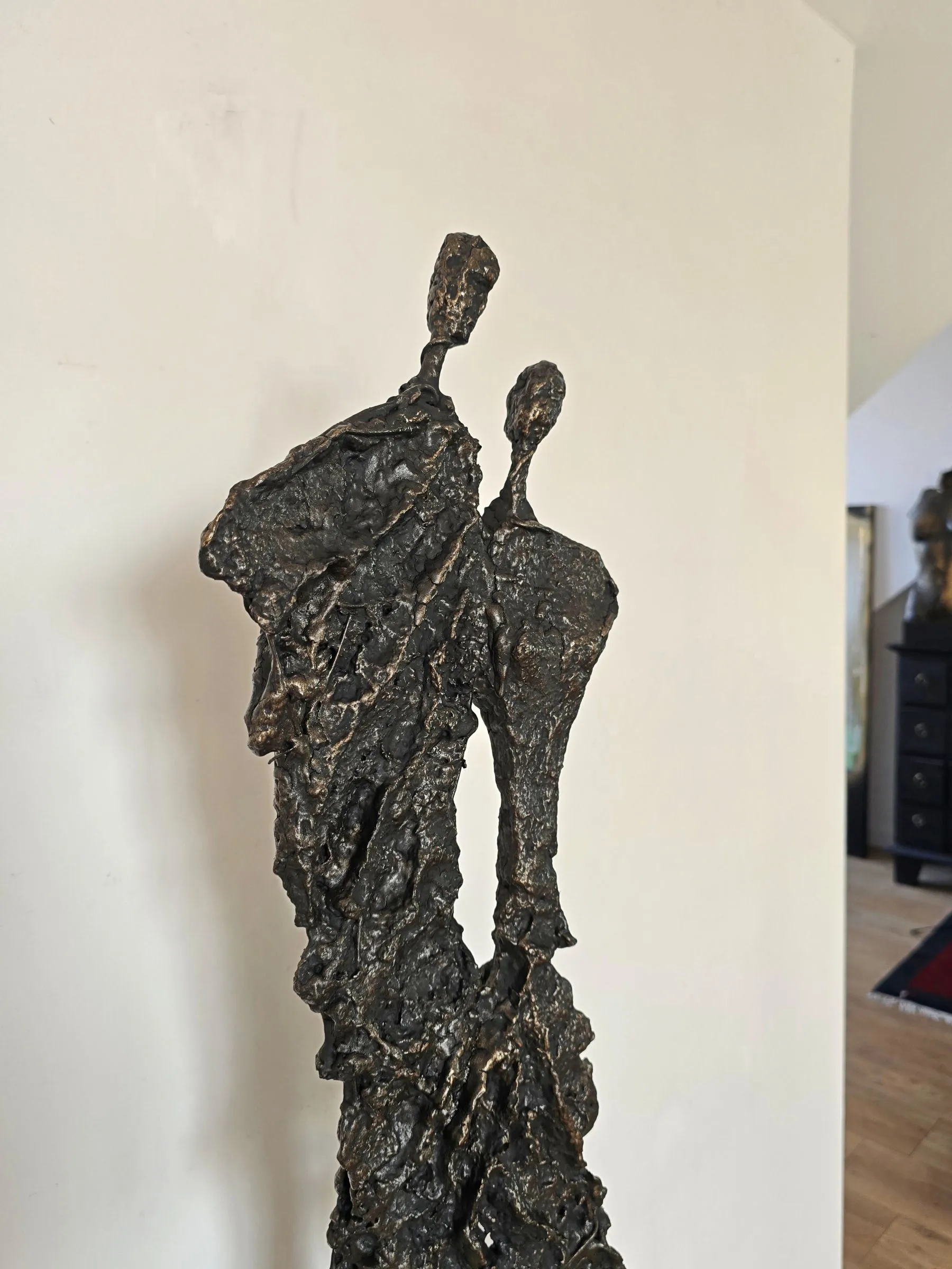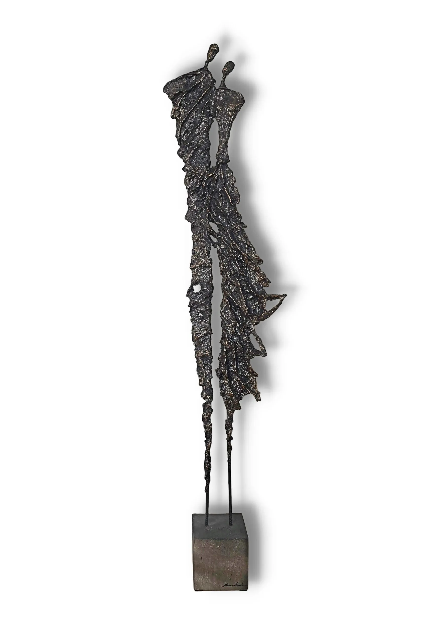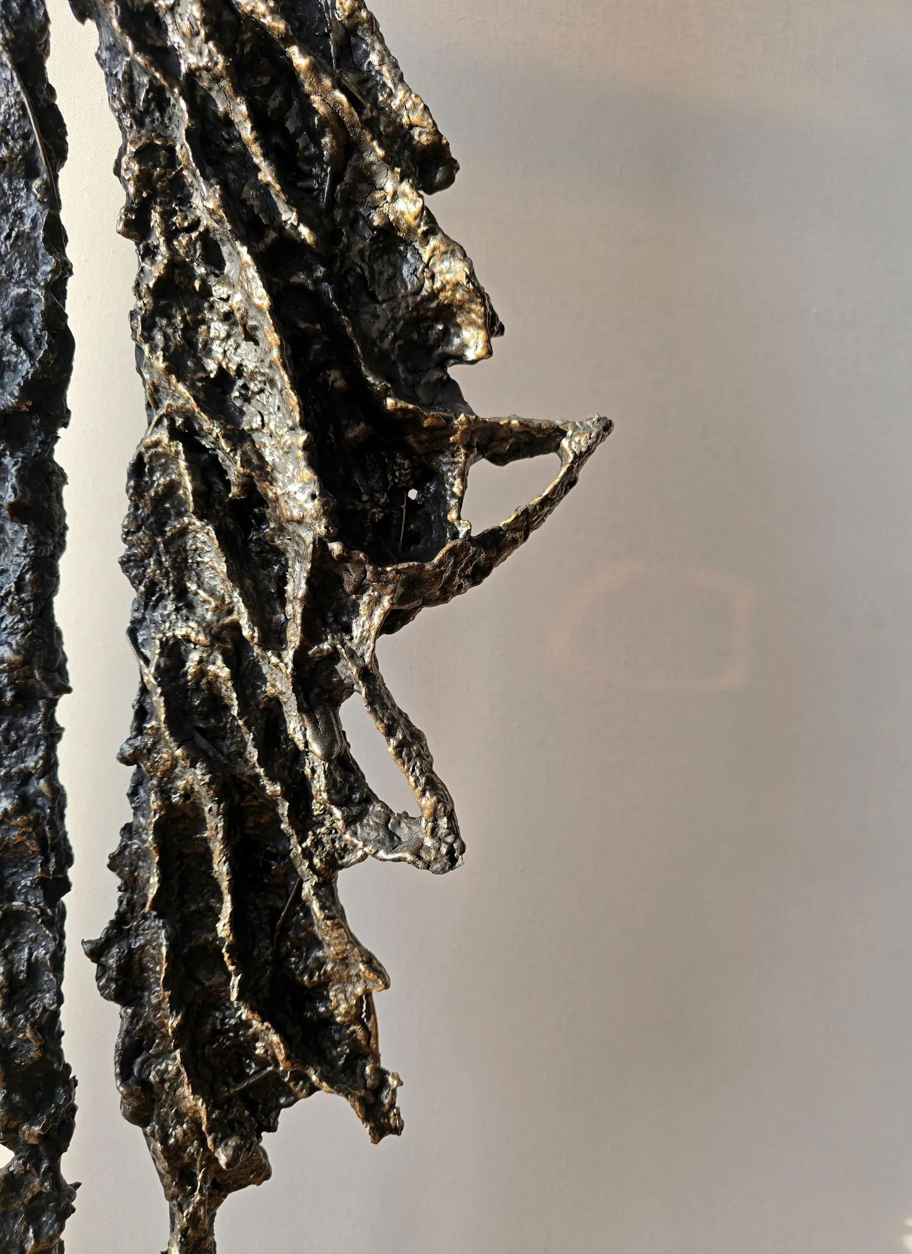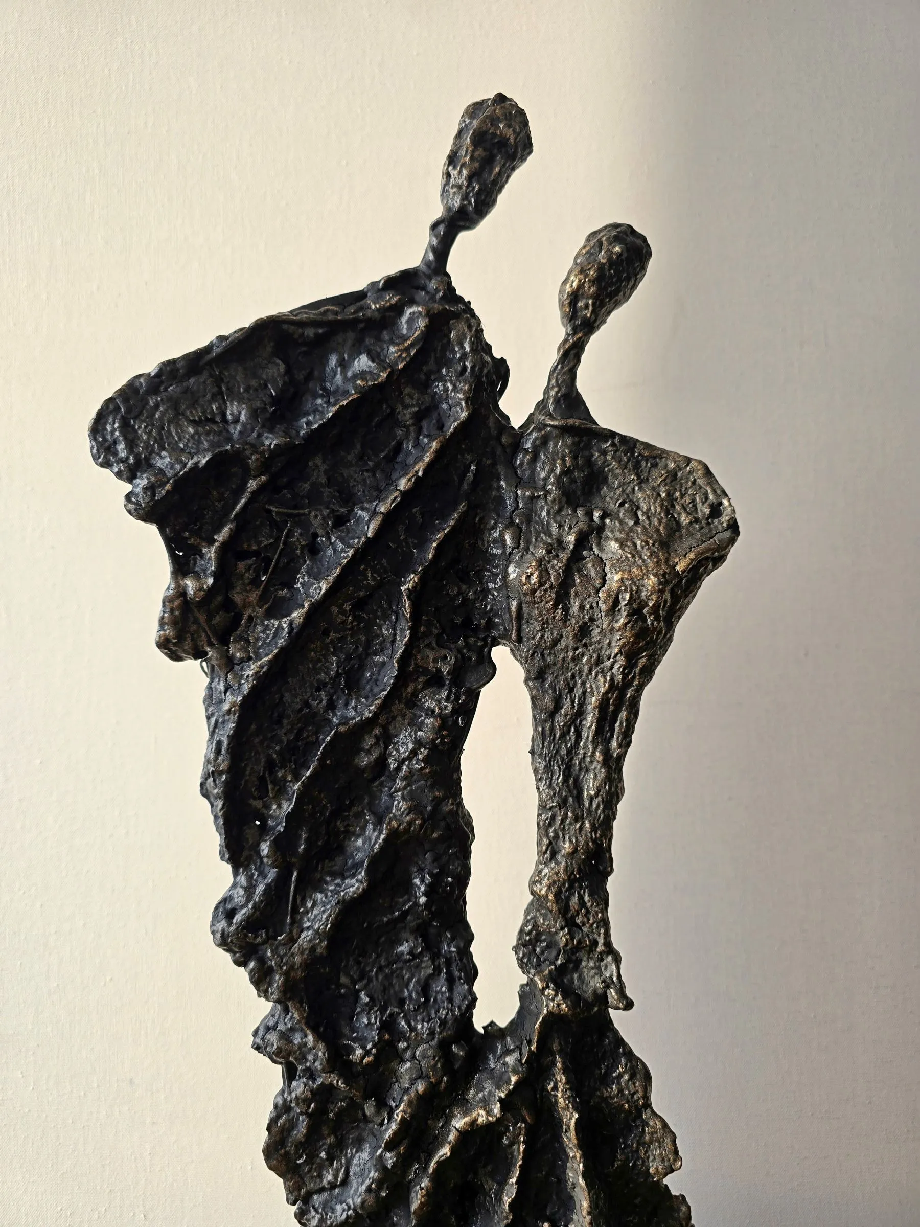 Rzeźba z cyklu Sploty emanuje lekkością mimo swojej surowej, metalicznej formy, ukazując subtelne napięcie między kruchością a siłą. Organiczna struktura przypomina delikatnie splatające się linie ludzkiej obecności, zatrzymane w dynamicznym geście. To forma, która zaprasza do kontemplacji relacji, rytmu i przestrzeni, pozostawiając miejsce na indywidualny odbiór.