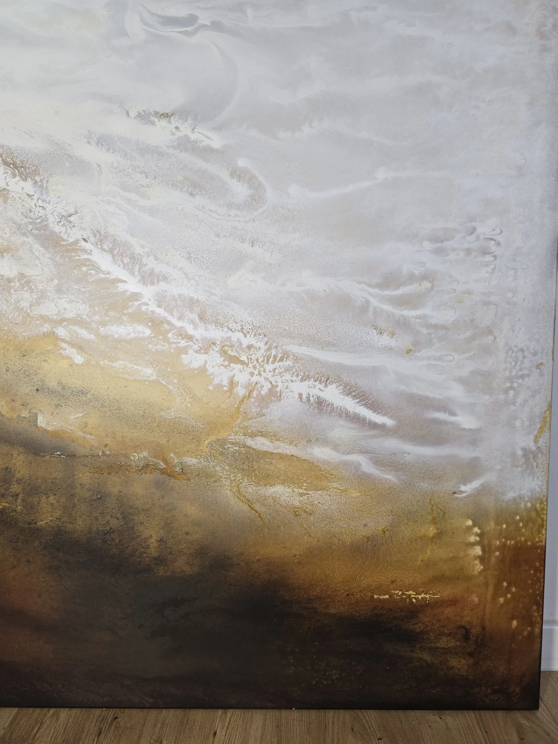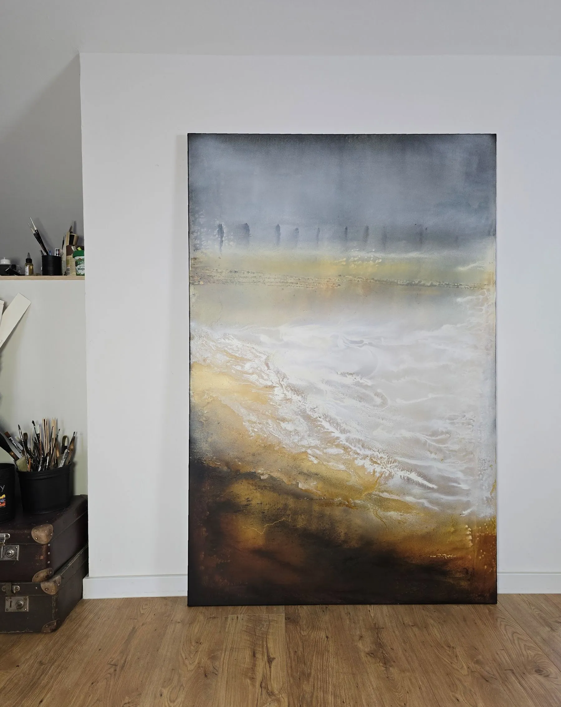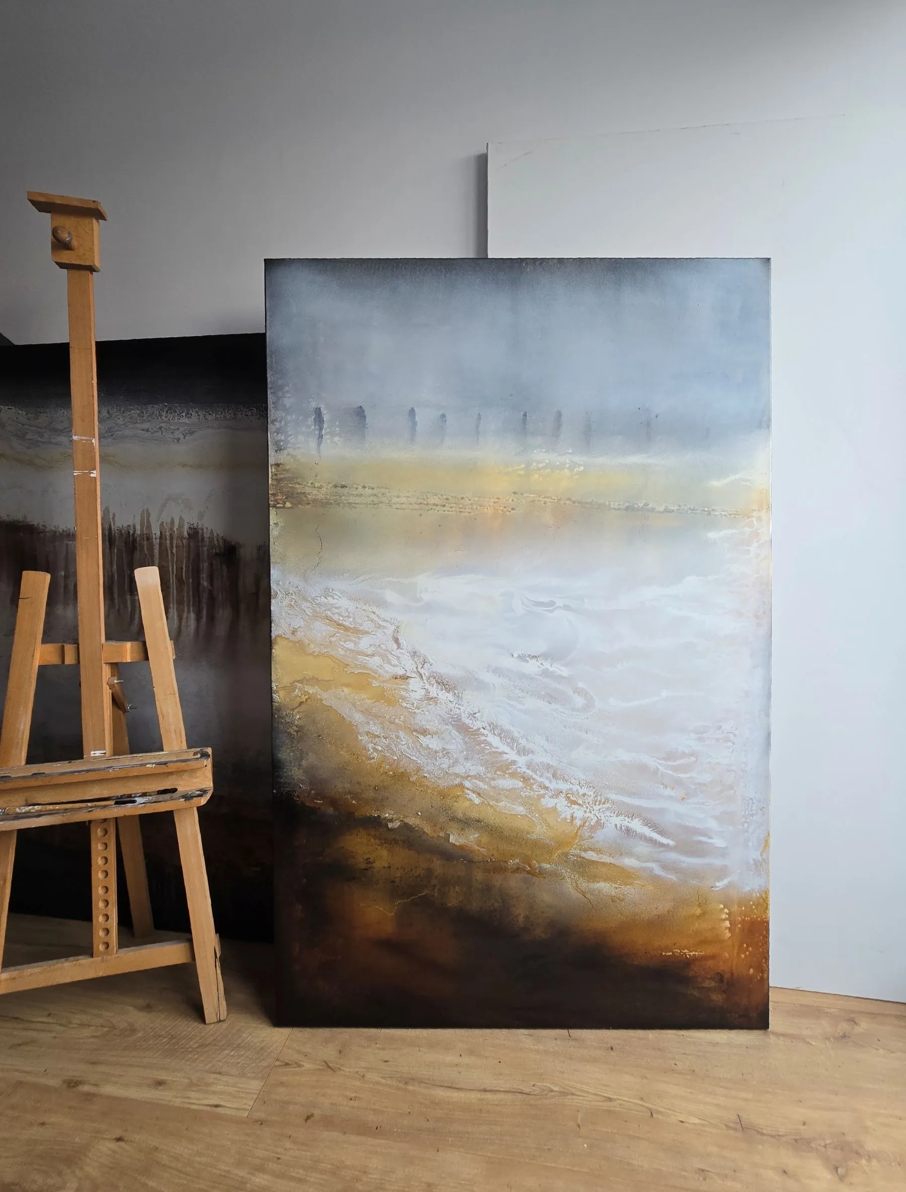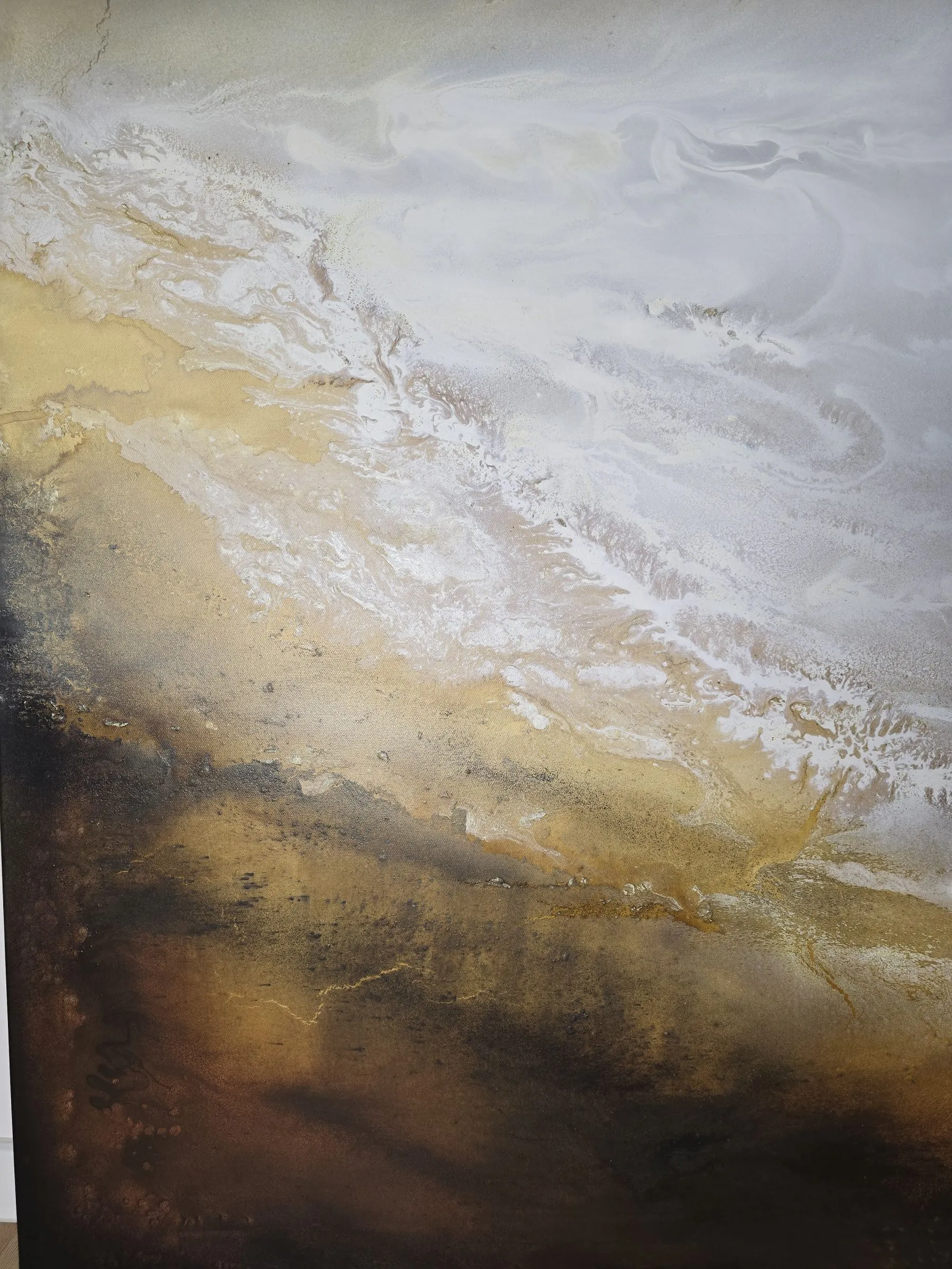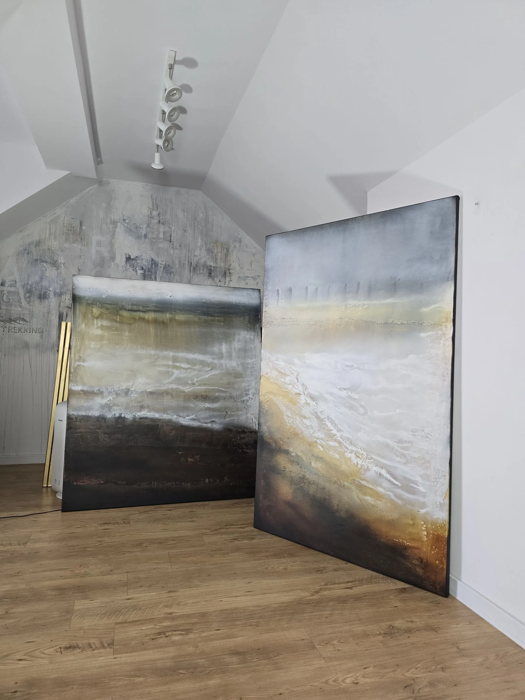 Obraz z cyklu Energie (170x110 cm) jest pełen ruchu i naturalnej dynamiki. Abstrakcyjna kompozycja w odcieniach brązu, bieli i szarości przywołuje skojarzenia z falą rozbijającą się o brzeg. Delikatne przejścia tonalne i organiczne faktury tworzą wrażenie, jakby natura została zatrzymana w kadrze – w momencie transformacji i przepływu. To dzieło łączy spokój z siłą, ukazując piękno żywiołu w jego zmienności i nieuchwytności.
