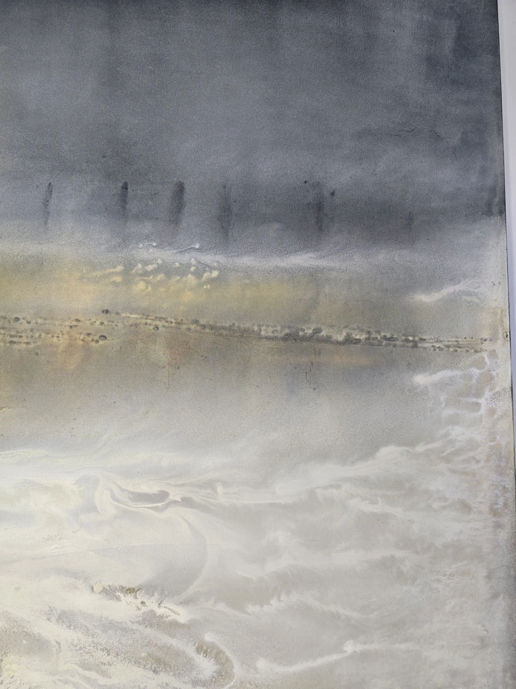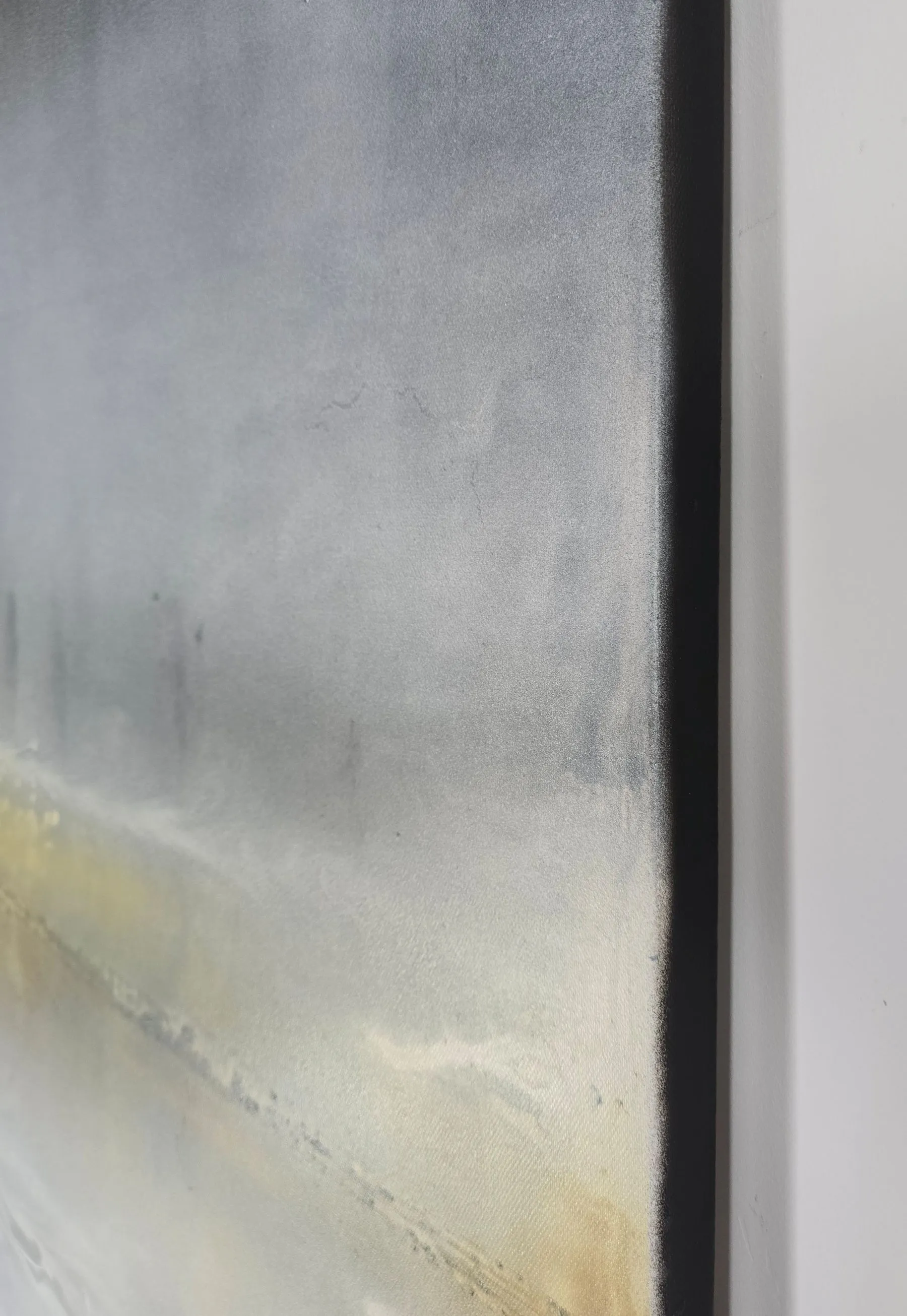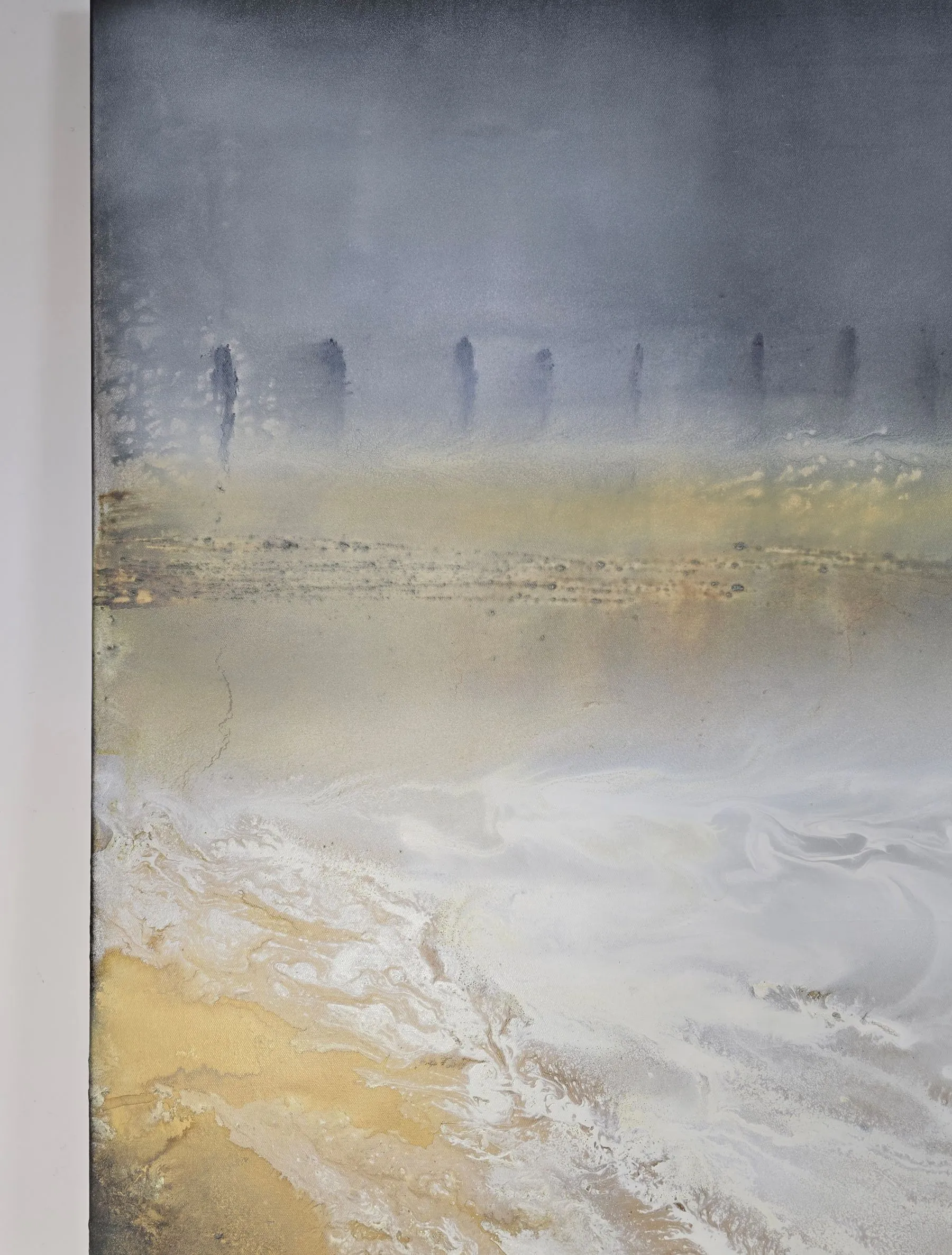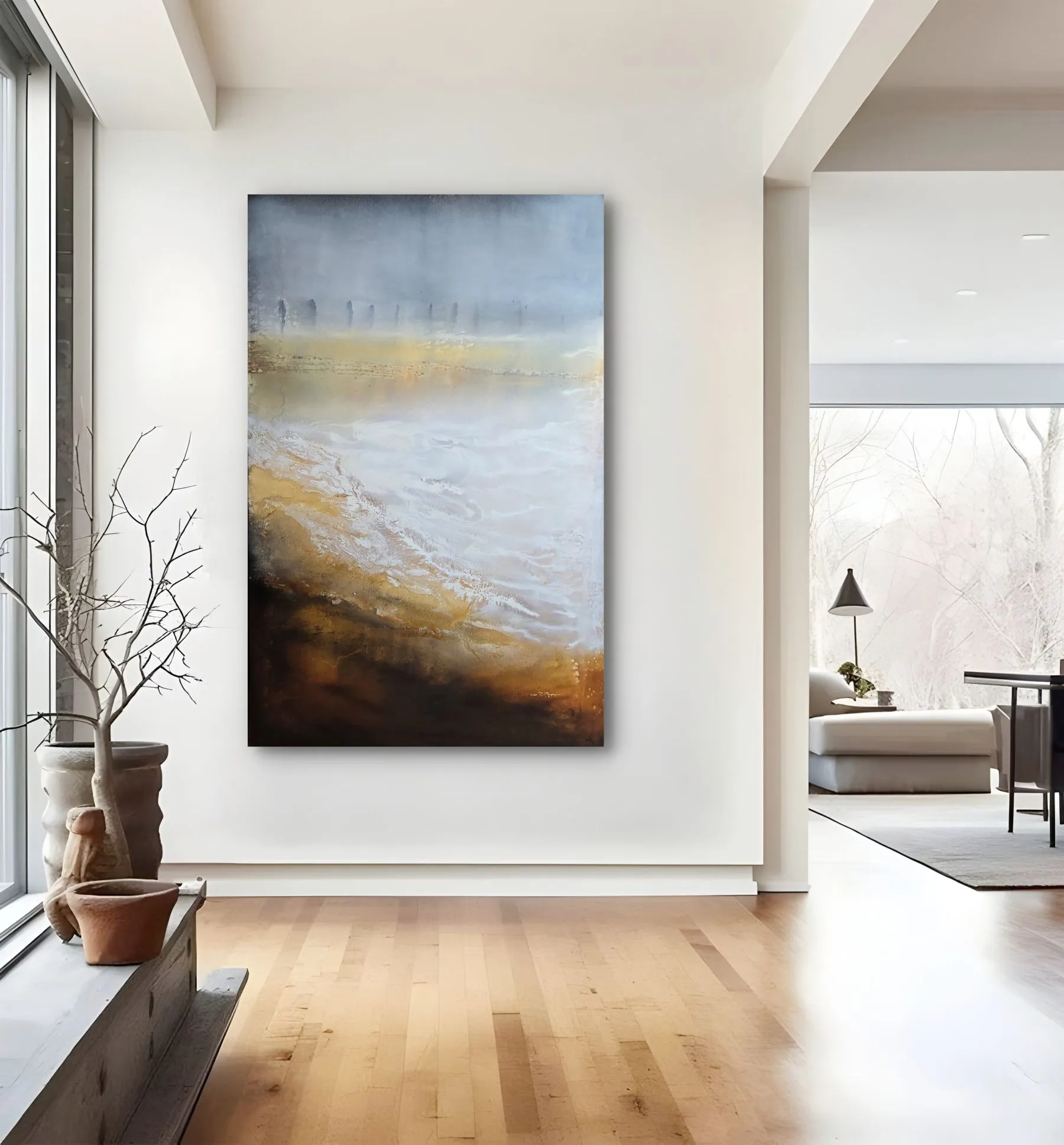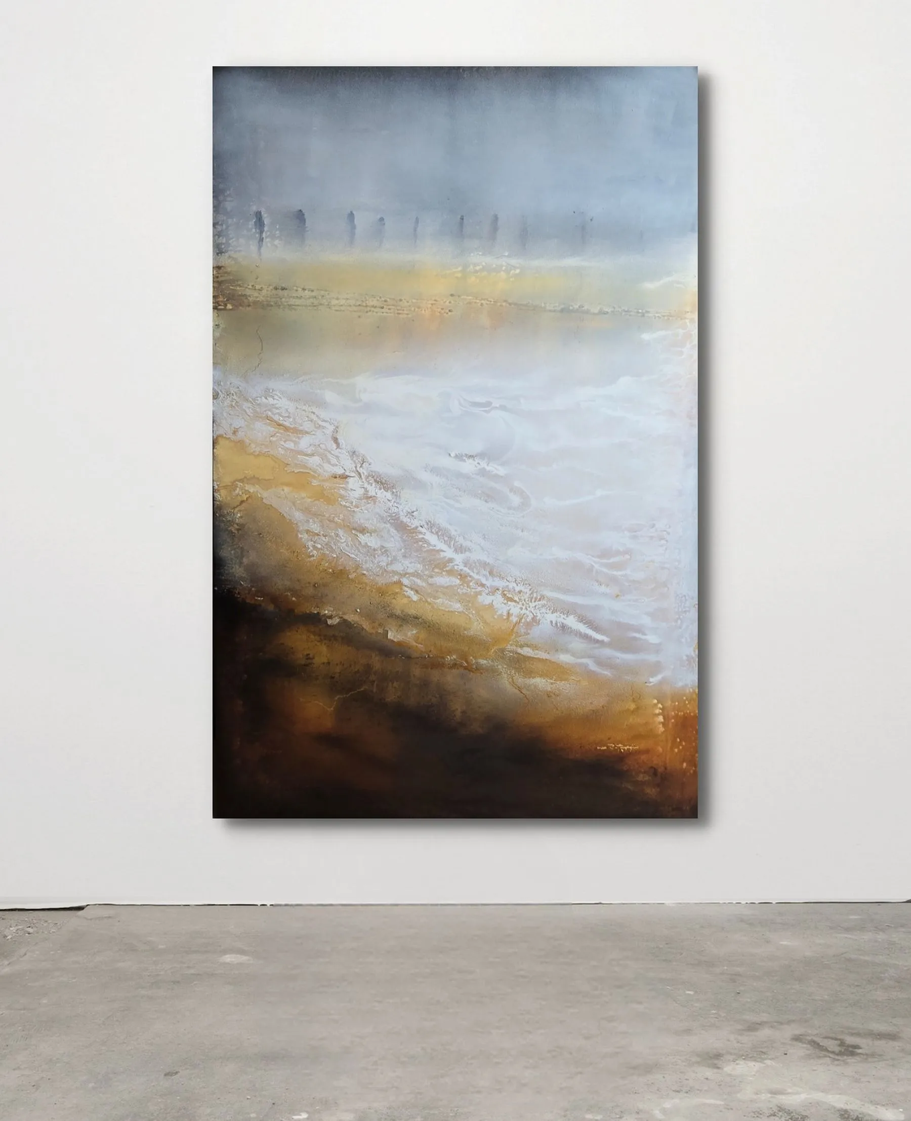 Obraz z cyklu Energie (170x110 cm) jest pełen ruchu i naturalnej dynamiki. Abstrakcyjna kompozycja w odcieniach brązu, bieli i szarości przywołuje skojarzenia z falą rozbijającą się o brzeg. Delikatne przejścia tonalne i organiczne faktury tworzą wrażenie, jakby natura została zatrzymana w kadrze – w momencie transformacji i przepływu. To dzieło łączy spokój z siłą, ukazując piękno żywiołu w jego zmienności i nieuchwytności.
