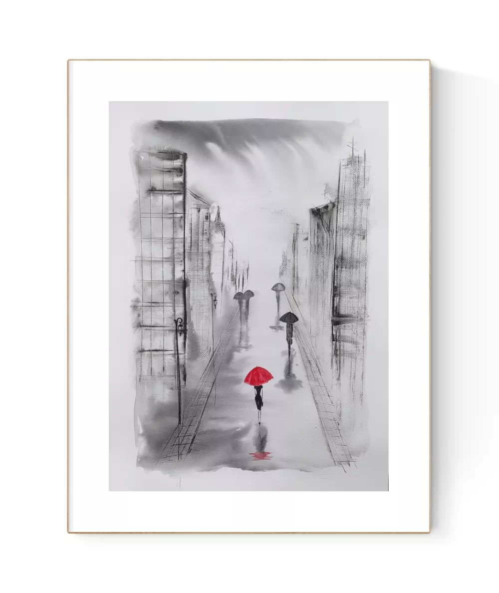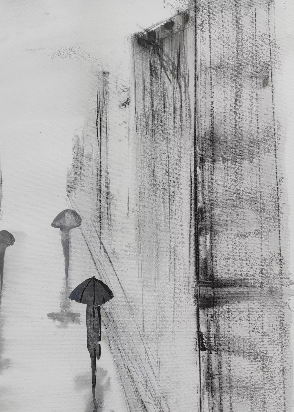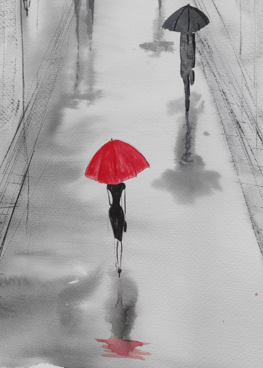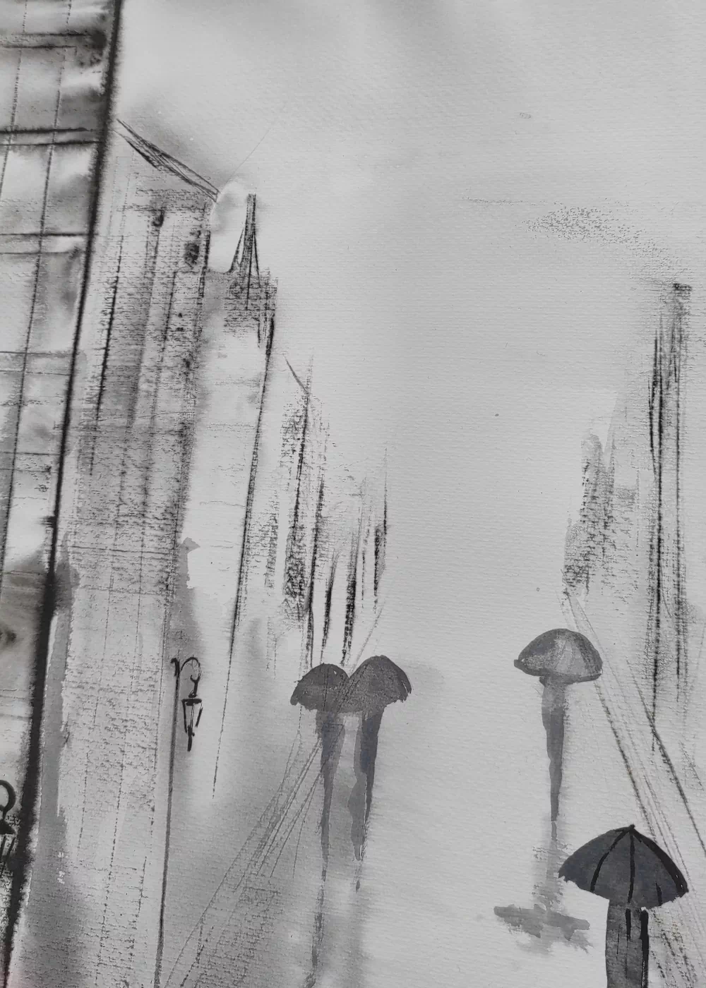 Delikatne i subtelne rysunki tuszem z dodatkiem akwareli. Spacer w deszczu to cykl romantycznych grafik czarno-białych z kolorowym akcentem. Delikatne rozmycia, które w nieoczywisty sposób przenoszą nas w sentymentalną przestrzeń naszego ja. Ciepły, letni deszcz stanowi tło spotkań. Uliczne latarenki, nieśpieszni przechodnie i ona - kobieta z parasolem.