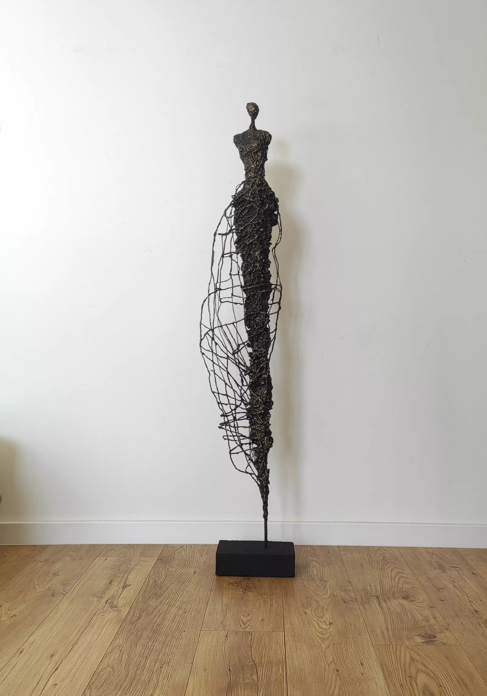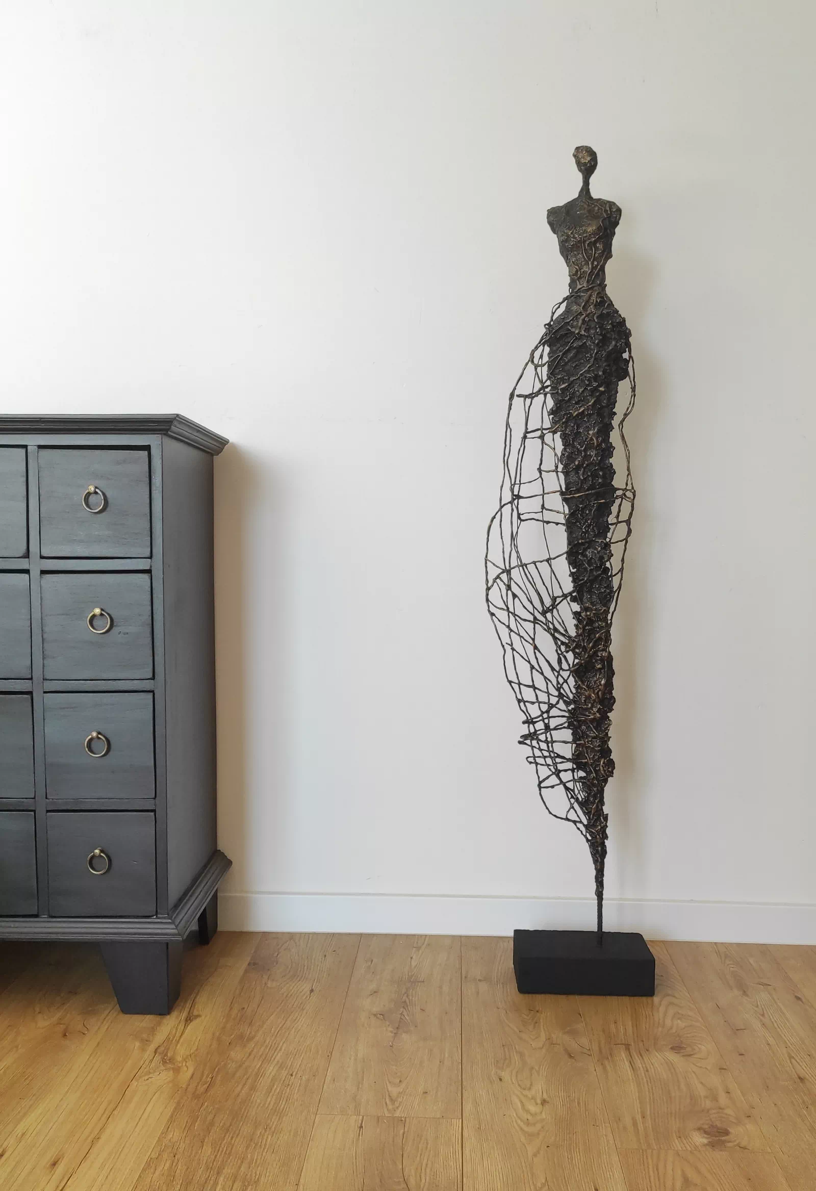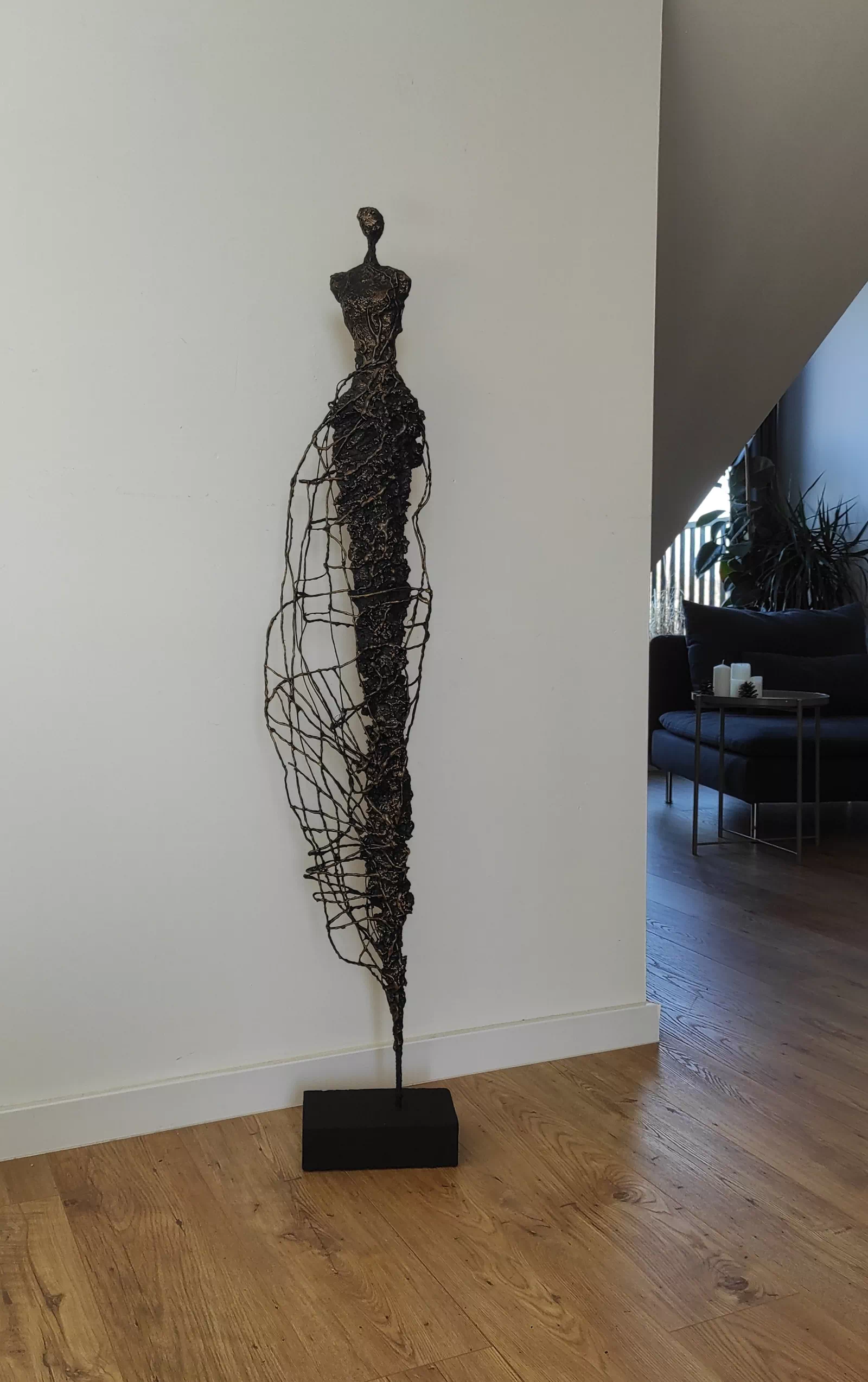 Rzeźba kobiety została wykonana ze stali, gliny sproszkowanego kamienia. Ekspresja ulotności, przemijania. Rzeźba kobiety z bogatą fakturą, która nadaje jej lekkości i zwiewności. Cykl rzeźb nawiązuje do kolekcji obrazów i grafik Point od Balance. Motyw kamiennych postaci został przeniesiony do formy przestrzennej. Biomorficzne kształty nawiązujące do ludzkich sylwetek wyrażające emocje i relacje jakie dzielimy z innymi. Rzeźba ma nowoczesną formę, surowość materiałów z jakich została wykonana, łączenia i spawy łagodzi plastyczność gliny i masy z sproszkowanego kamienia. Użyta kolorystyka uwydatnia charakter rzeźby. Delikatny połysk został częściowo zmatowiony, co daje efekt patyny. Rzeźba z cyklu Postać jest niezwykle osobliwa również ze względu na efekt jaki wywołuje oglądana z bliska, z uwagi na bogactwo szczegółów i szlachetność wykończenia.