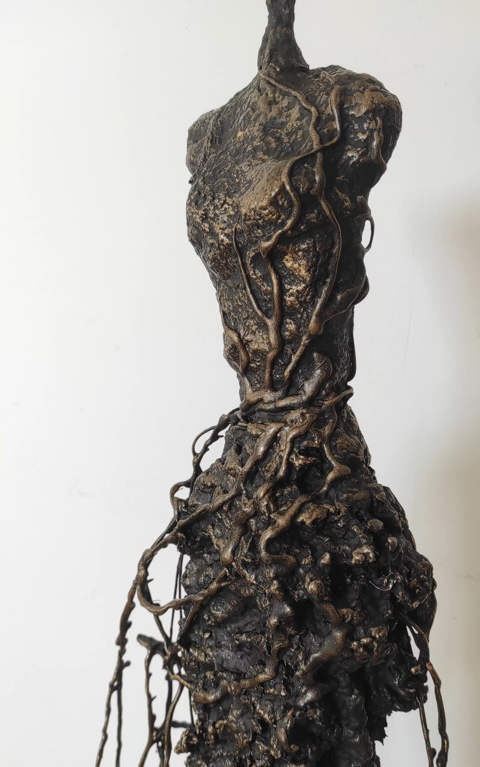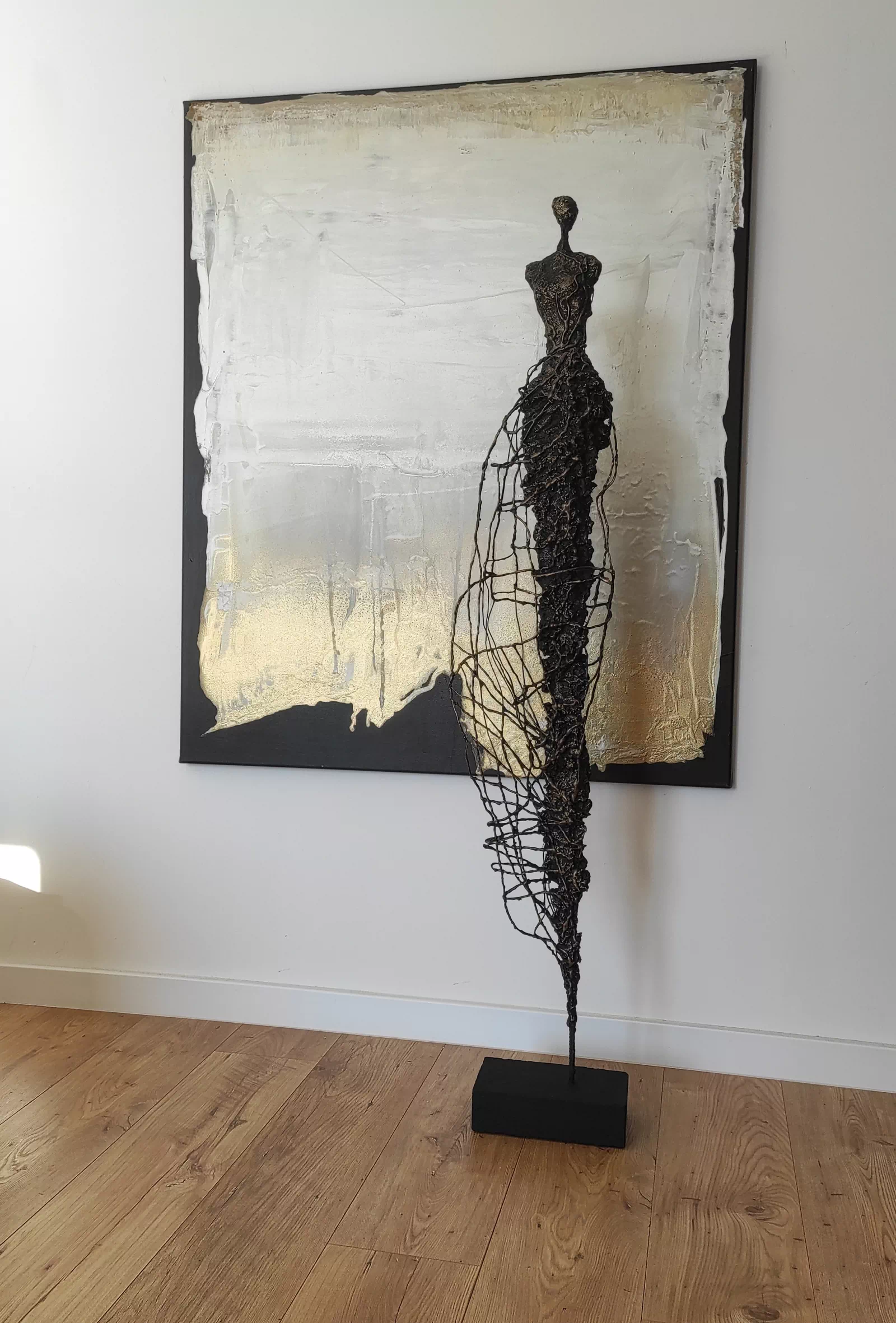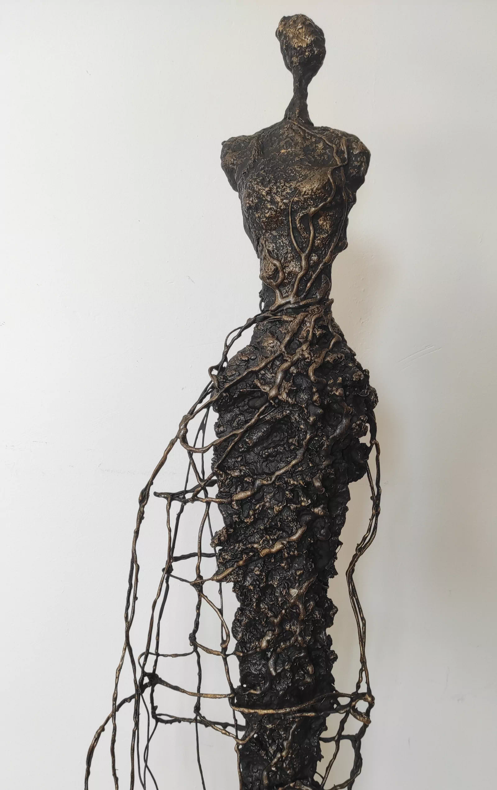 Rzeźba kobiety została wykonana ze stali, gliny sproszkowanego kamienia. Ekspresja ulotności, przemijania. Rzeźba kobiety z bogatą fakturą, która nadaje jej lekkości i zwiewności. Cykl rzeźb nawiązuje do kolekcji obrazów i grafik Point od Balance. Motyw kamiennych postaci został przeniesiony do formy przestrzennej. Biomorficzne kształty nawiązujące do ludzkich sylwetek wyrażające emocje i relacje jakie dzielimy z innymi. Rzeźba ma nowoczesną formę, surowość materiałów z jakich została wykonana, łączenia i spawy łagodzi plastyczność gliny i masy z sproszkowanego kamienia. Użyta kolorystyka uwydatnia charakter rzeźby. Delikatny połysk został częściowo zmatowiony, co daje efekt patyny. Rzeźba z cyklu Postać jest niezwykle osobliwa również ze względu na efekt jaki wywołuje oglądana z bliska, z uwagi na bogactwo szczegółów i szlachetność wykończenia.