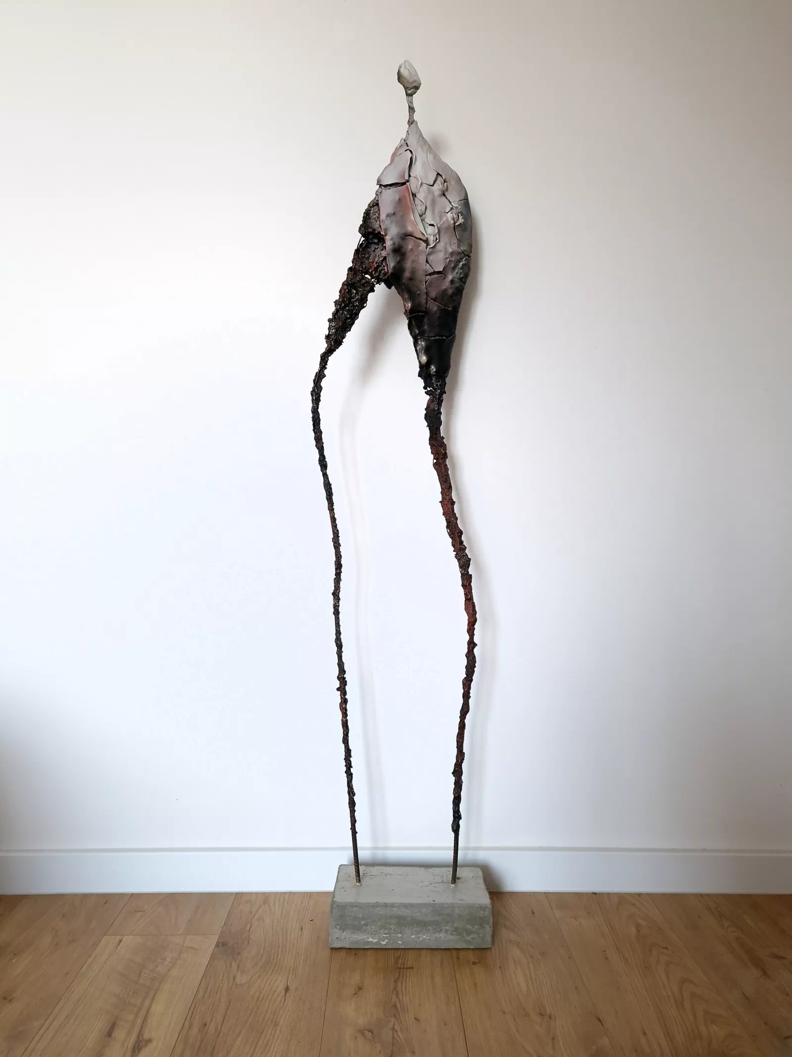 Rzeźba abstrakcyjna została wykonana z metalu, gliny i betonu. Ekspresyjna rzeźba z bogatą strukturą. Cykl rzeźb nawiązuje do kolekcji obrazów i grafik Point od Balance. Motyw kamiennych postaci został przeniesiony do formy przestrzennej. Biomorficzne kształty nawiązujące do ludzkich sylwetek wyrażają emocje i relacje jakie dzielimy z innymi. Rzeźba ma nowoczesną formę, surowość materiałów z jakich została wykonana, łączenia i spawy została złagodzona plastycznością gliny i masy z sproszkowanego kamienia. Użyta kolorystyka uwydatnia charakter rzeźby. Delikatny połysk został częściowo zmatowiony, co daje efekt patyny. Rzeźba z cyklu Postać jest niezwykle osobliwa również ze względu na efekt jaki wywołuje oglądana z bliska, z uwagi na bogactwo szczegółów i szlachetność wykończenia. Forma i design rzeźby podkreślą charakter nowoczesnego salonu lub gabinetu.