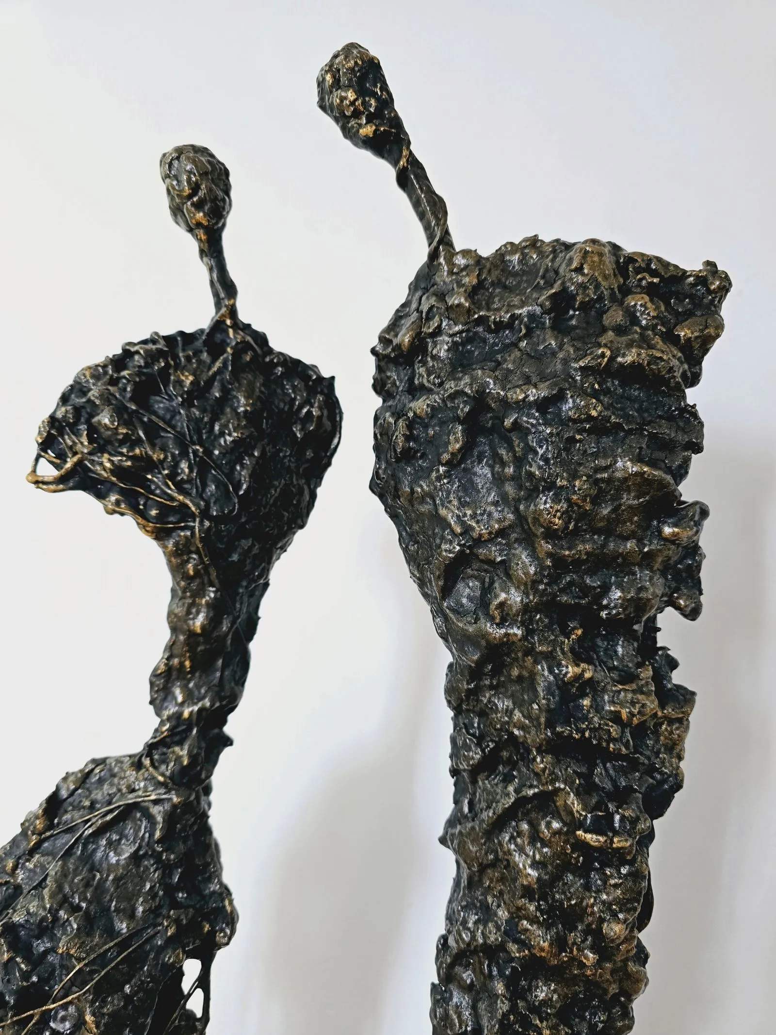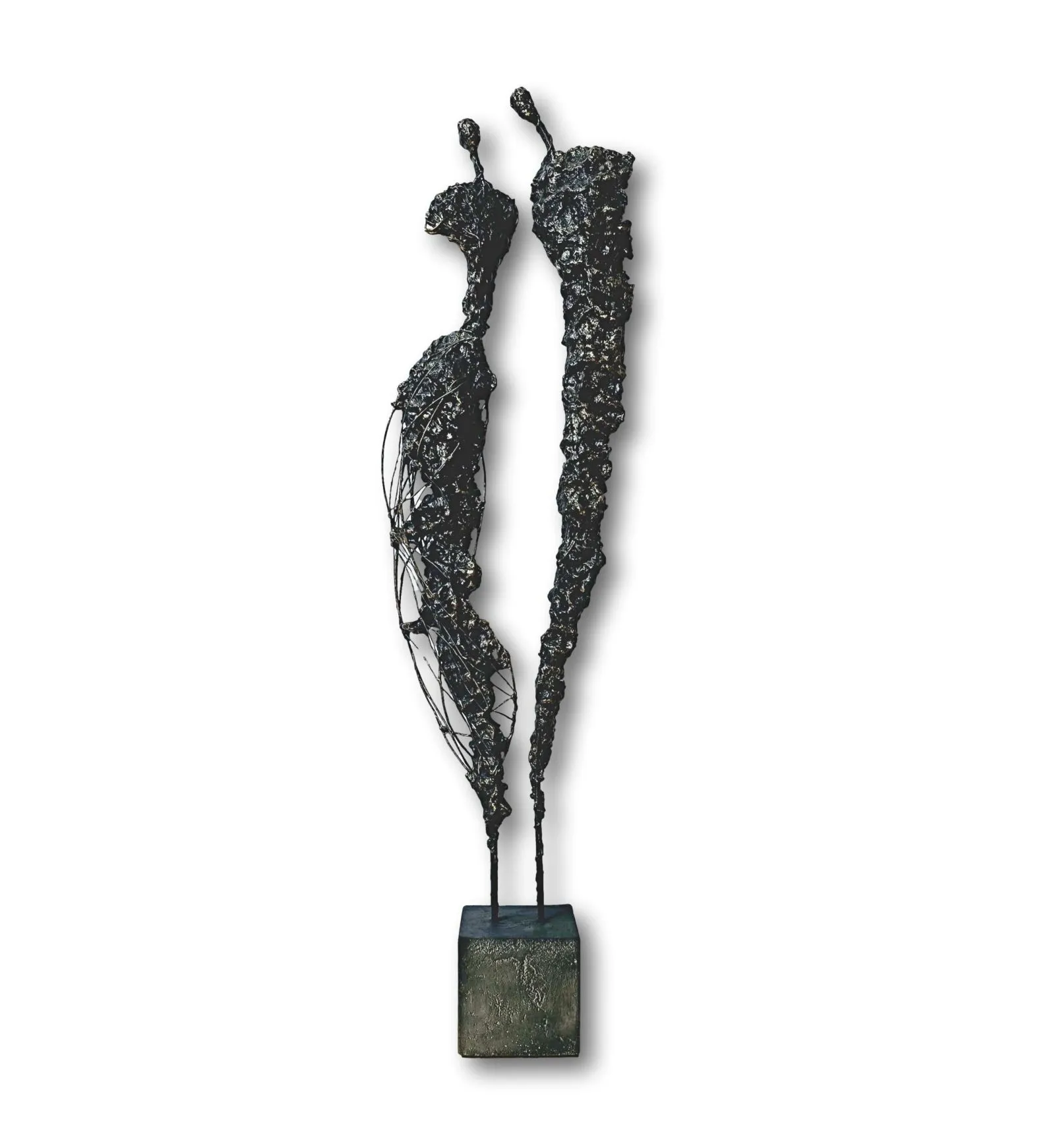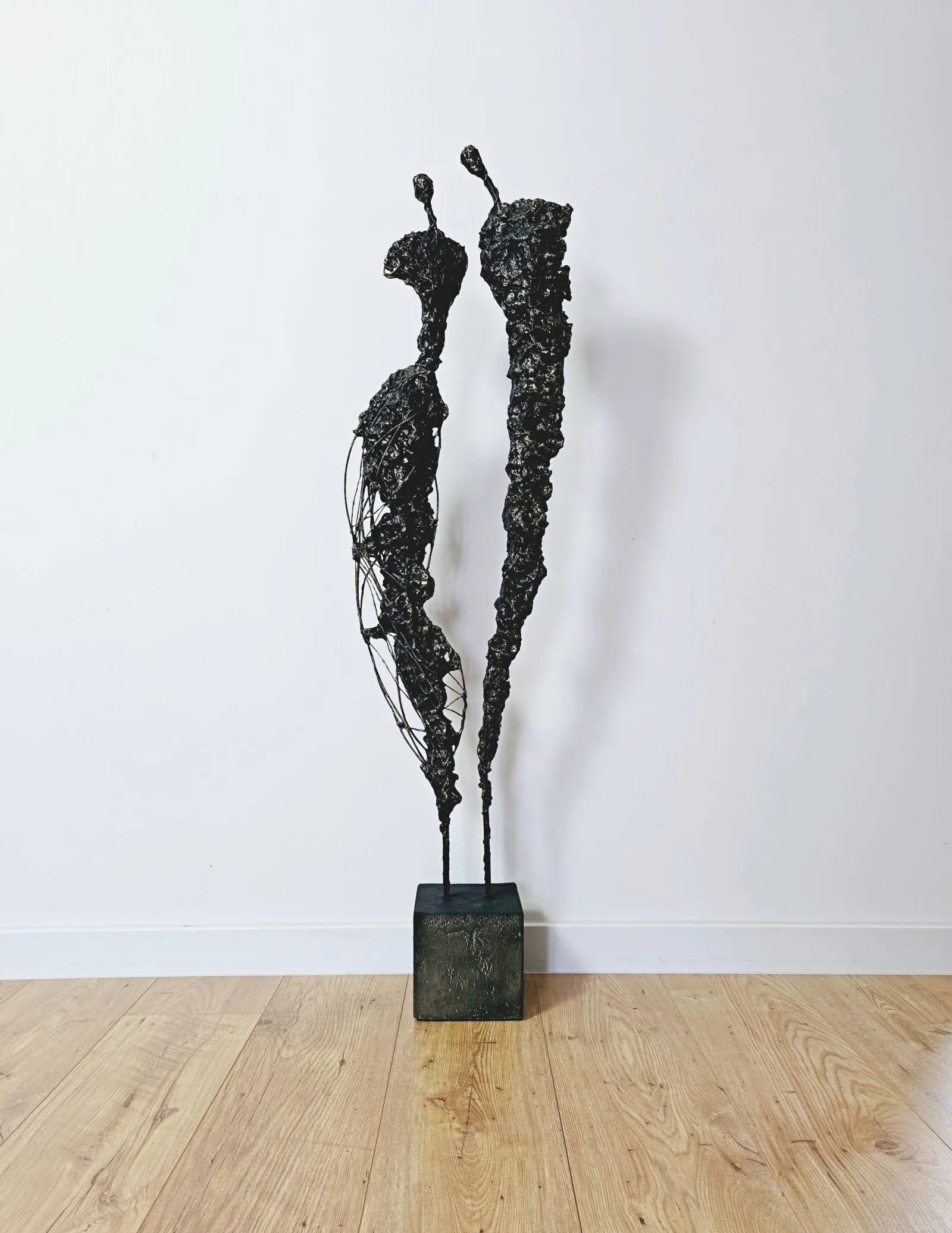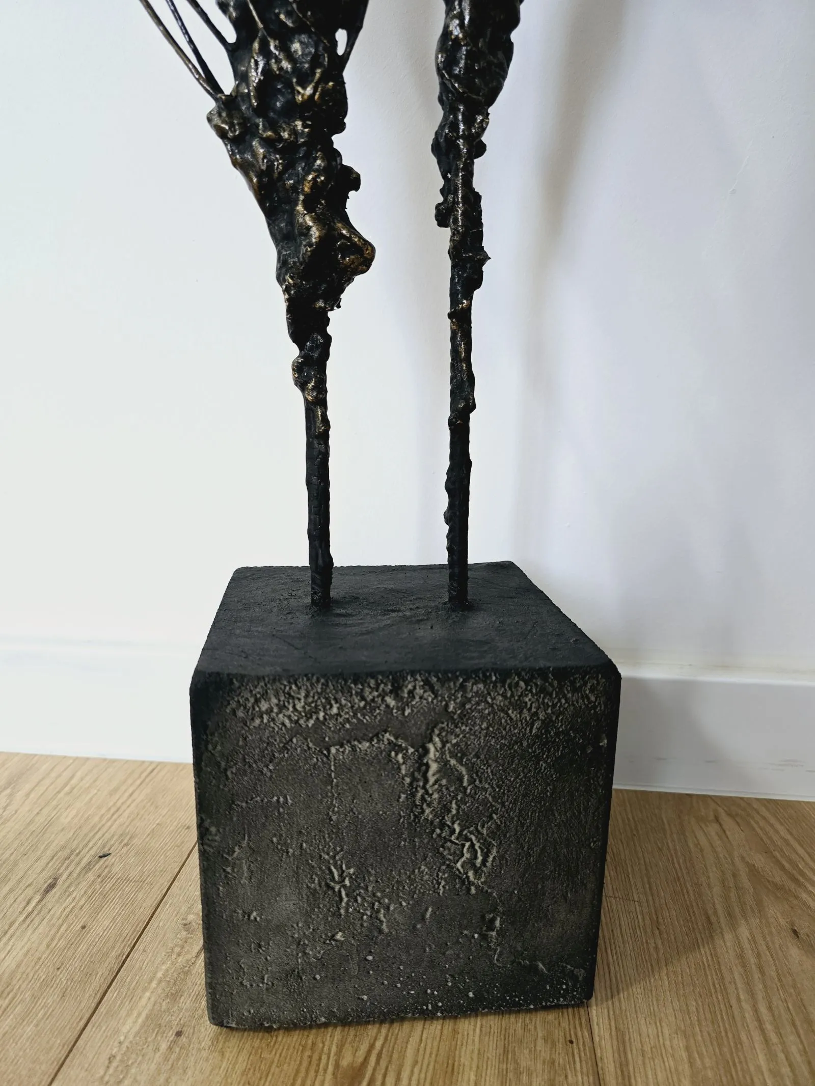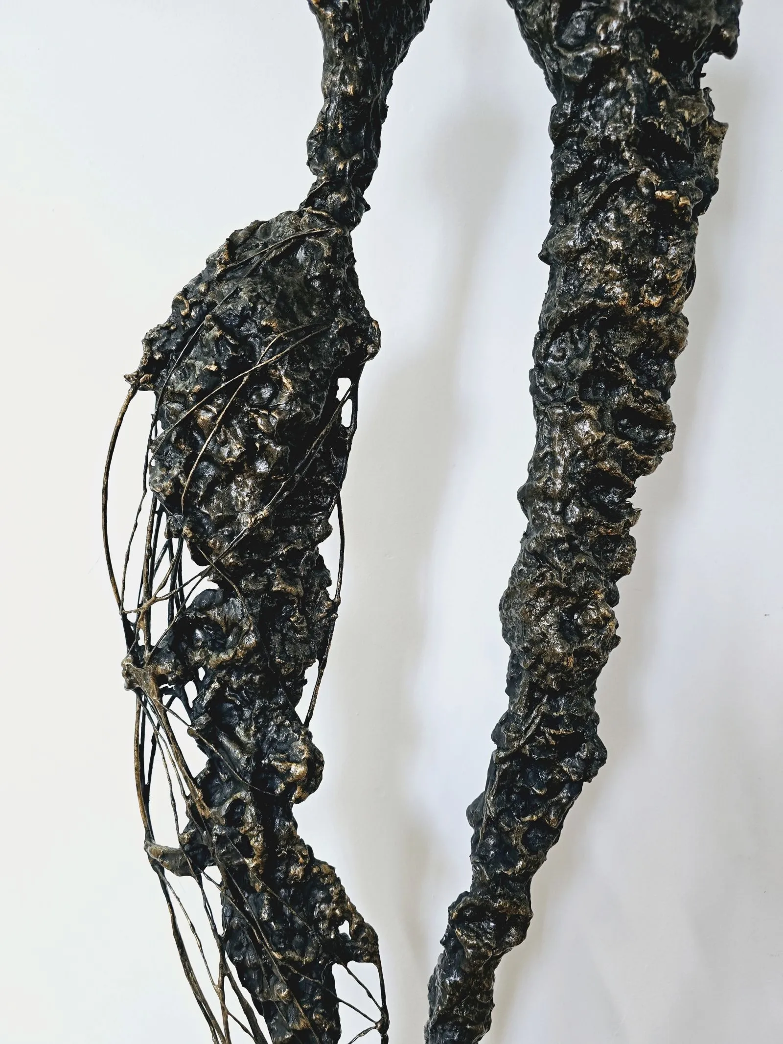 Rzeźba przedstawiająca ludzką postać, wykonana z metalu, gliny i betonu, to fascynujące dzieło łączące w sobie piękno niedoskonałej formy i subtelnie przebijające z niej emocje. Postać spleciona z gliny i skomplikowanej siatki nieregularnych linii, które przywodzą na myśl korzenie, gałęzie drzew, są jak tętniący życiem emocjonalny krwiobieg rzeźby. Te linie, niczym żywe nerwy, oplatają postać, tworząc dynamiczną i poruszającą teksturę, angażując widza w intymny dialog z materią.