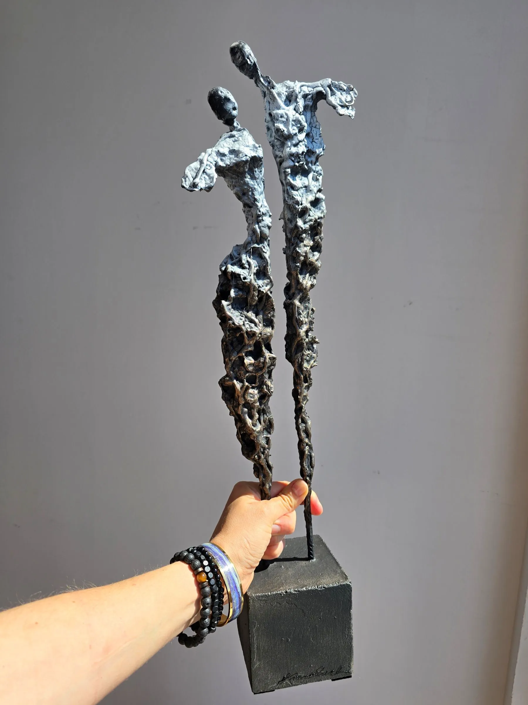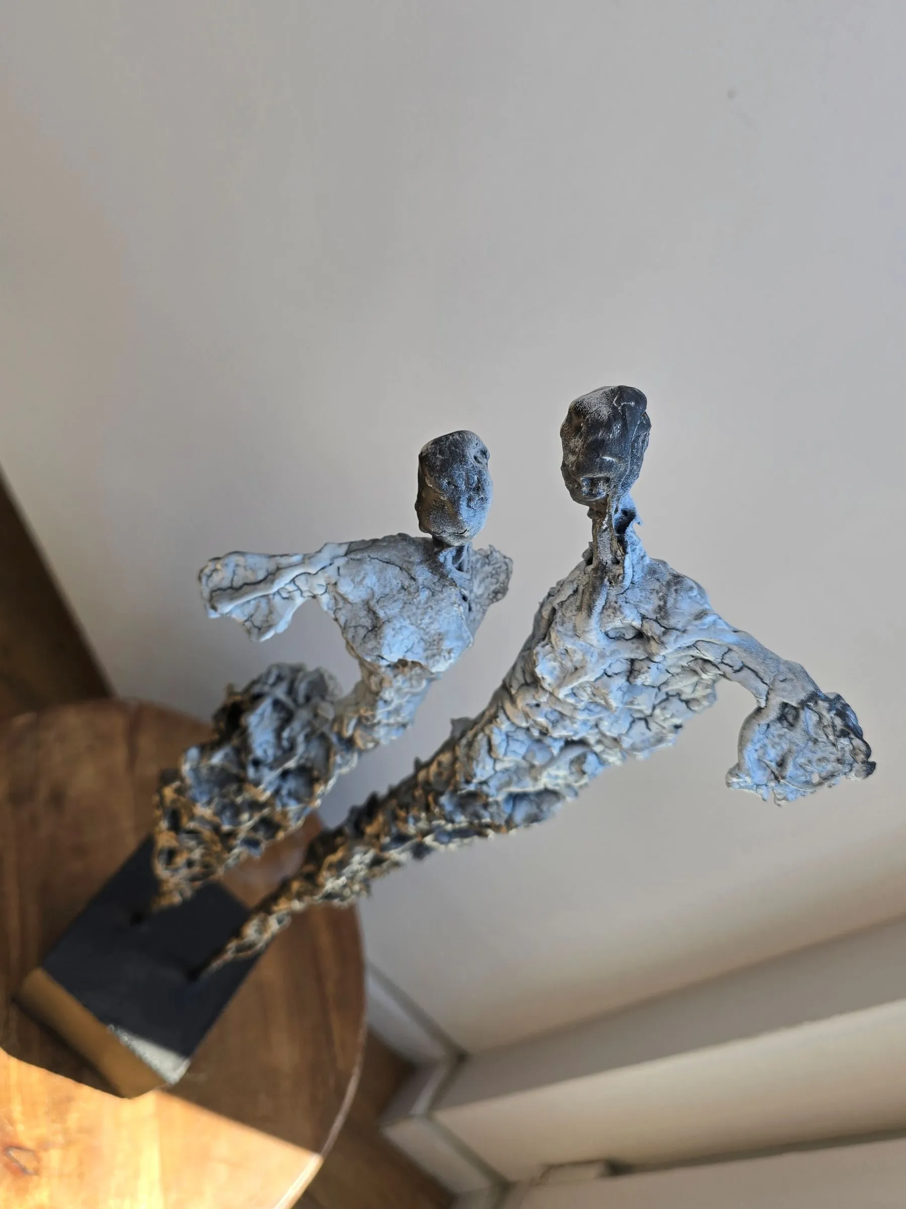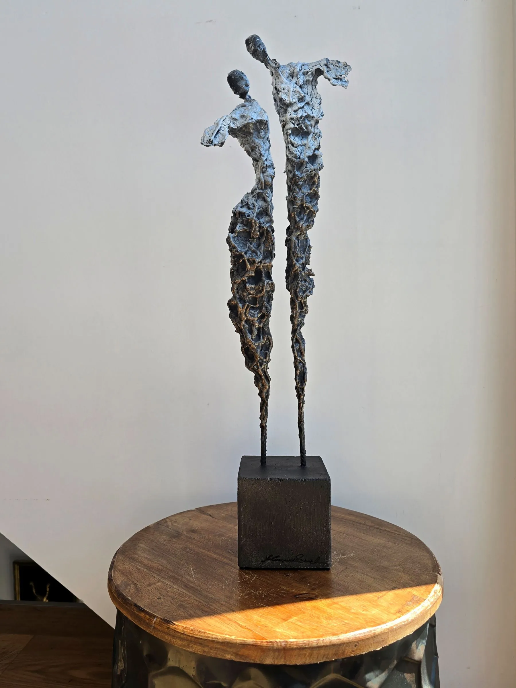 Rzeźba buduje ten dialog kontrastem materiałów: krucha glina spotyka surowy metal, a całość osadzona jest na solidnej podstawie. To metafora związku – dynamicznego, ale zakorzenionego.