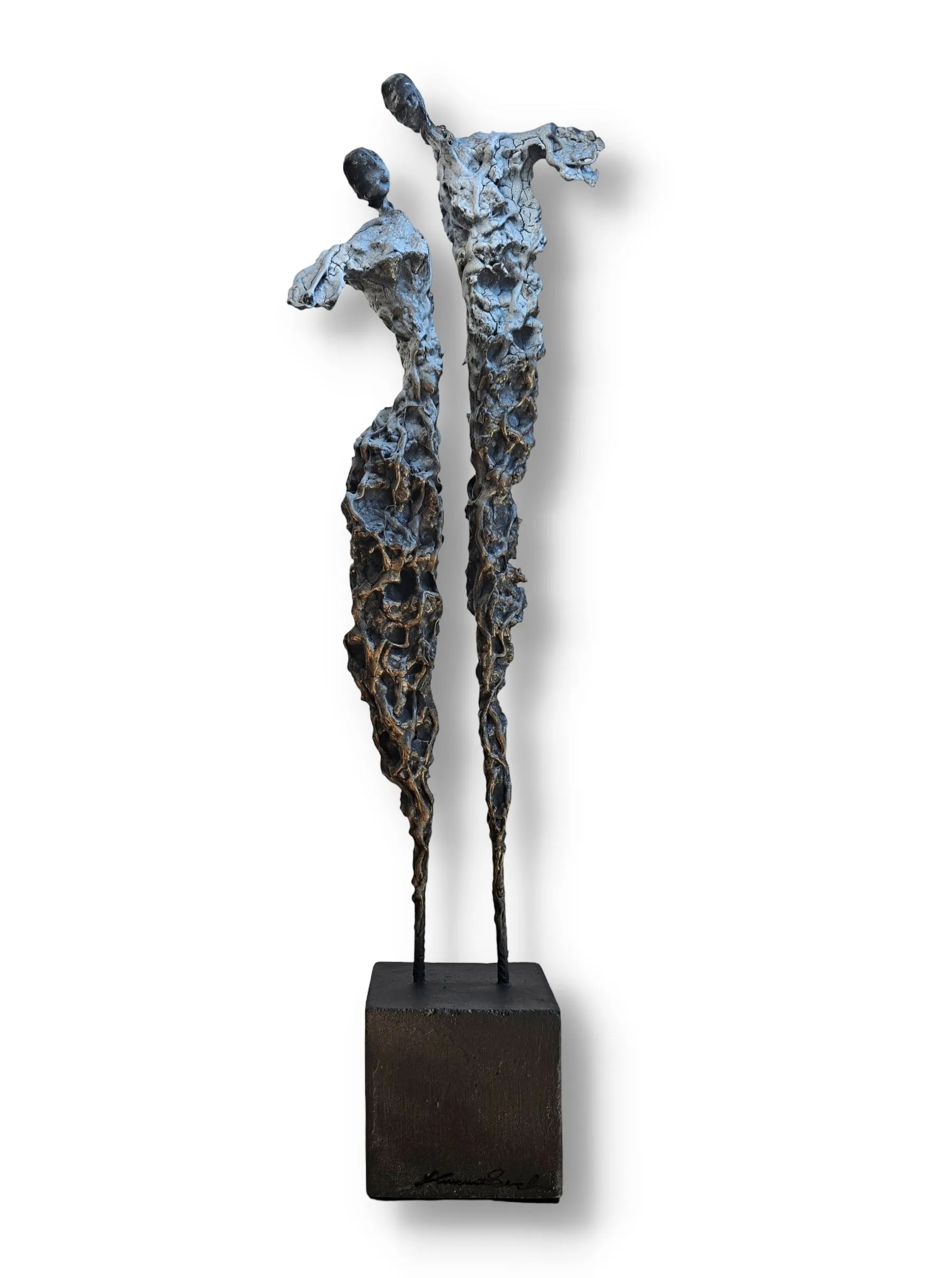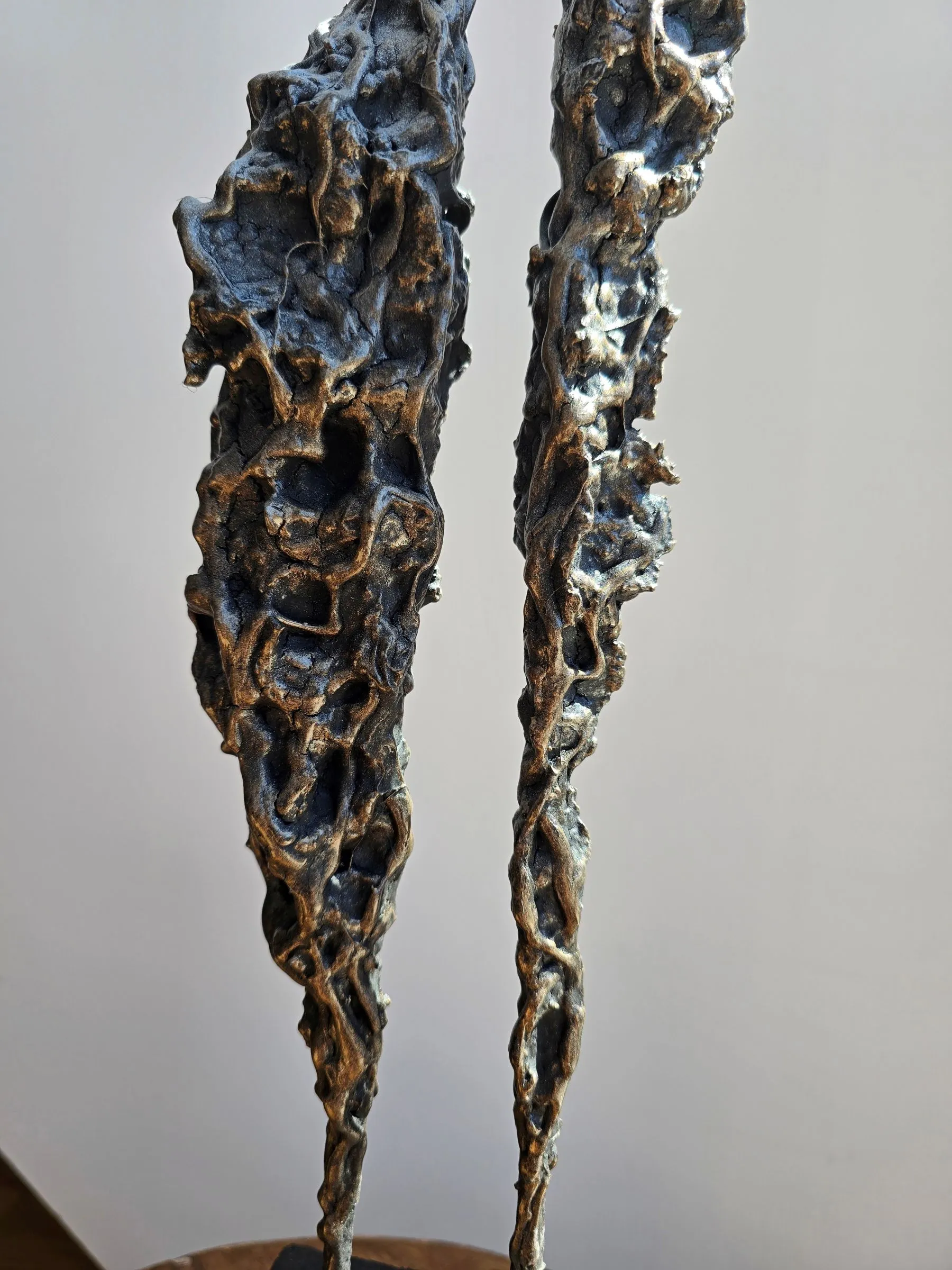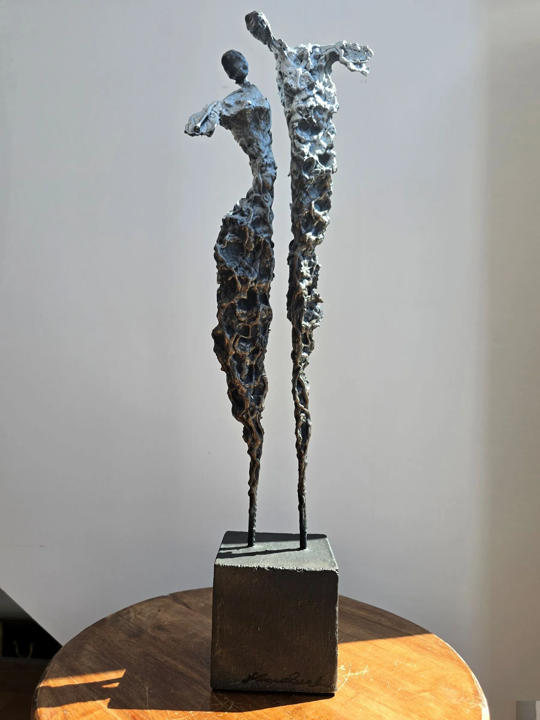 Rzeźba buduje ten dialog kontrastem materiałów: krucha glina spotyka surowy metal, a całość osadzona jest na solidnej podstawie. To metafora związku – dynamicznego, ale zakorzenionego.