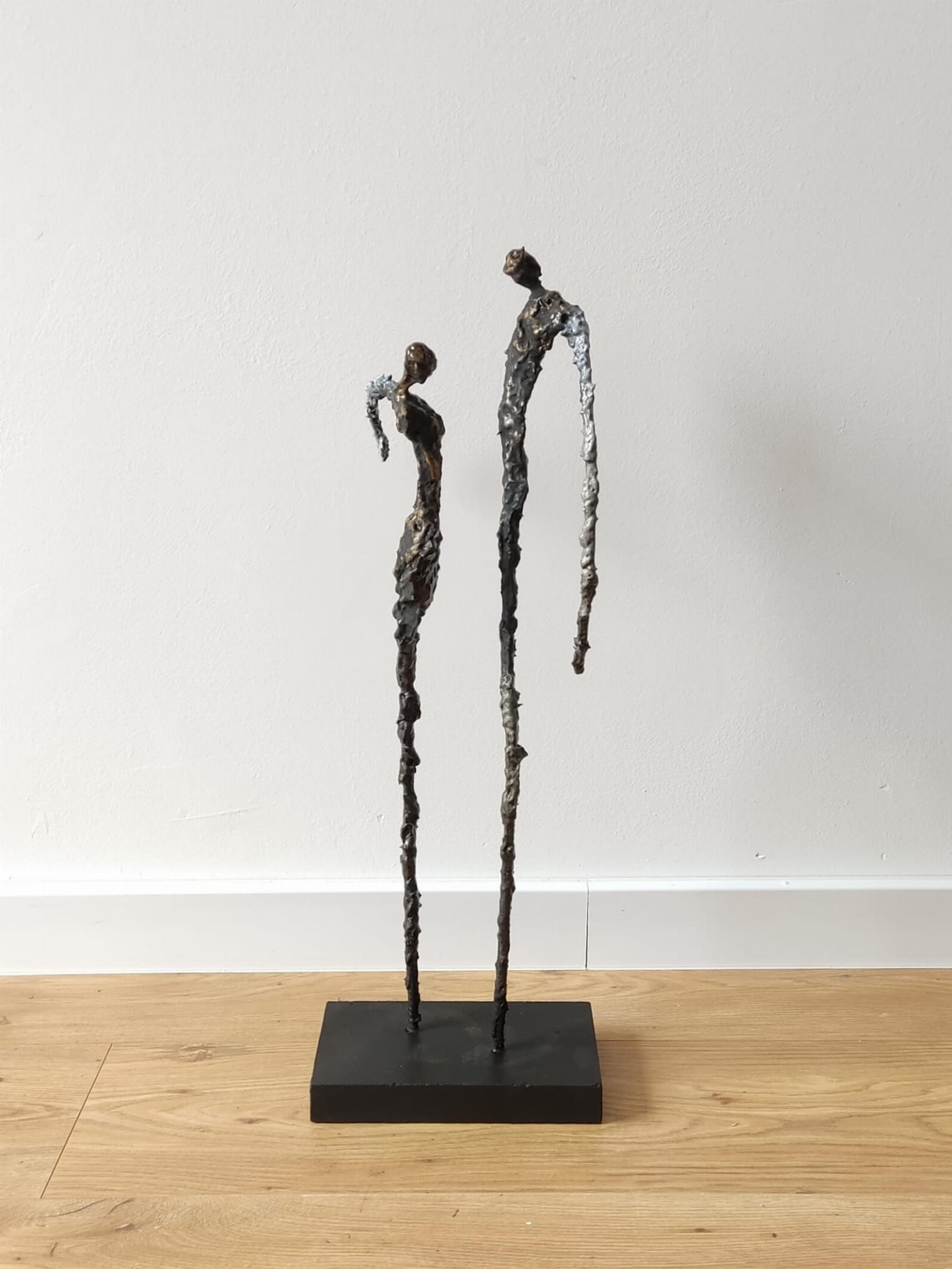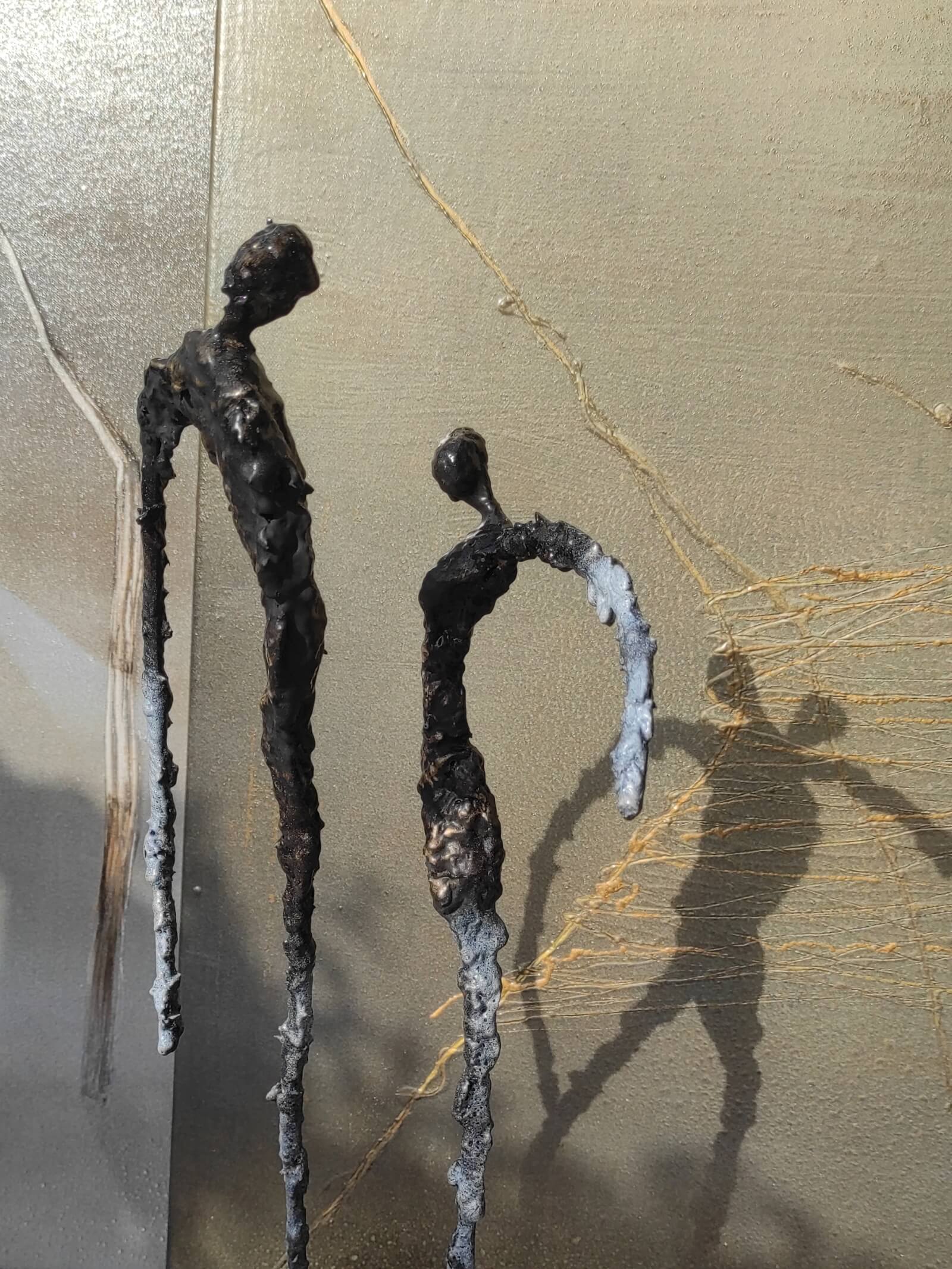 Rzeźba kobiety i mężczyzny została wykonana ze stali, gliny i kamienia na granitowym postumencie. Cykl rzeźb nawiązuje do kolekcji obrazów i grafik Point od Balance. Motyw kamiennych postaci został przeniesiony do formy przestrzennej. Biomorficzne kształty nawiązujące do ludzkich sylwetek wyrażające emocje i relacje jakie dzielimy z innymi. Rzeźba ma nowoczesną formę, surowość materiałów z jakich została wykonana, łączenia i spawy łagodzi plastyczność gliny i masy z sproszkowanego kamienia. Użyta kolorystyka uwydatnia charakter rzeźby. Delikatny połysk został częściowo zmatowiony, co daje efekt patyny. Rzeźba z cyklu Postać jest niezwykle osobliwa również ze względu na efekt jaki wywołuje oglądana z bliska, z uwagi na bogactwo szczegółów i szlachetność wykończenia.