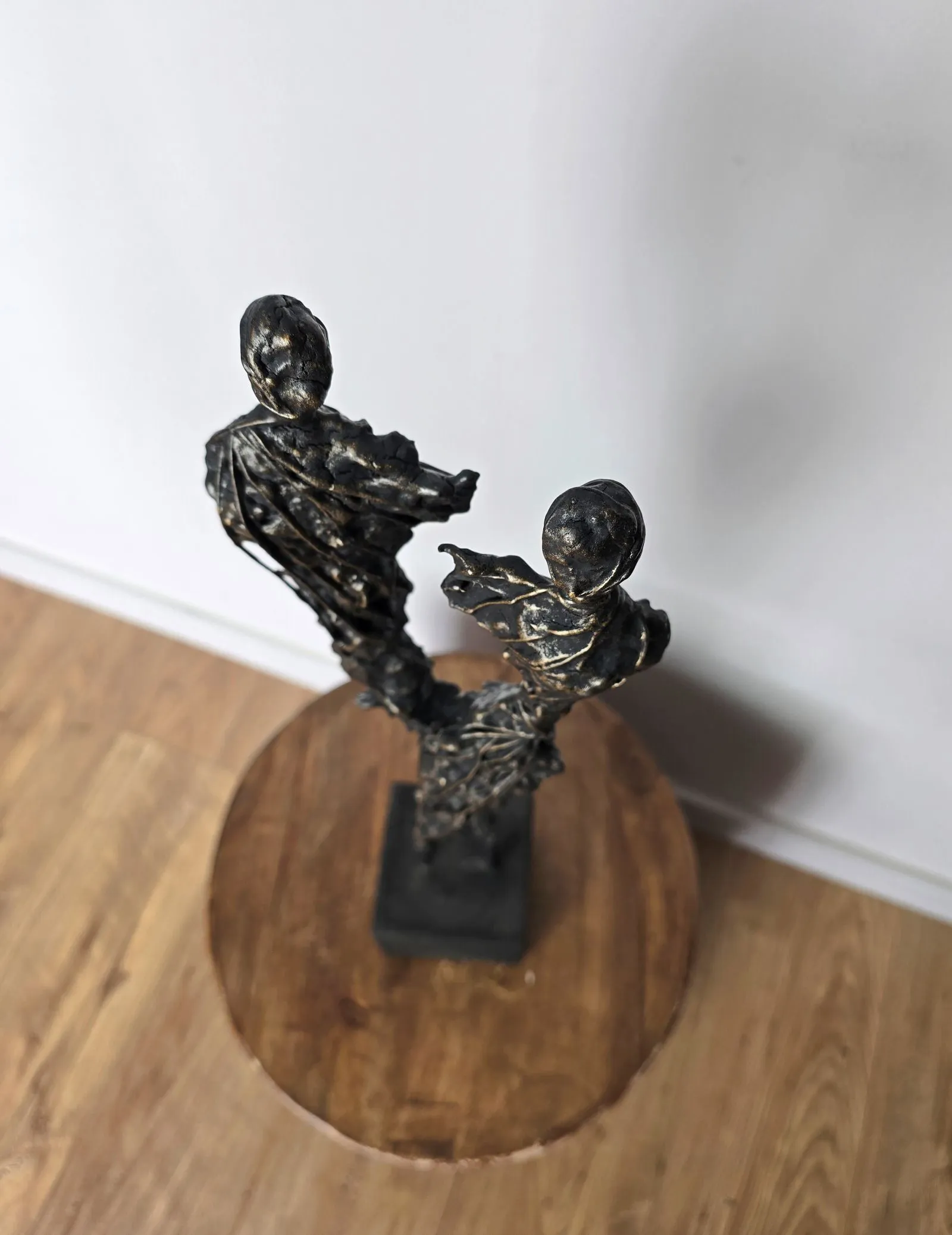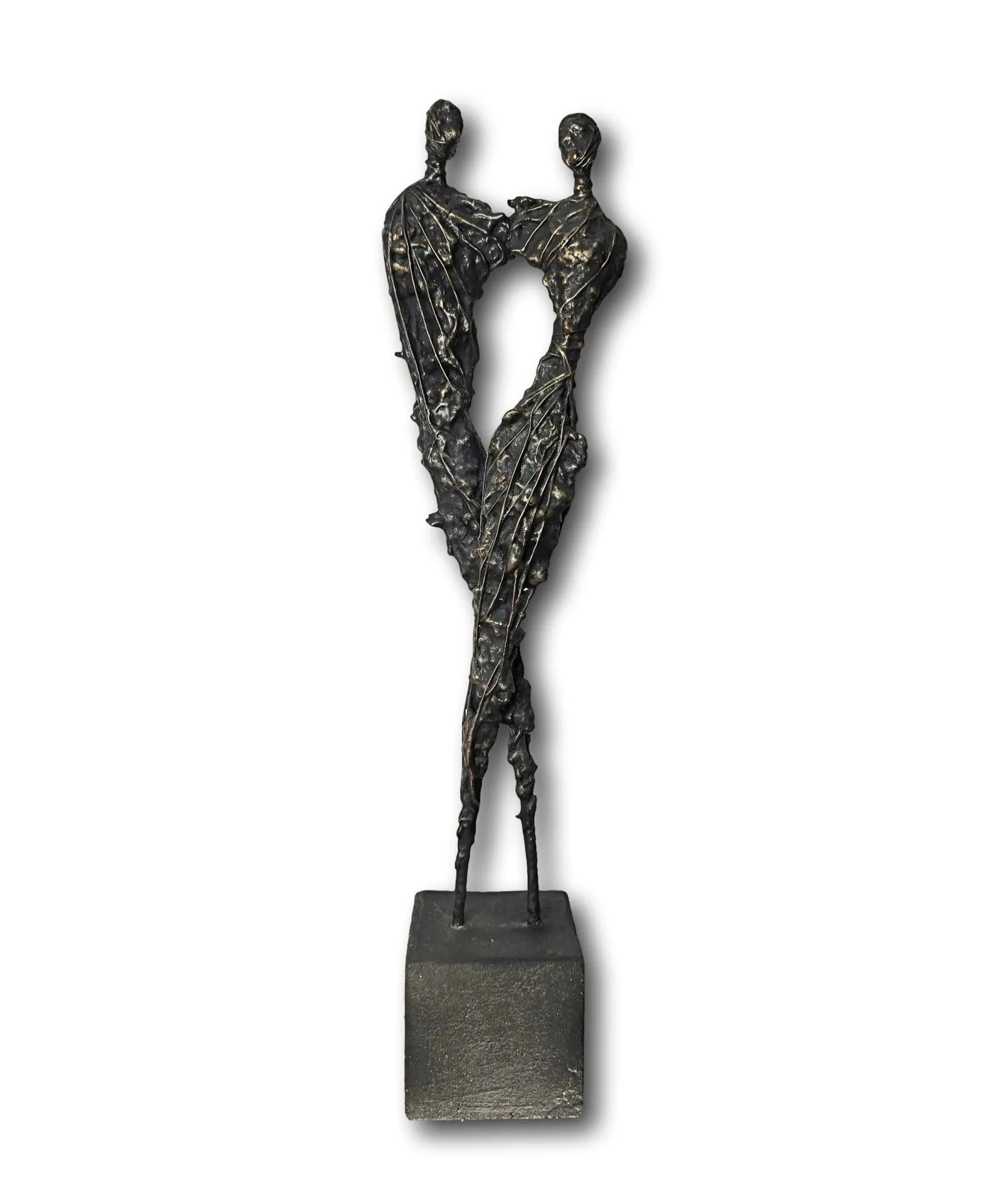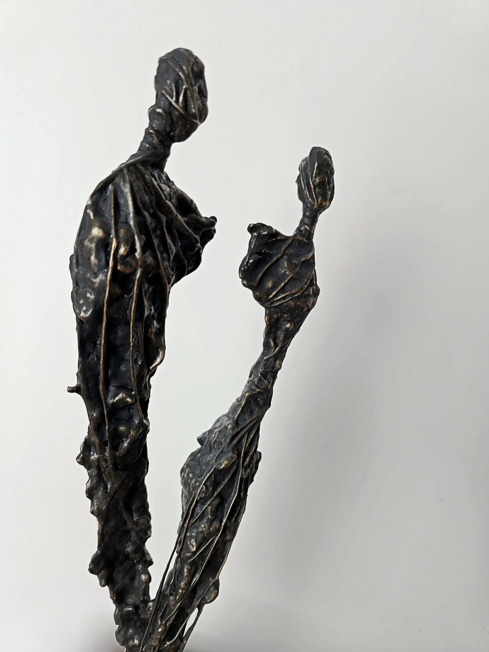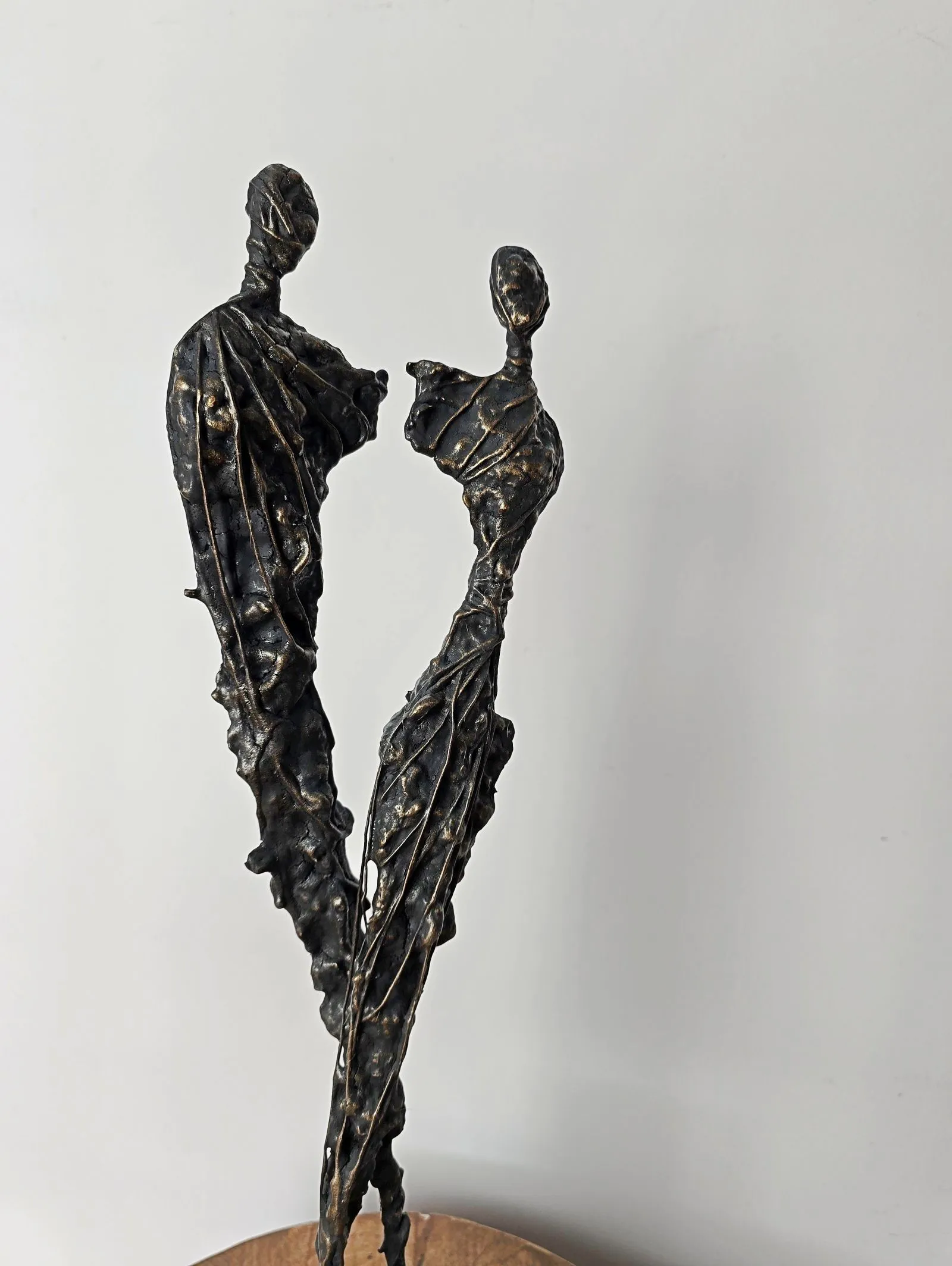 Rzeźba przedstawiająca ludzką postać, wykonana z metalu, gliny i betonu, to intrygujące dzieło, które harmonizuje piękno niedoskonałej formy z subtelnymi emocjami. Postać, spleciona z gliny i otoczona skomplikowaną siecią nieregularnych linii, przywodzi na myśl korzenie i gałęzie drzew, tworząc emocjonalny krwiobieg rzeźby. Te linie, niczym żywe nerwy, oplatają postać, nadając jej dynamiczną i poruszającą teksturę, która wciąga widza w intymny dialog z materią.