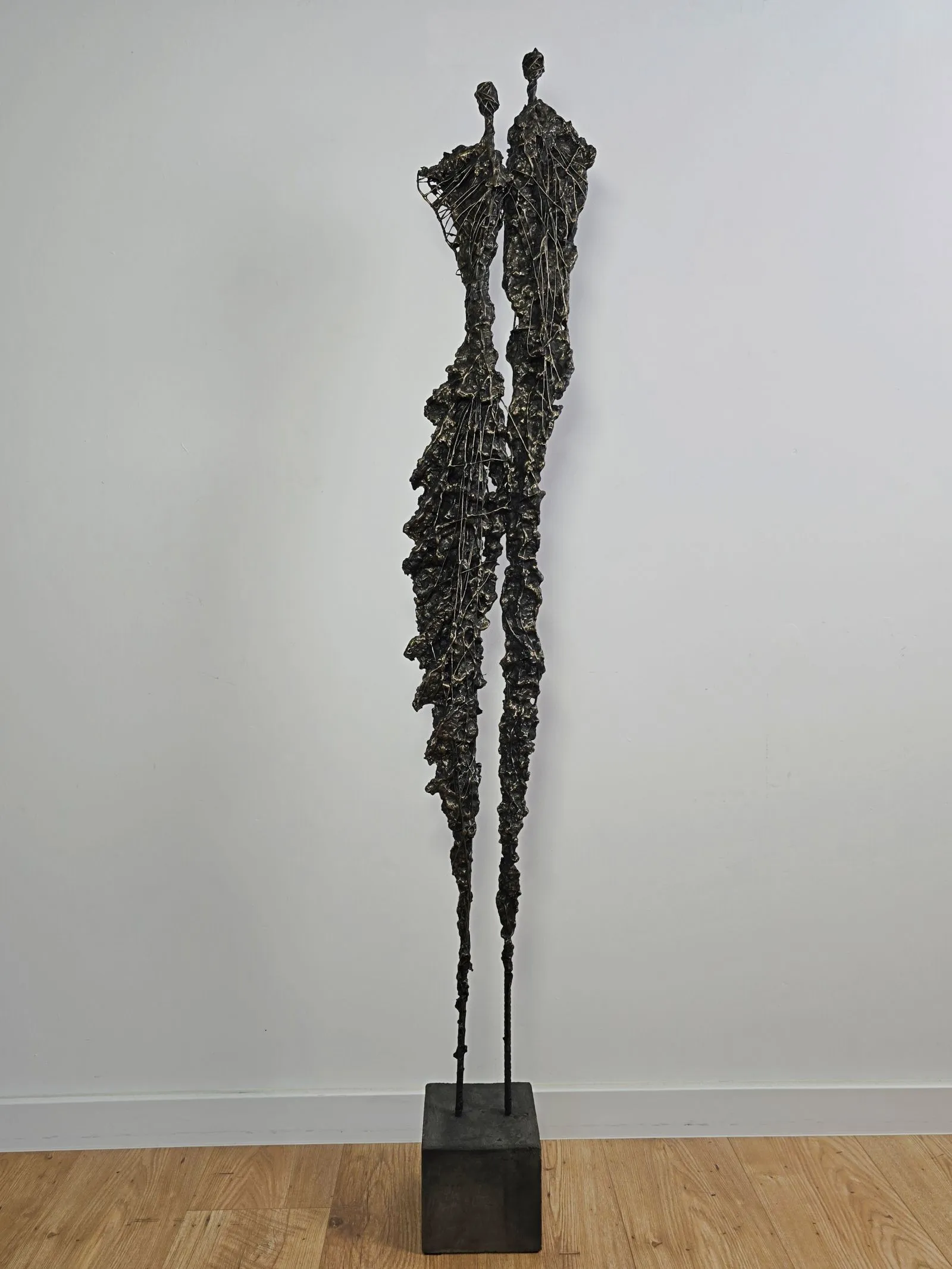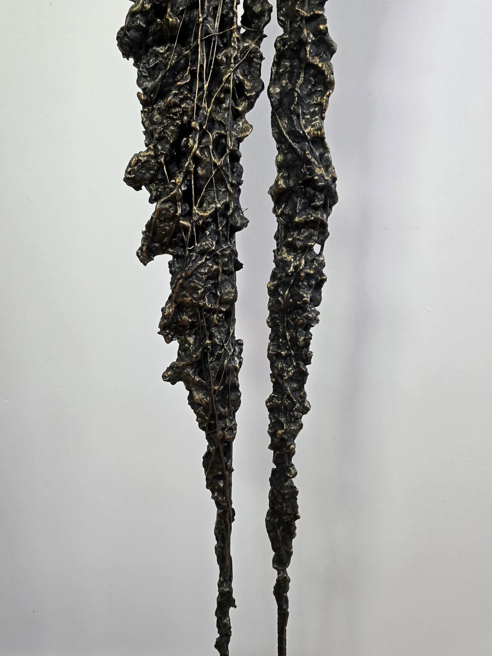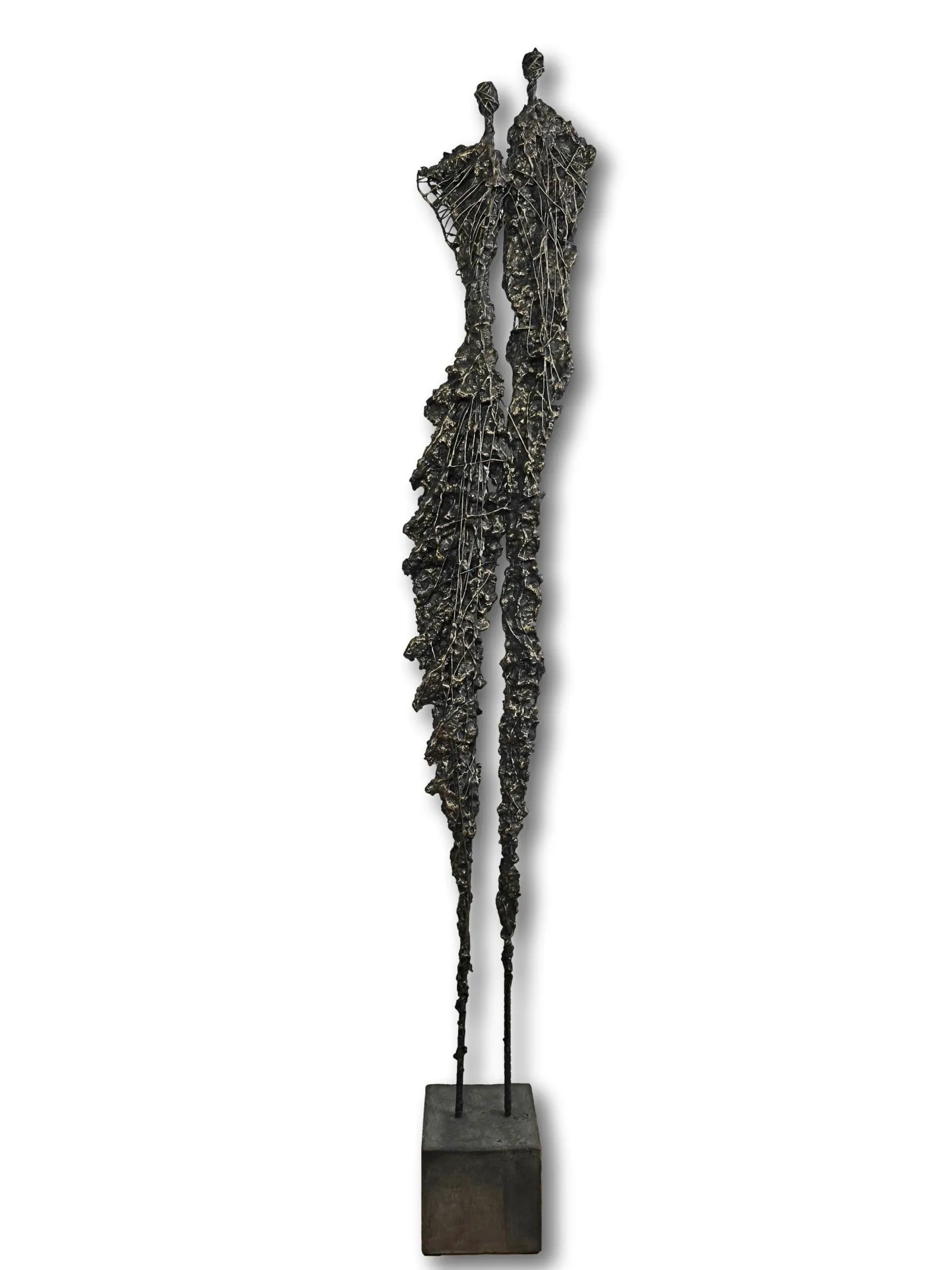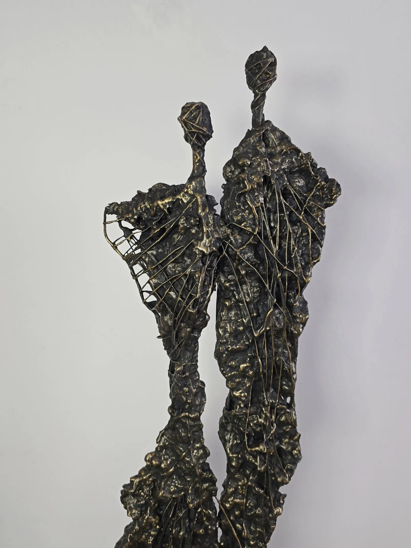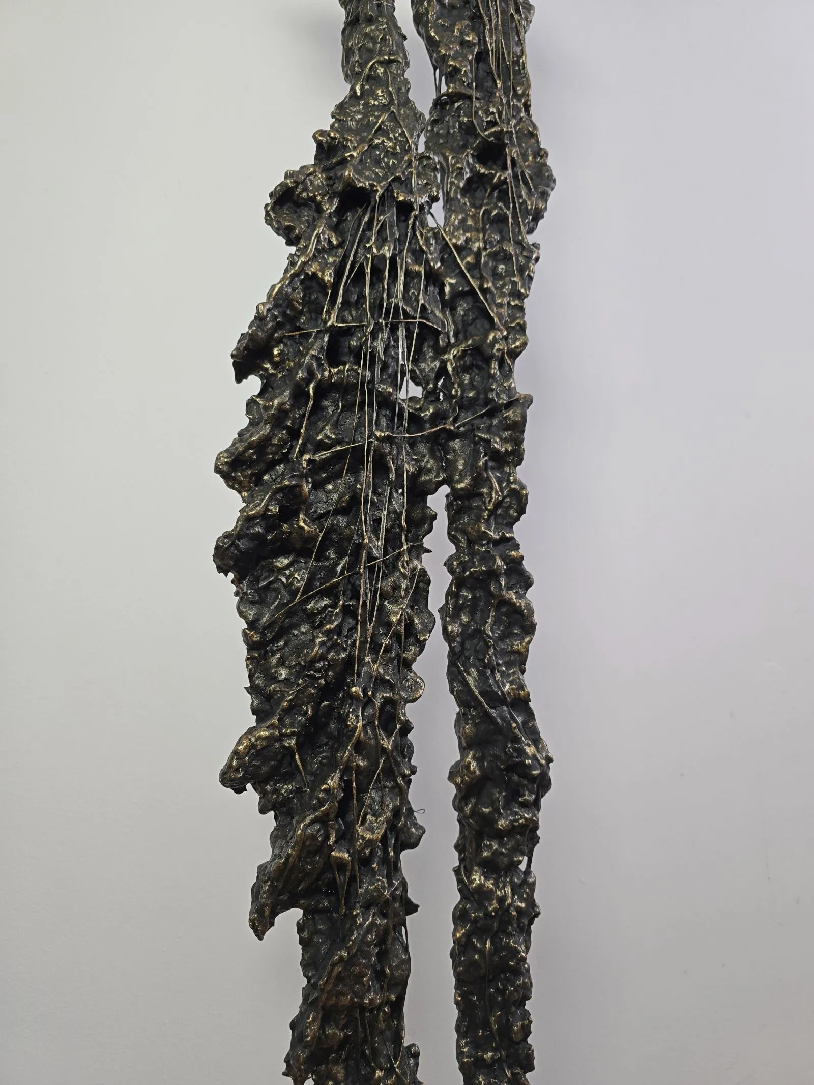 Ta wyjątkowa rzeźba z metalu i gliny emanuje elegancją i abstrakcyjnym pięknem. Wysokie, smukłe formy przypominają sylwetki postaci, które zdają się być na granicy rozpadu i odnowy. Metal tworzy misterną, ażurową strukturę, która kontrastuje z solidną podstawą, symbolizując równowagę między kruchością a trwałością. Dzieło przyciąga wzrok swoją subtelną gracją i dynamiczną formą, wpisując się w nurt nowoczesnej, młodej sztuki, która eksploruje granice formy i materiału.