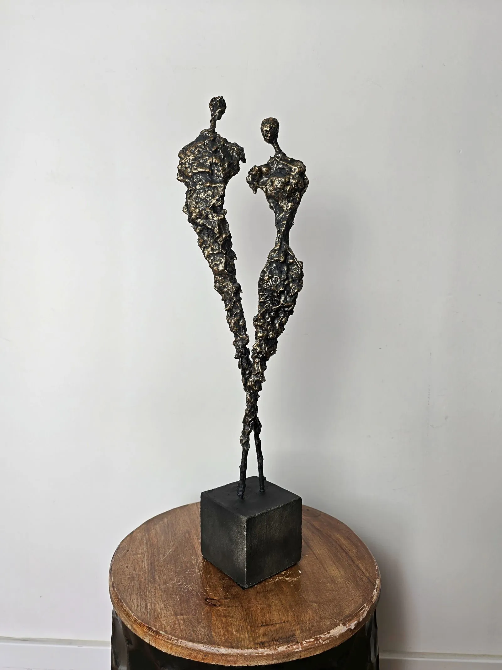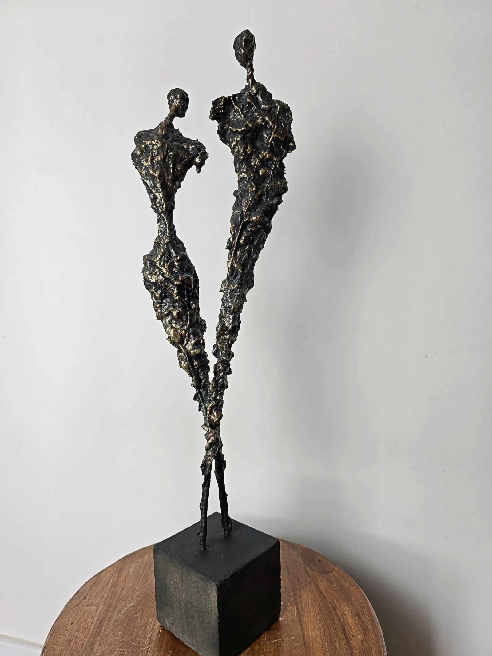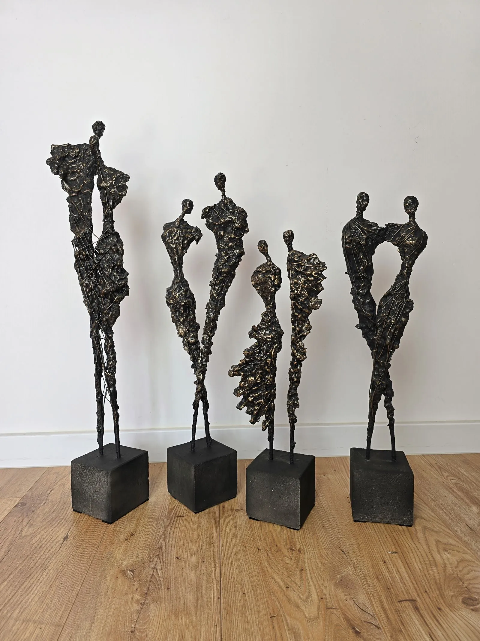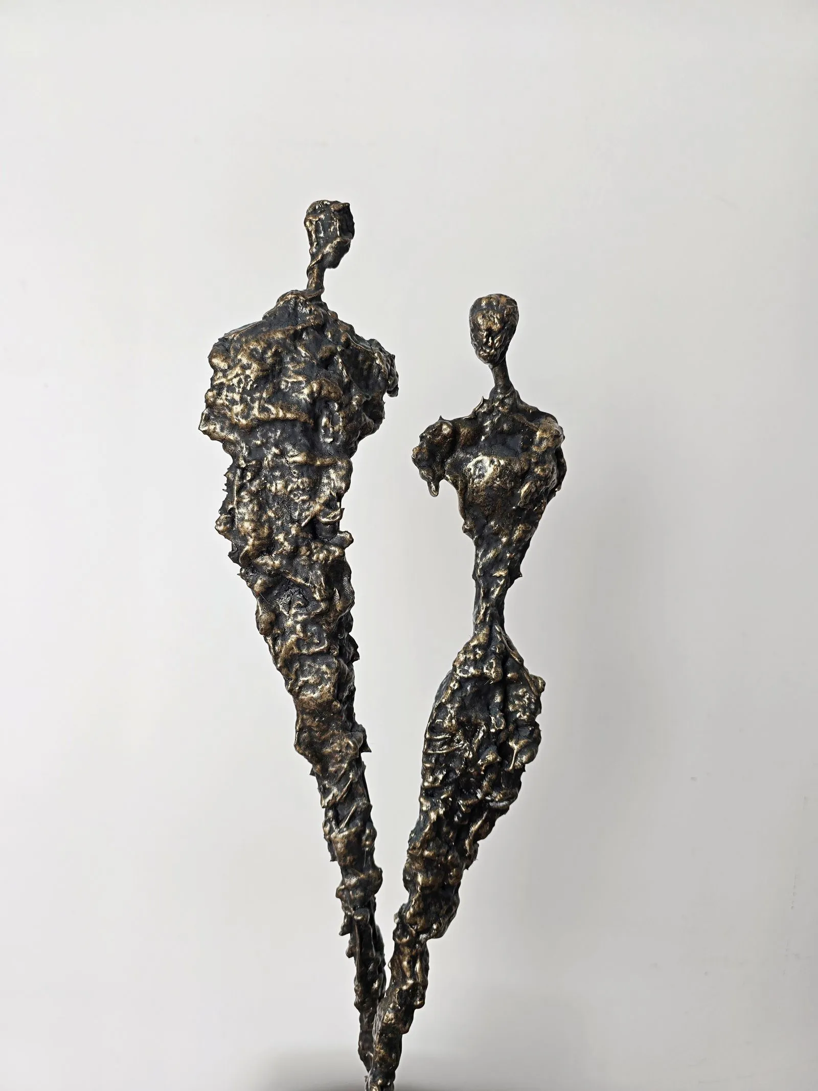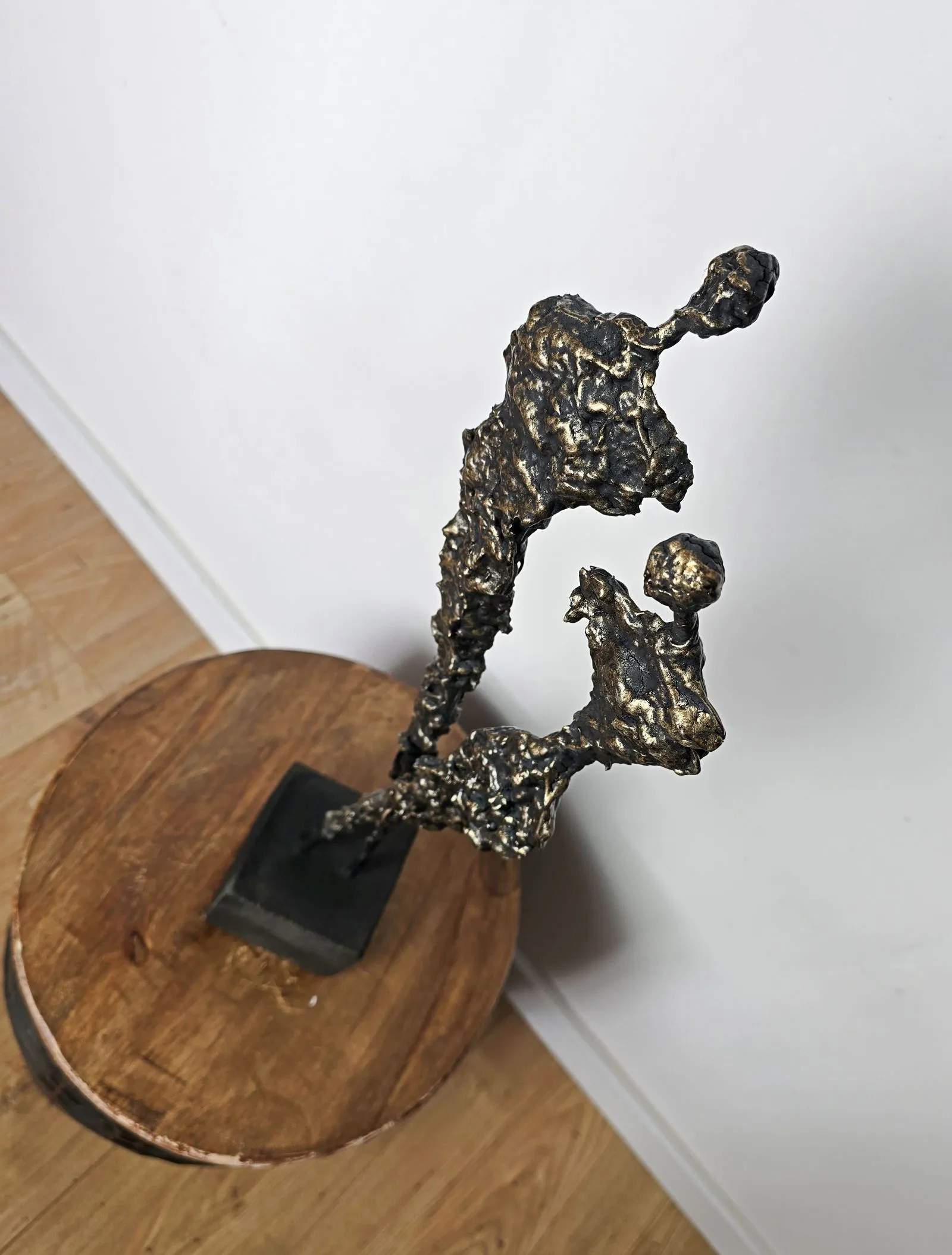 Rzeźba przedstawiająca ludzką postać, wykonana z metalu, gliny i betonu, to intrygujące dzieło, które harmonizuje piękno niedoskonałej formy z subtelnymi emocjami. Postać, spleciona z gliny i otoczona skomplikowaną siecią nieregularnych linii, przywodzi na myśl korzenie i gałęzie drzew, tworząc emocjonalny krwiobieg rzeźby. Te linie, niczym żywe nerwy, oplatają postać, nadając jej dynamiczną i poruszającą teksturę, która wciąga widza w intymny dialog z materią.