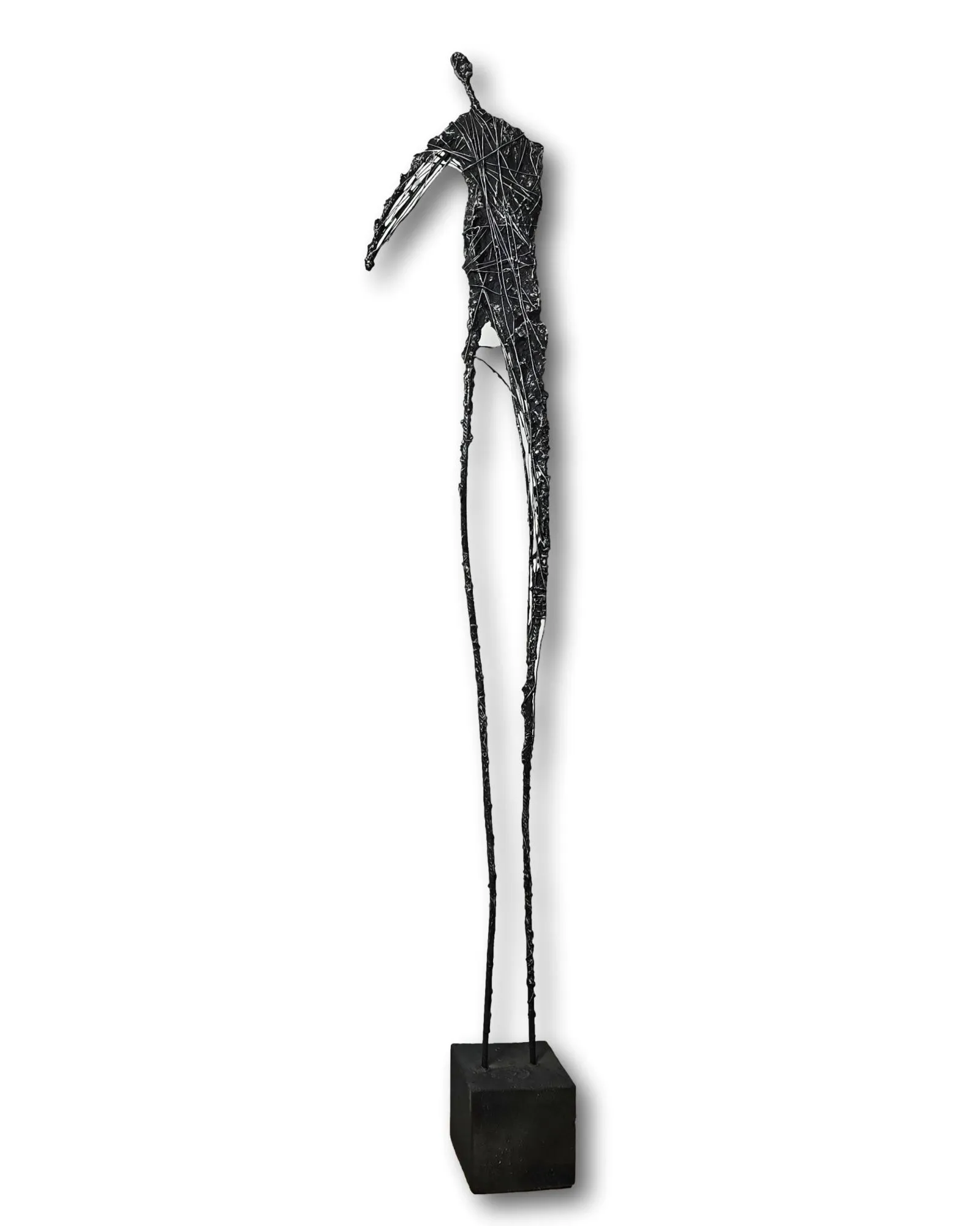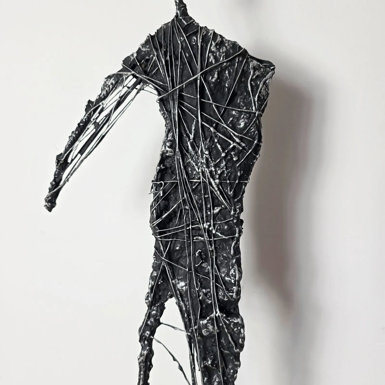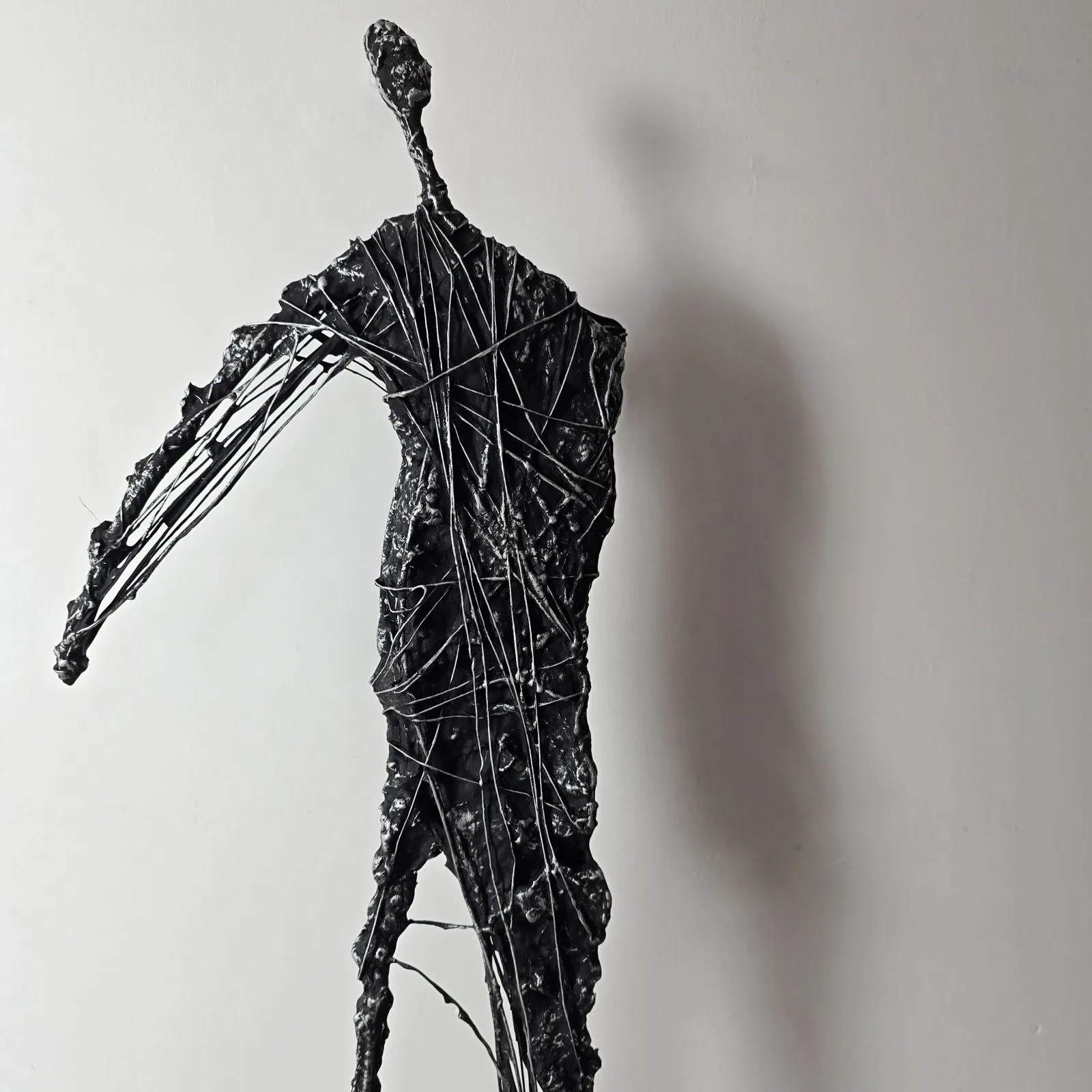 Rzeźba przedstawiająca ludzką postać, wykonana z metalu, gliny i betonu, to fascynujące dzieło łączące w sobie piękno niedoskonałej formy i subtelnie przebijające z niej emocje. Postać spleciona z gliny i skomplikowanej siatki nieregularnych linii i kształtów, które są jak tętniący życiem emocjonalny krwiobieg rzeźby. Te linie, niczym żywe nerwy, oplatają postać, tworząc dynamiczną i poruszającą teksturę, angażując widza w intymny dialog z materią.