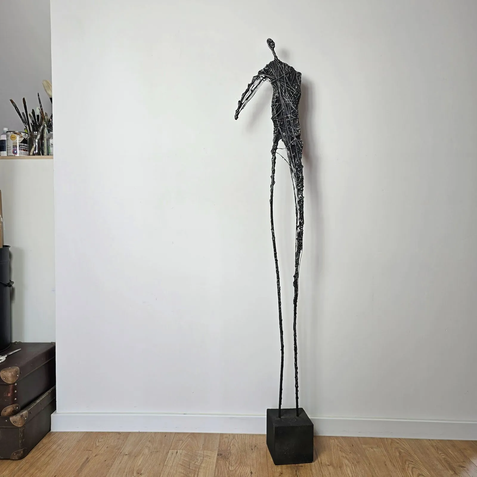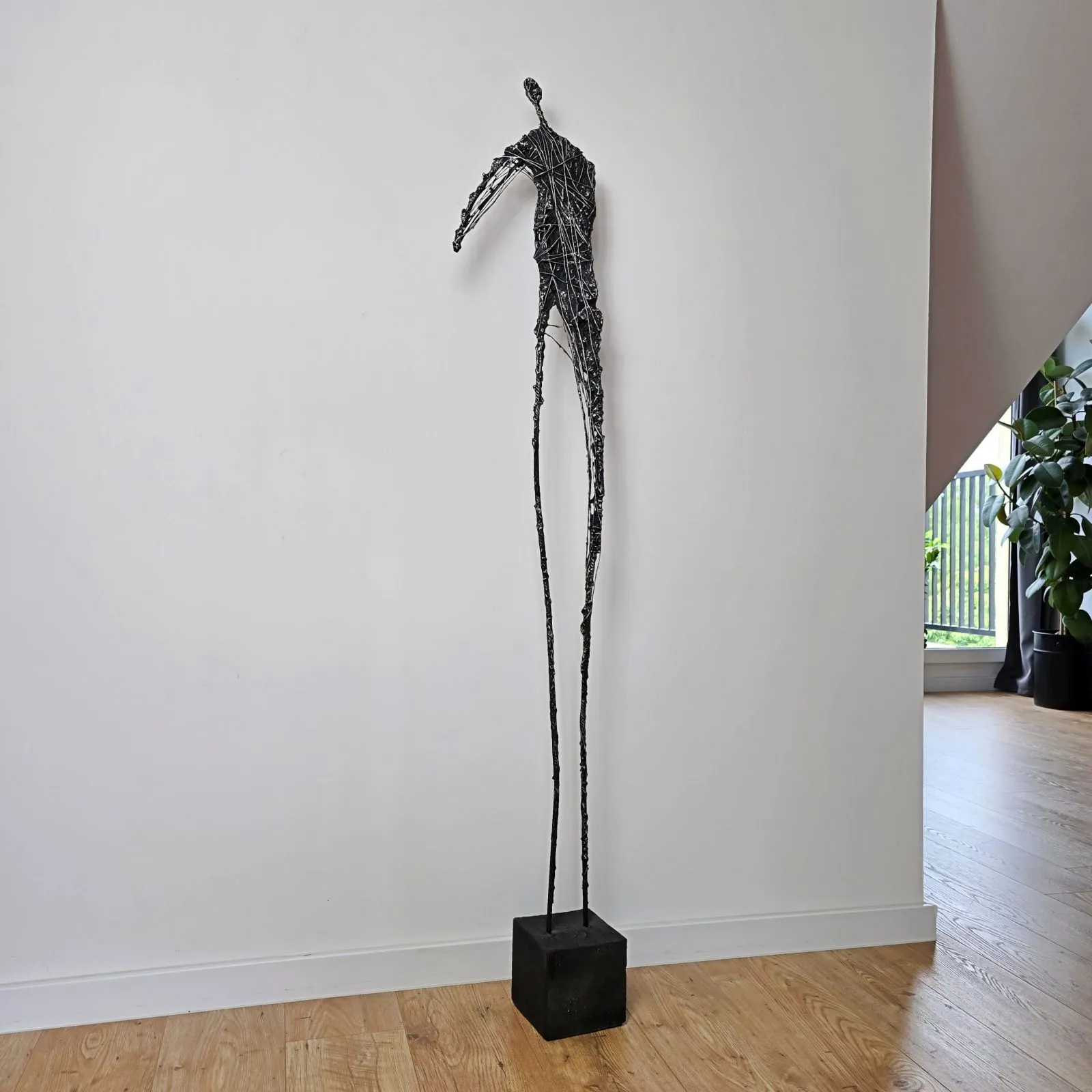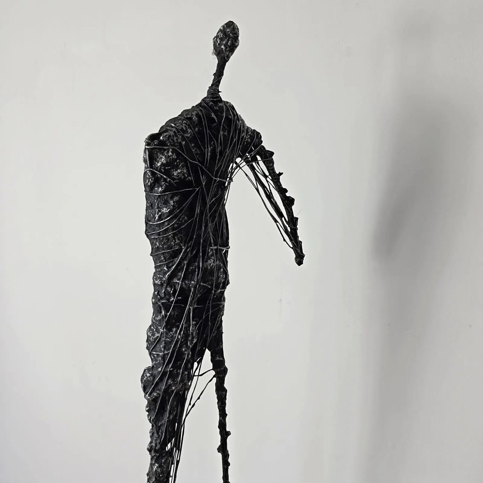 Rzeźba przedstawiająca ludzką postać, wykonana z metalu, gliny i betonu, to fascynujące dzieło łączące w sobie piękno niedoskonałej formy i subtelnie przebijające z niej emocje. Postać spleciona z gliny i skomplikowanej siatki nieregularnych linii i kształtów, które są jak tętniący życiem emocjonalny krwiobieg rzeźby. Te linie, niczym żywe nerwy, oplatają postać, tworząc dynamiczną i poruszającą teksturę, angażując widza w intymny dialog z materią.