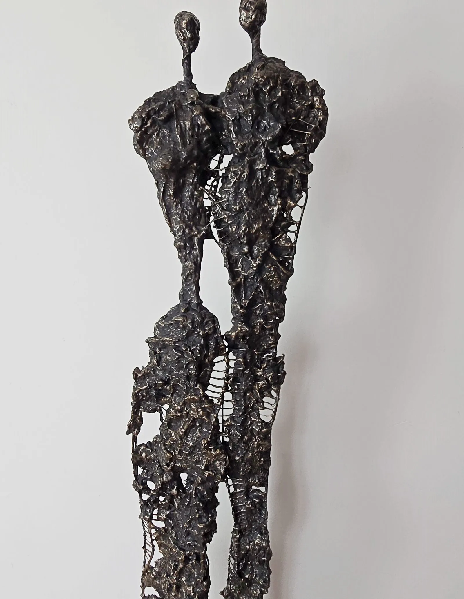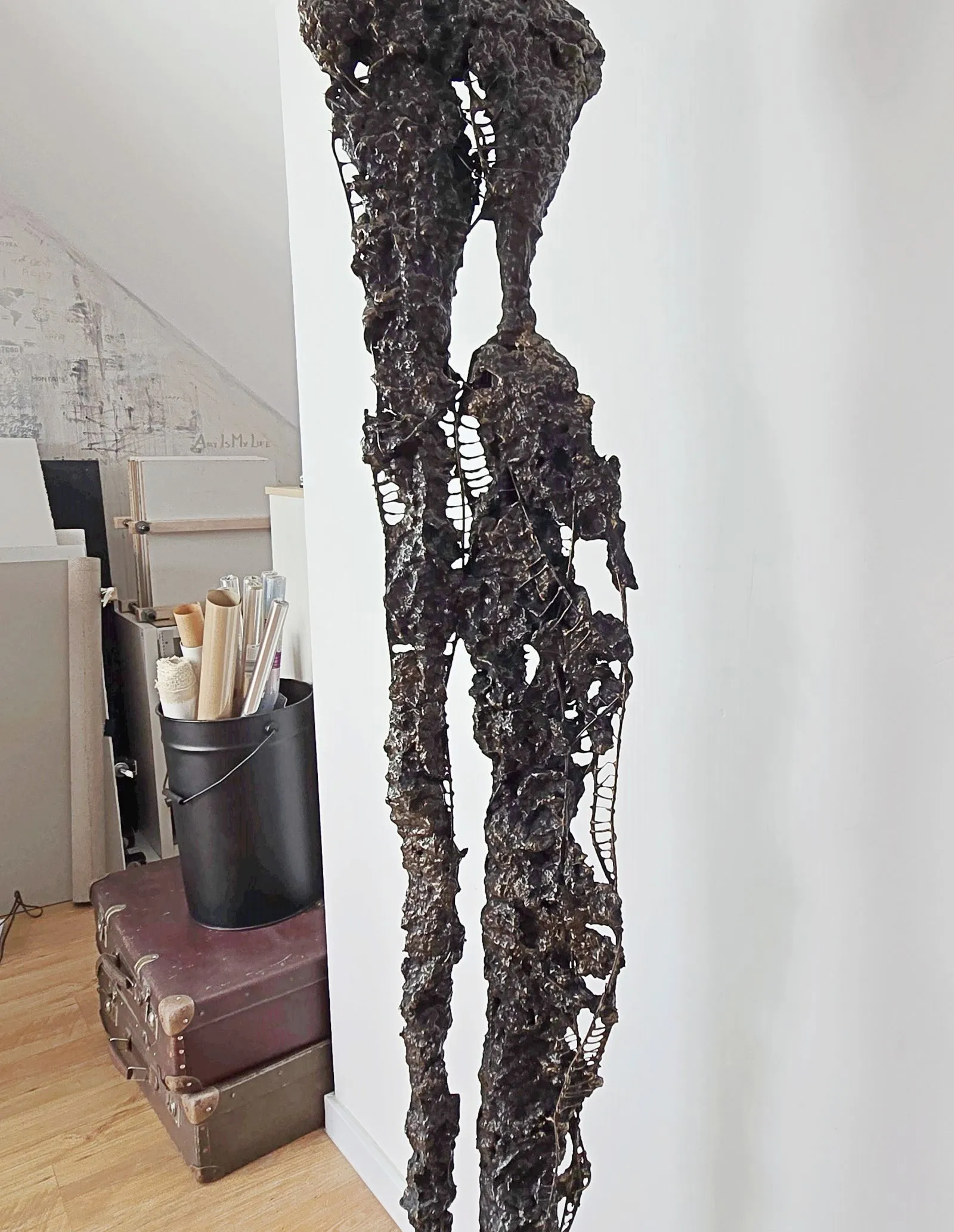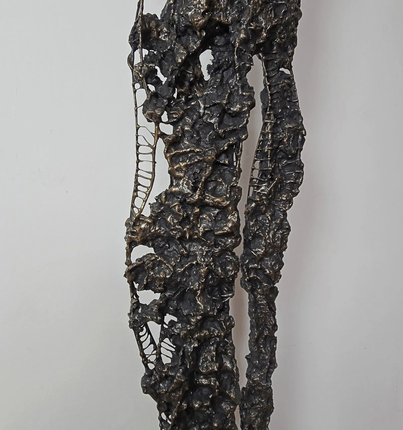 Rzeźba przedstawiająca ludzką postać, wykonana z metalu, gliny i betonu, to fascynujące dzieło łączące w sobie piękno niedoskonałej formy i subtelnie przebijające z niej emocje. Postać spleciona z gliny i skomplikowanej siatki nieregularnych linii, które przywodzą na myśl korzenie, gałęzie drzew, są jak tętniący życiem emocjonalny krwiobieg rzeźby. Te linie, niczym żywe nerwy, oplatają postać, tworząc dynamiczną i poruszającą teksturę, angażując widza w intymny dialog z materią.