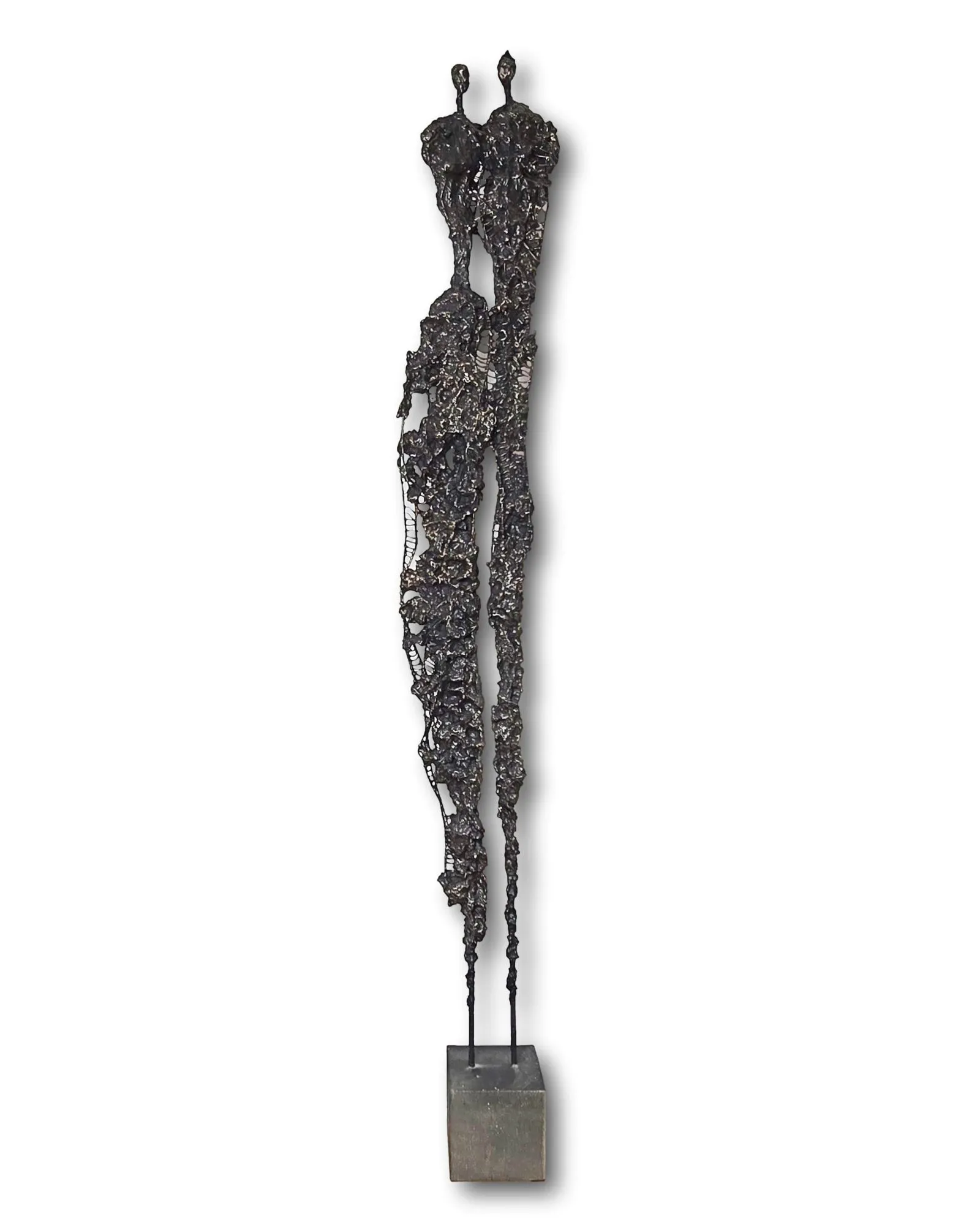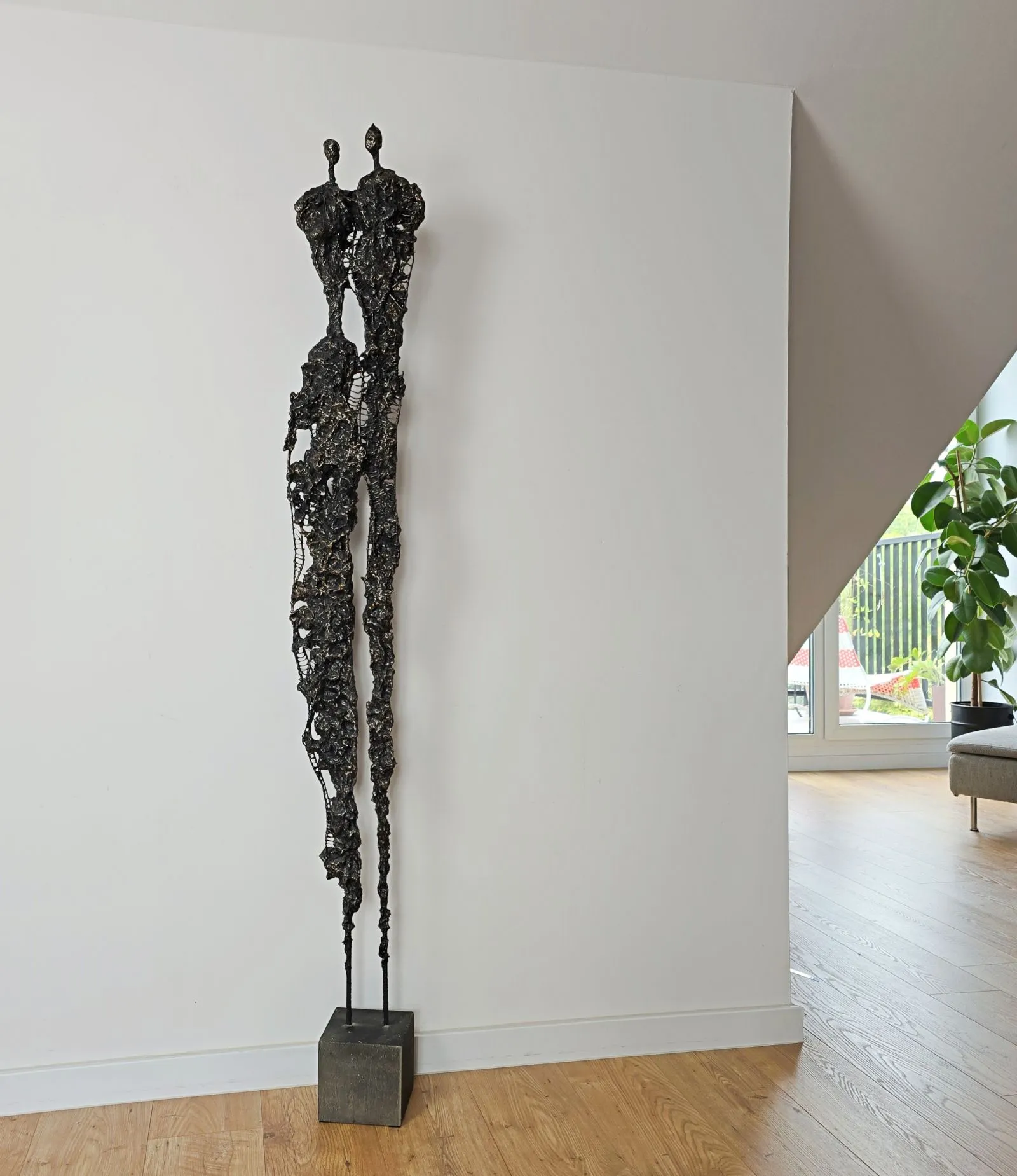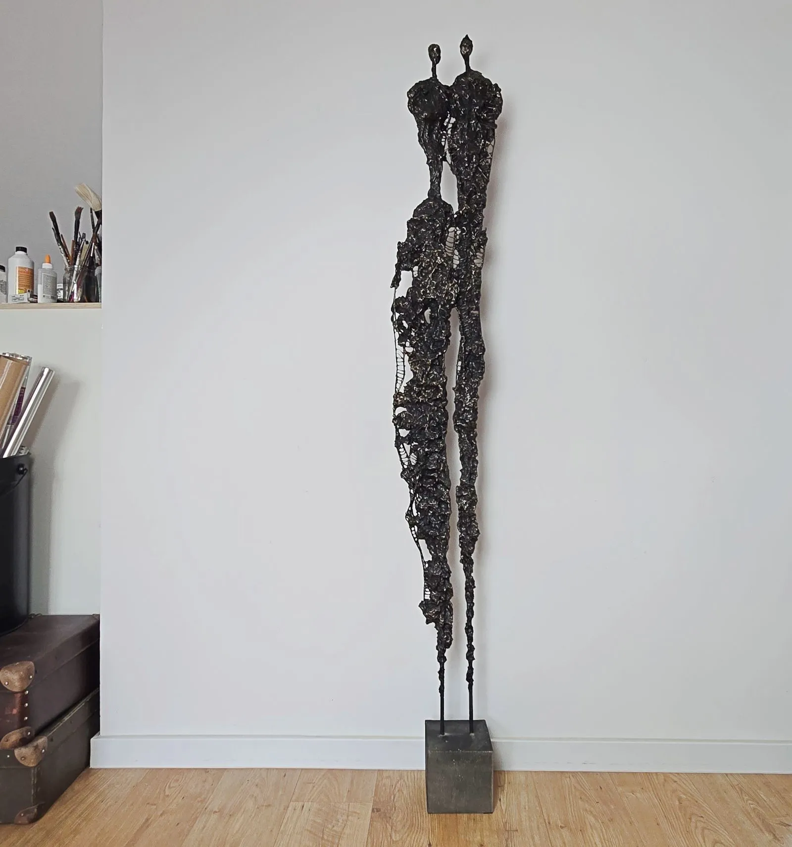 Rzeźba przedstawiająca ludzką postać, wykonana z metalu, gliny i betonu, to fascynujące dzieło łączące w sobie piękno niedoskonałej formy i subtelnie przebijające z niej emocje. Postać spleciona z gliny i skomplikowanej siatki nieregularnych linii, które przywodzą na myśl korzenie, gałęzie drzew, są jak tętniący życiem emocjonalny krwiobieg rzeźby. Te linie, niczym żywe nerwy, oplatają postać, tworząc dynamiczną i poruszającą teksturę, angażując widza w intymny dialog z materią.