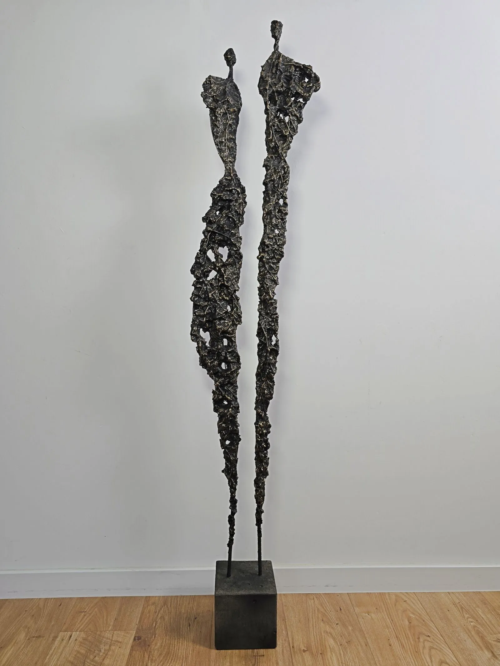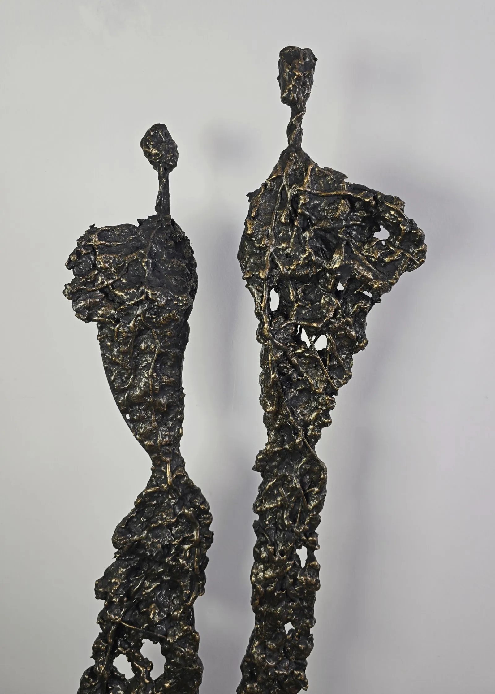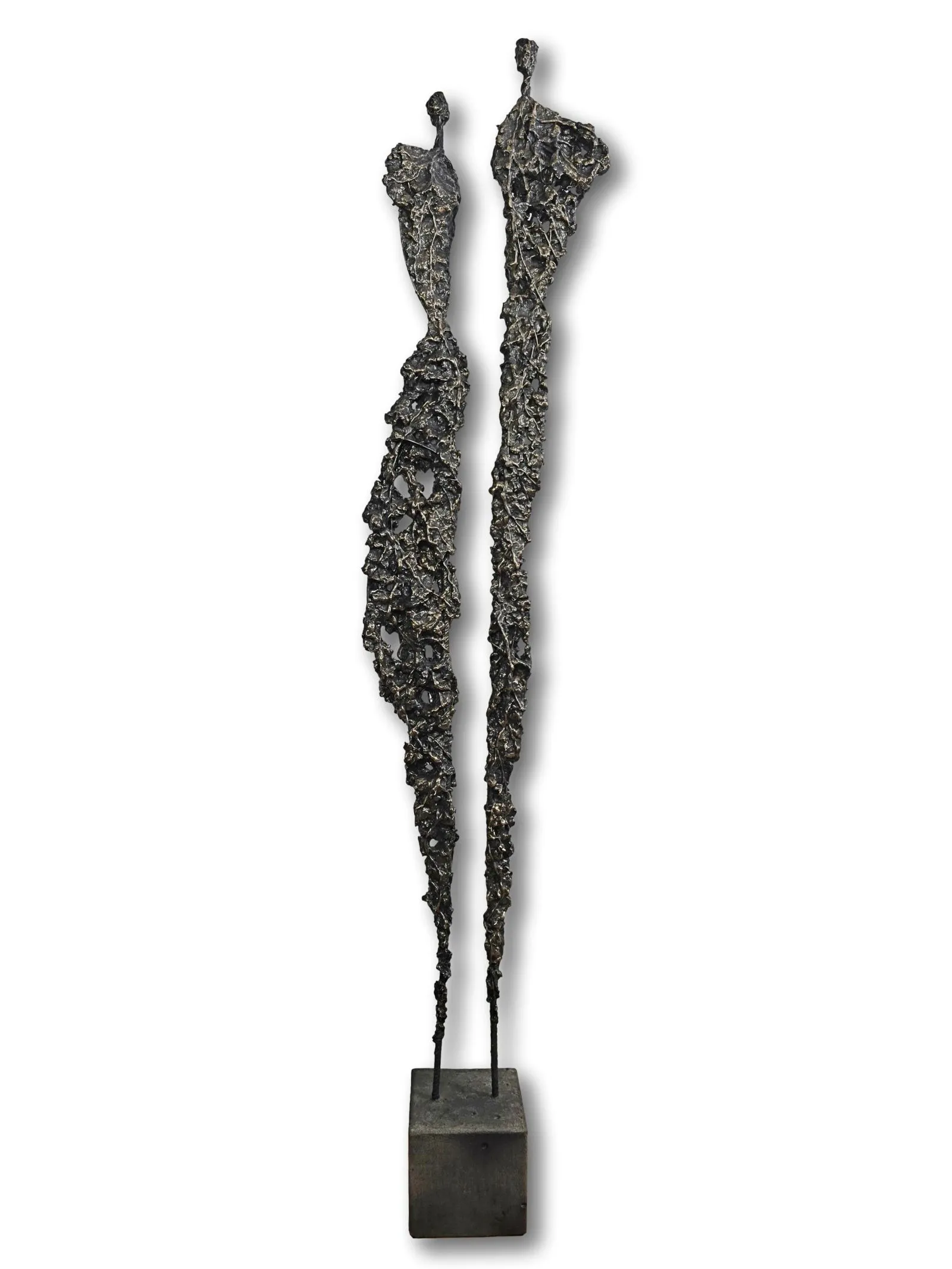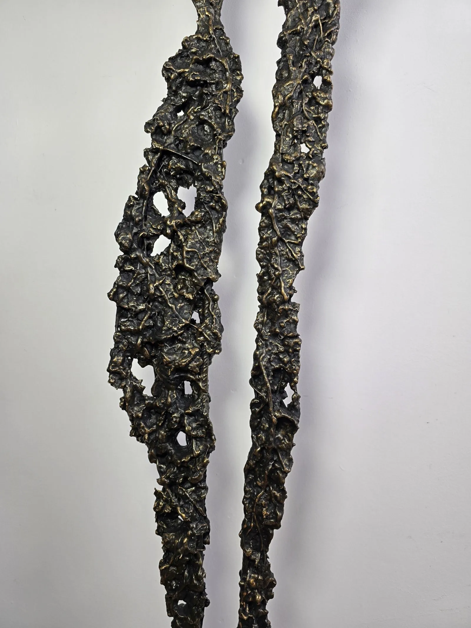 Rzeźba przedstawia wysokie, abstrakcyjne sylwetki, stworzone z metalu i gliny, ukazane z niezwykłą lekkością. Dynamiczne, nieregularne formy sugerują proces tworzenia i destrukcji, nadając dziełu ekspresję ruchu i życia. Metalowe nici tworzą subtelne ażurowe struktury, które kontrastują z solidnym fundamentem, wyrażając harmonię między ulotnością a trwałością. To nowoczesne dzieło młodej sztuki przyciąga swoją poetyką finezją, tworząc intrygującą narrację w przestrzeni domu.